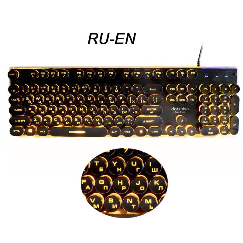 Gaming Russian Keyboard Retro Round Glowing Keycap Metal Panel Backlit Usb Wired Metal Panel Illuminated Border Waterproof