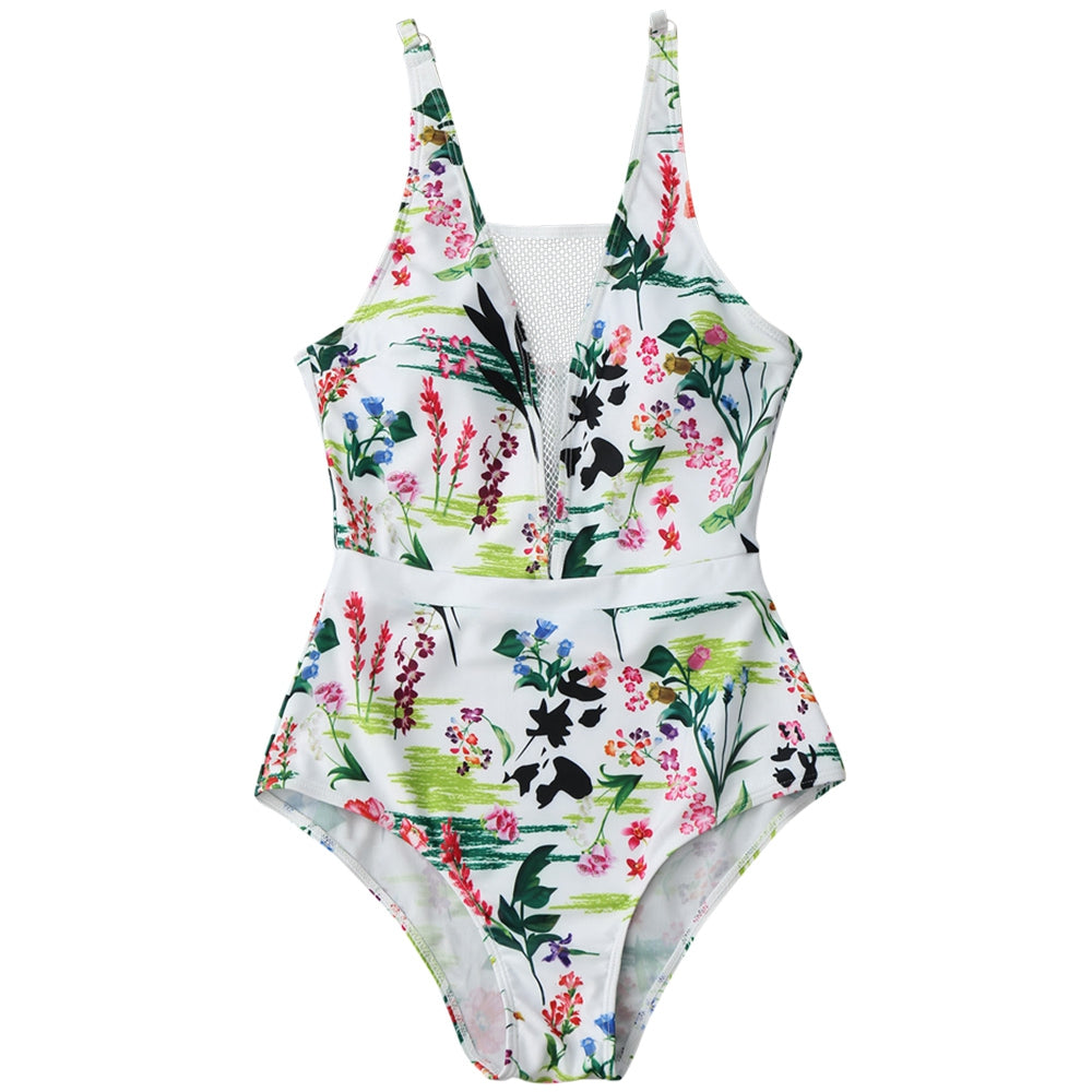 A floral print slim fit one-piece swimwear features sheer mesh illusion plunge front and long torso.padded.