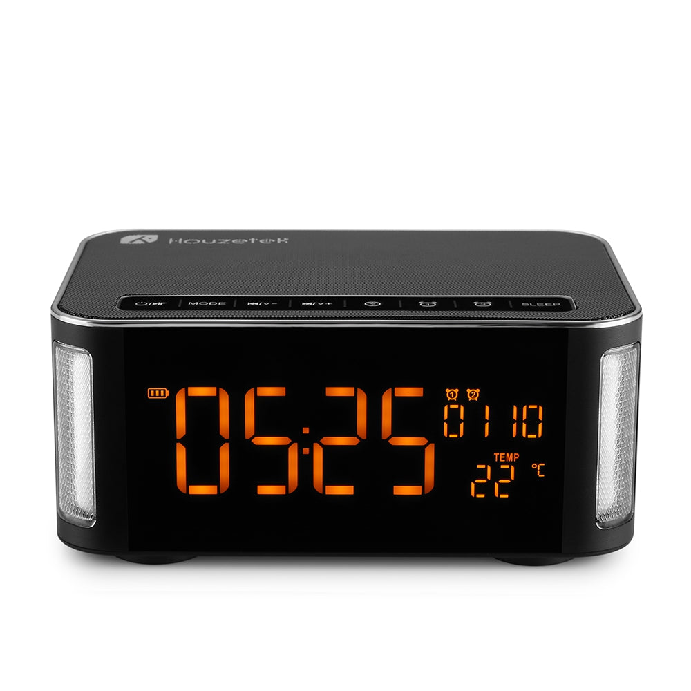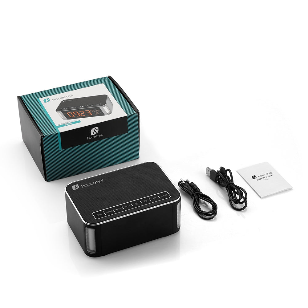 Portable music speaker, alarm clock, thermometer, radio, night light, one device, five functions. Supports Micro SD ( TF card ) / USB drive / 3.5MM audio port output music play, FM band 87.5 - 108MHz FM selection, date and time display, double-play with snooze, choose and set your preferences. Real-time indoor temperature display, with Celsius or Fahrenheit degrees, to keep all weather changes under control. By combining night light and music play function, you can enjoy music at night and create the right light atmosphere.