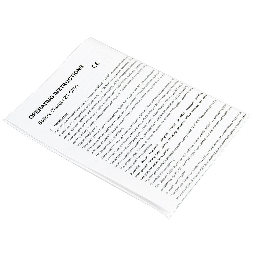 The product is intended to charge and discharge NiCd or NiMH rechargeable batteries. It provides four independent charging slots for AA / AAA rechargeable batteries. The charger can also optimize and test the maximum capacity of the rechargeable batteries. Each charging slot has its own display to show various information, such as charging current, battery voltage, charged capacity, battery internal resistance and elapsed charging time.