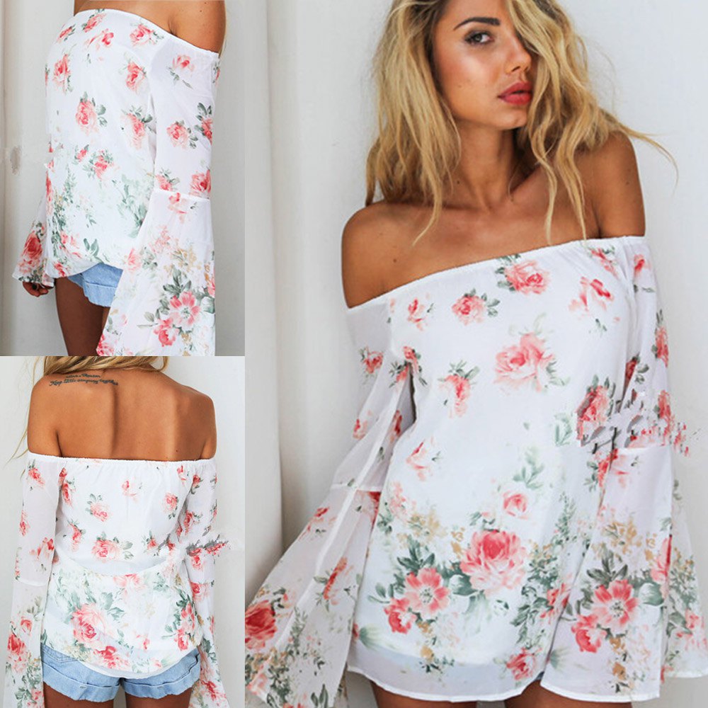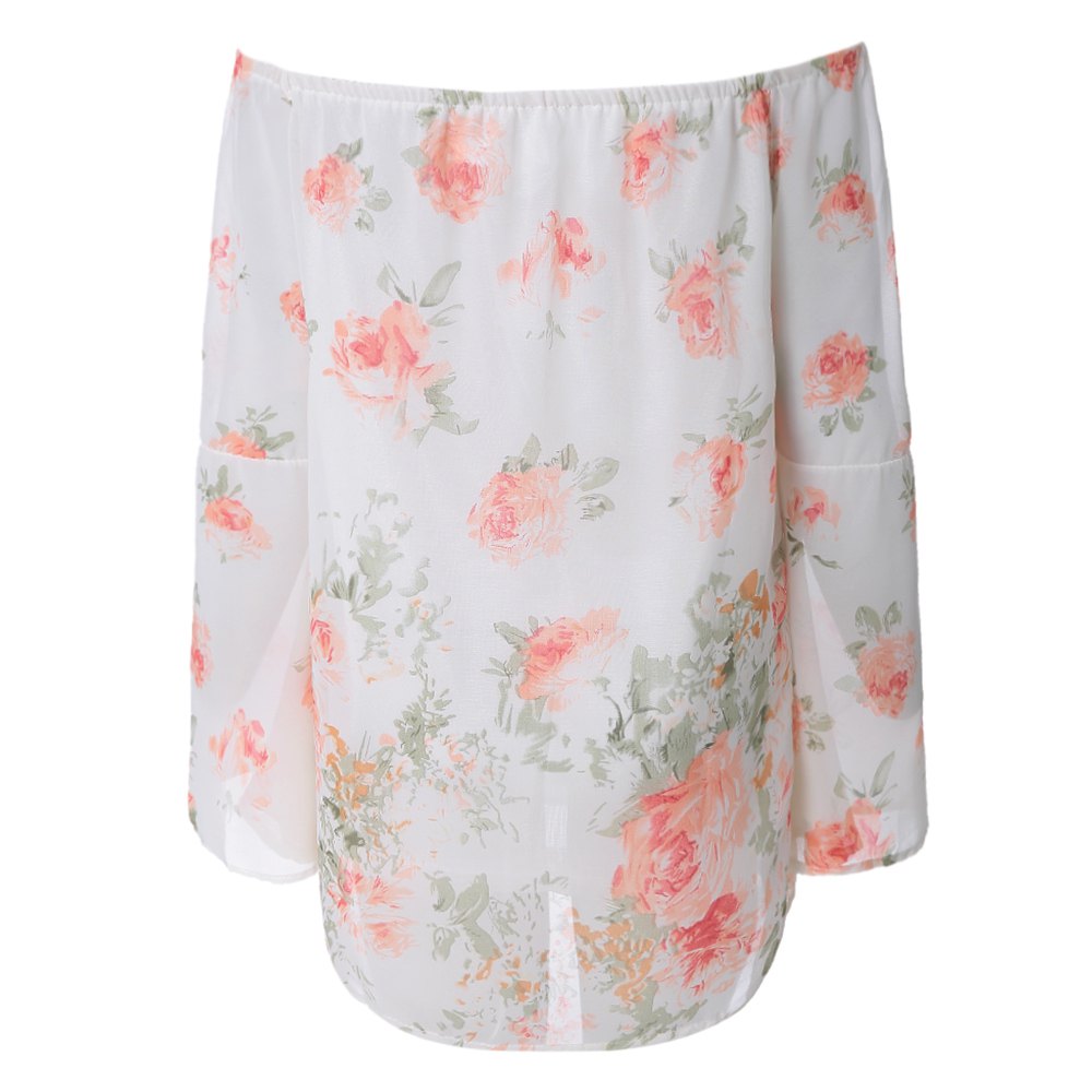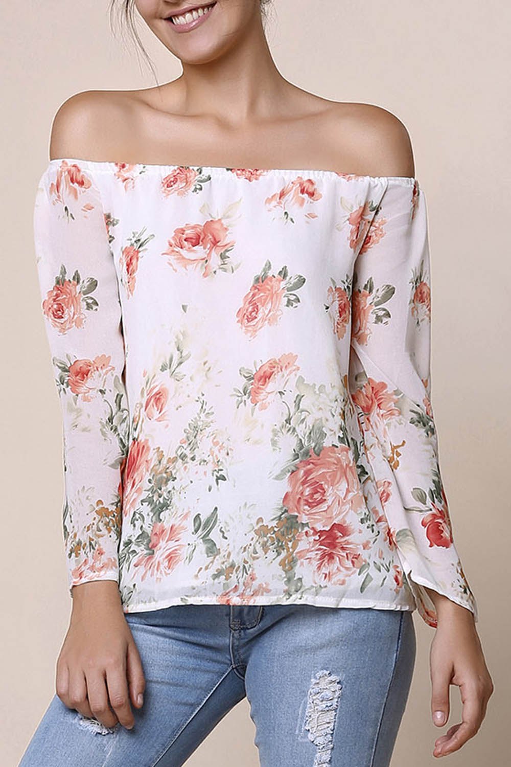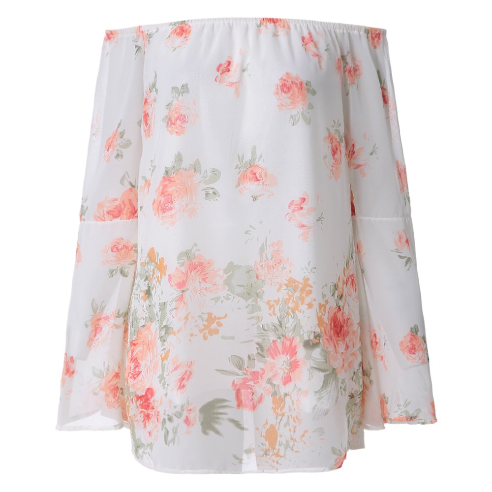 Stylish Off-The-Shoulder Long Sleeve Floral Print Chiffon Women's Blouse