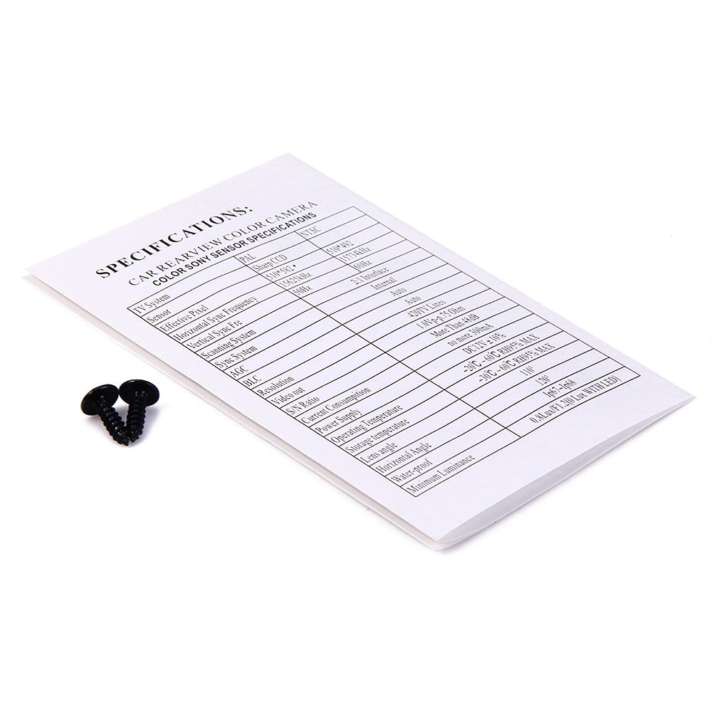 Package Contents: 1 x Car Rear View Camera, 1 x 5.5m TV Cable, 1 x Power Line, 2 x Screw, 1 x English User Manual