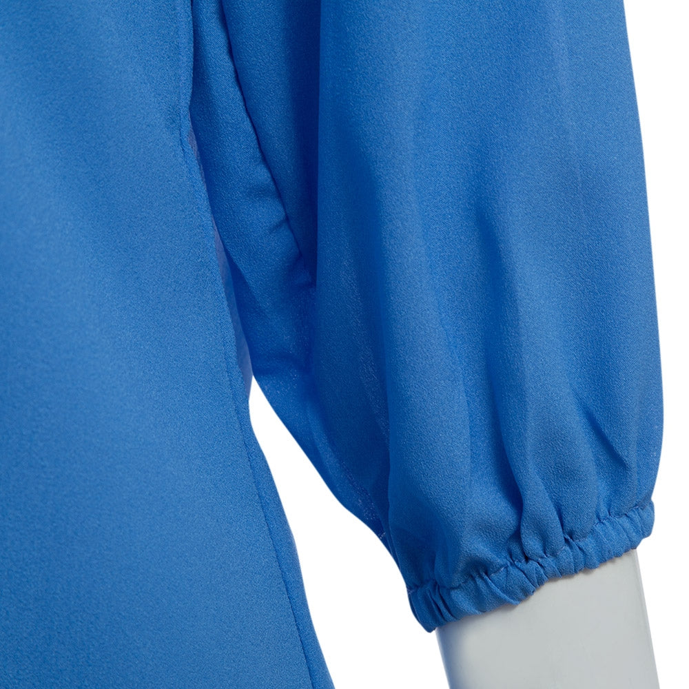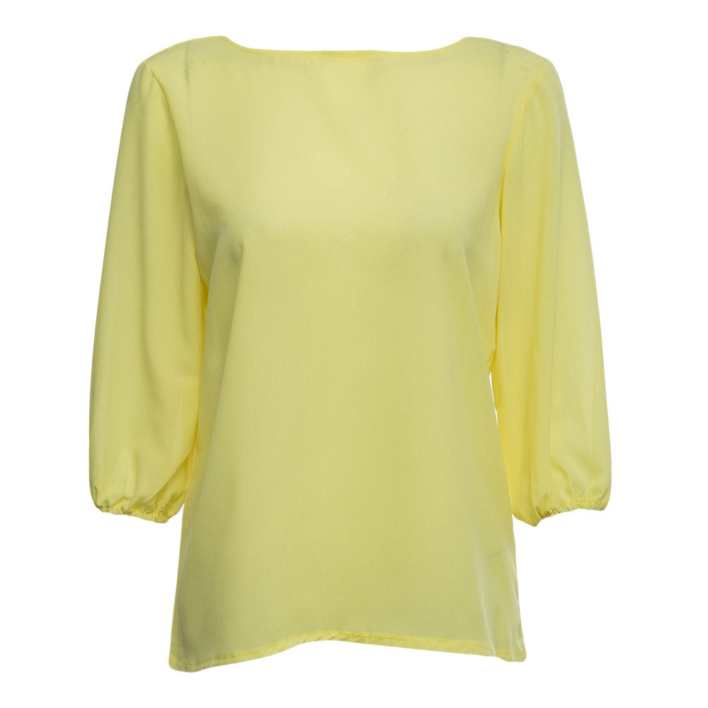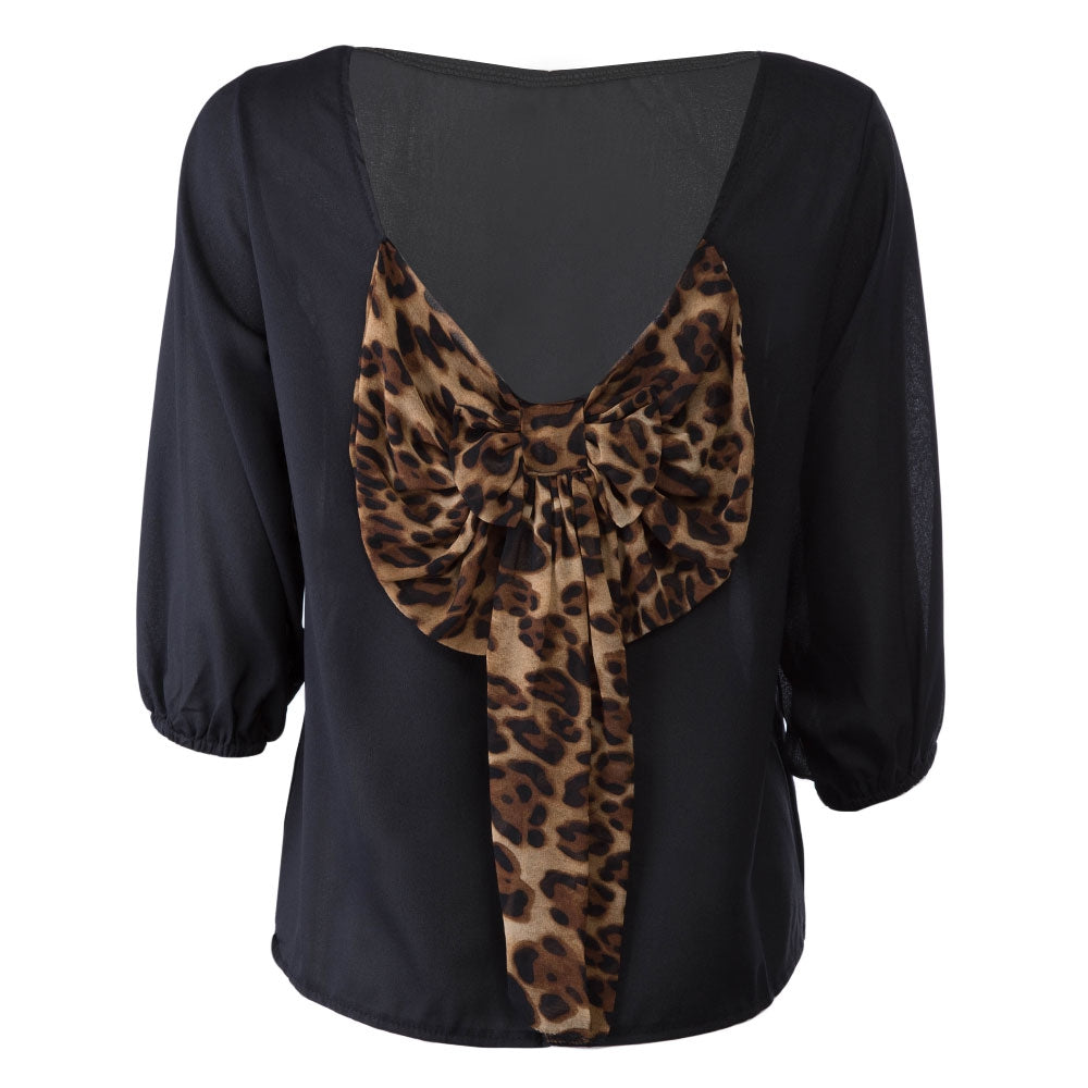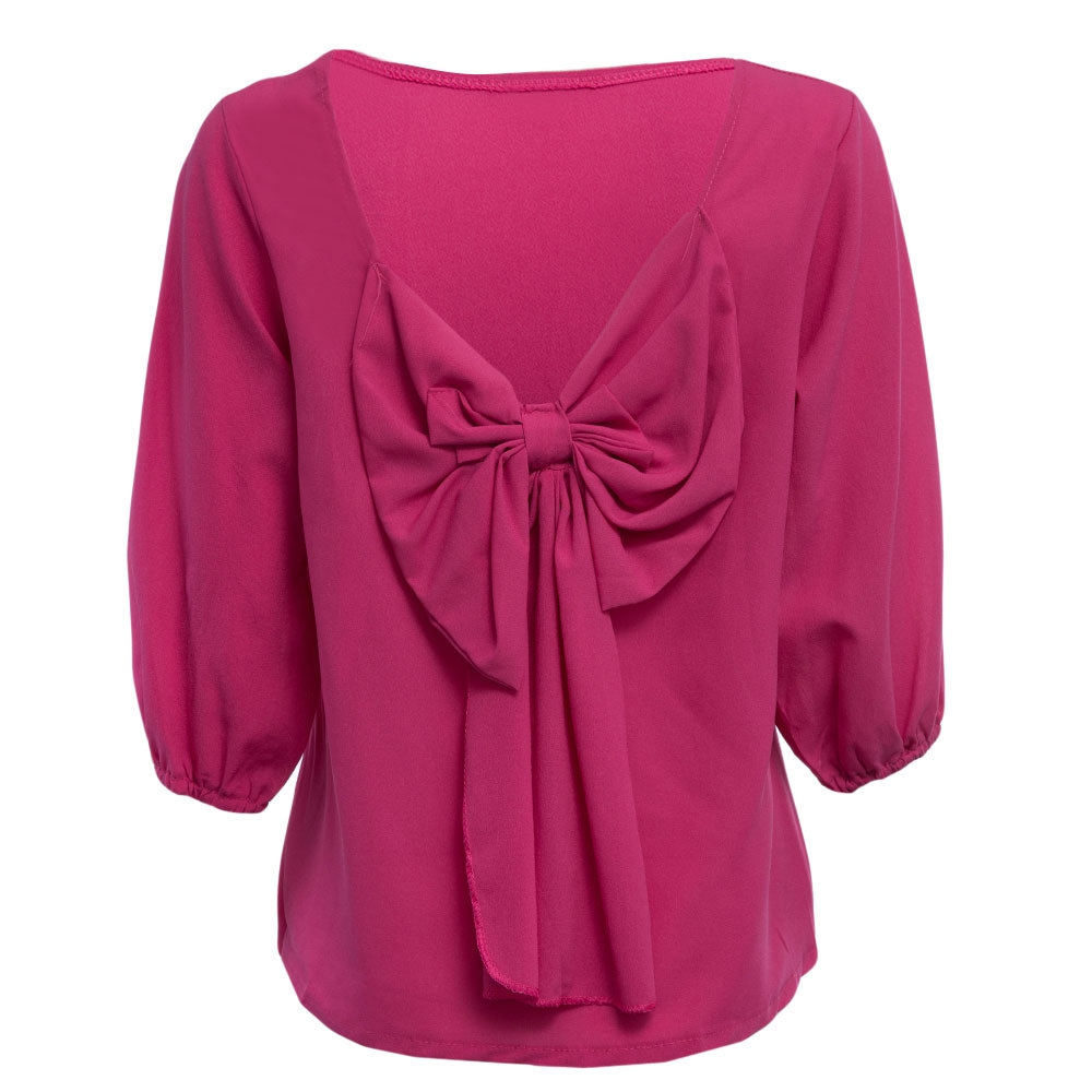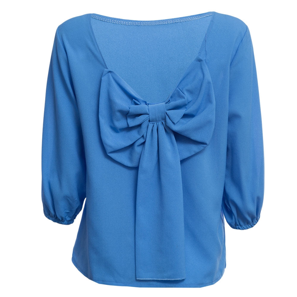 Stylish Round Collar Three Quarter Sleeve Back Bowtie Patchwork Loose Pure Color Blouse for Women