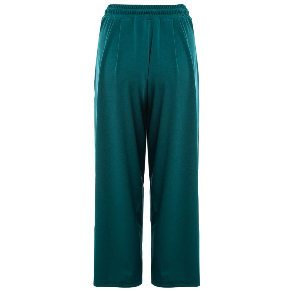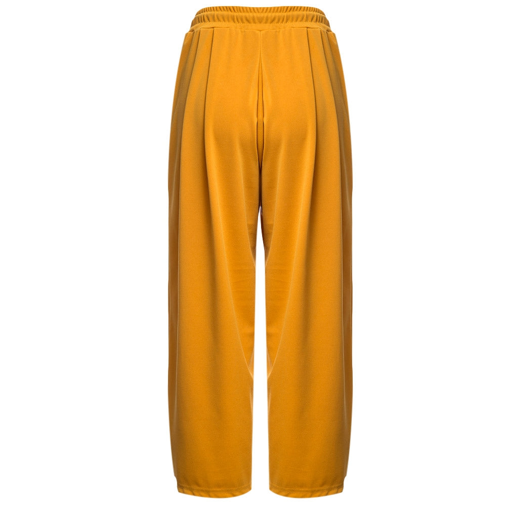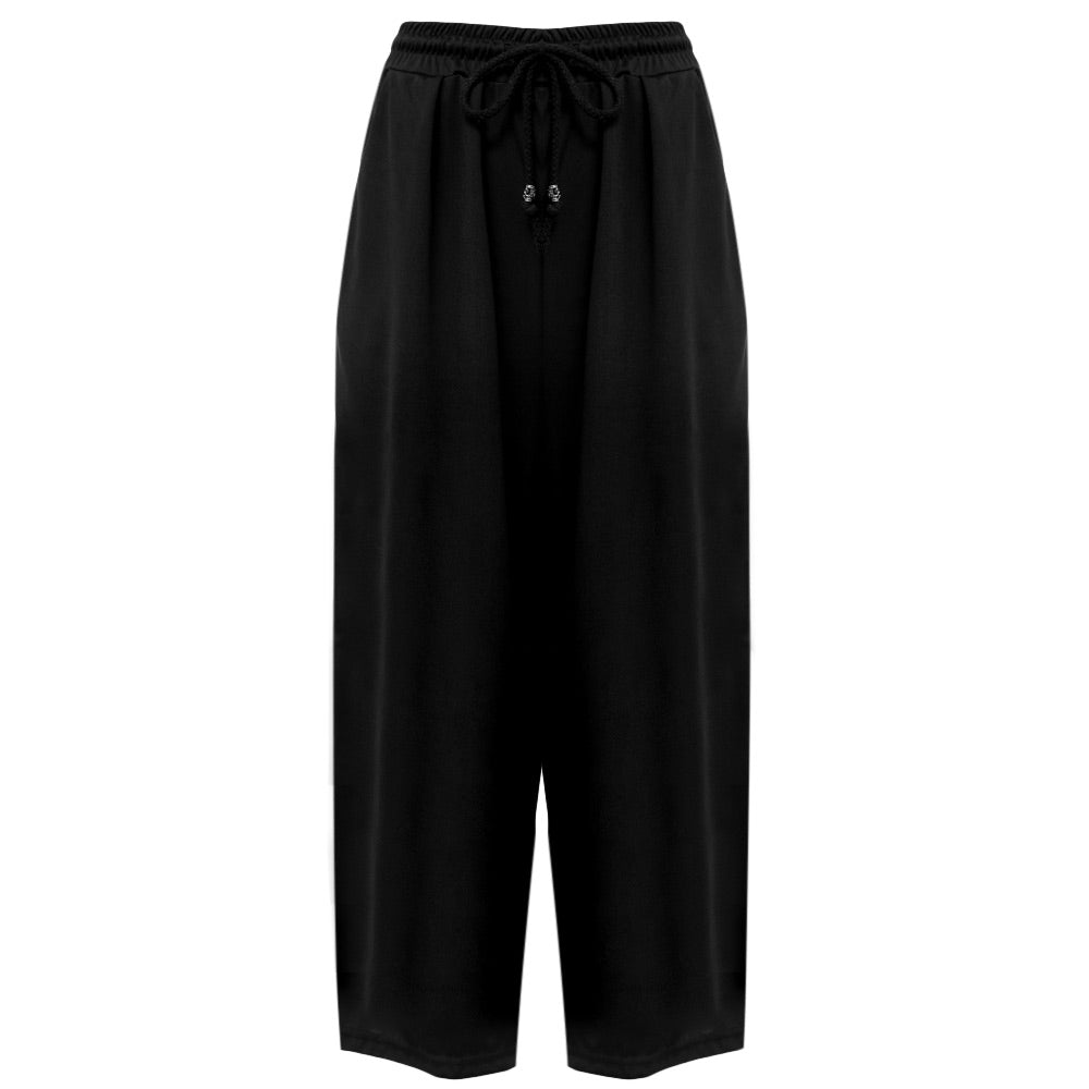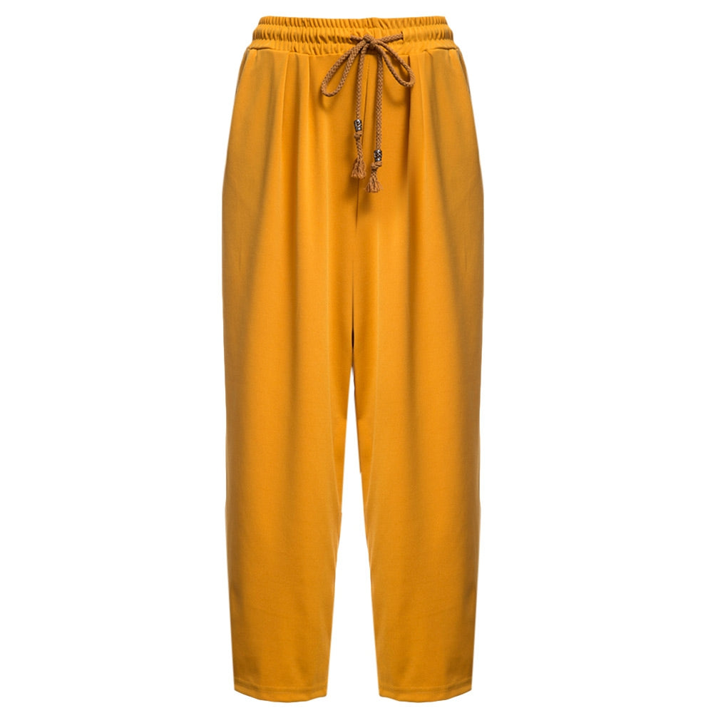 Casual Elastic Waist Drawstring with Pocket Wide-leg Solid Color Ninth Pants for Women