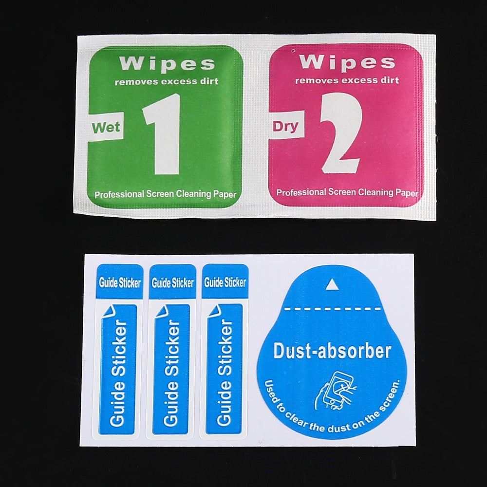 Package Contents: 1 x Tempered Glass Screen Film, 2 x Wipes, 1 x Dust-absorber