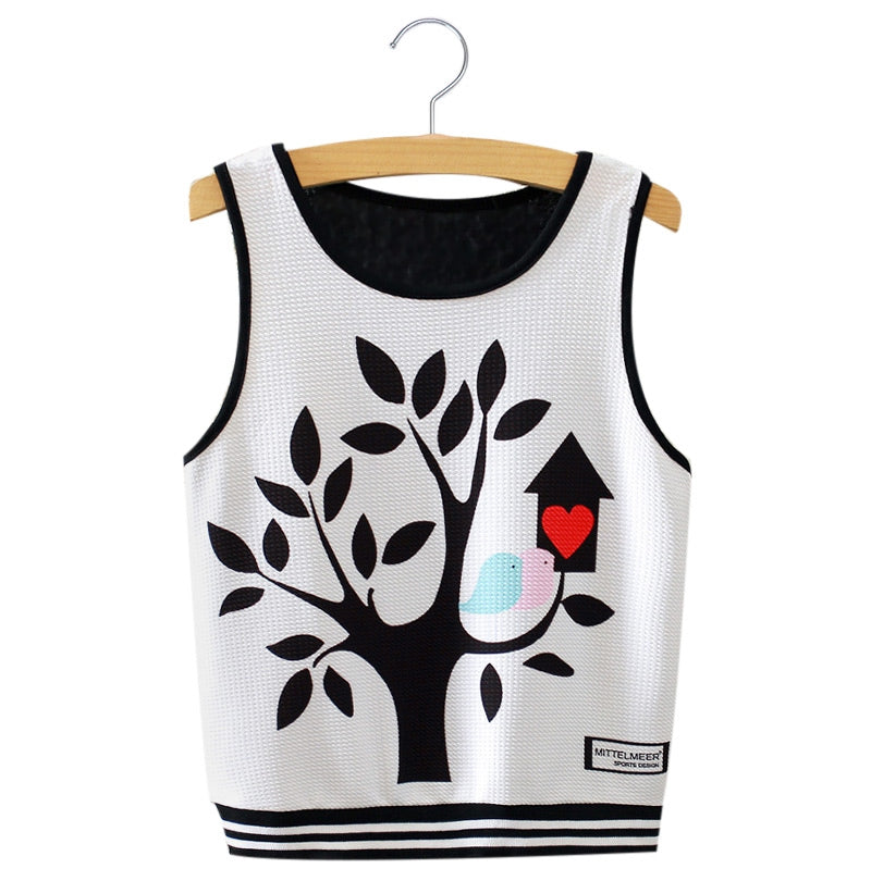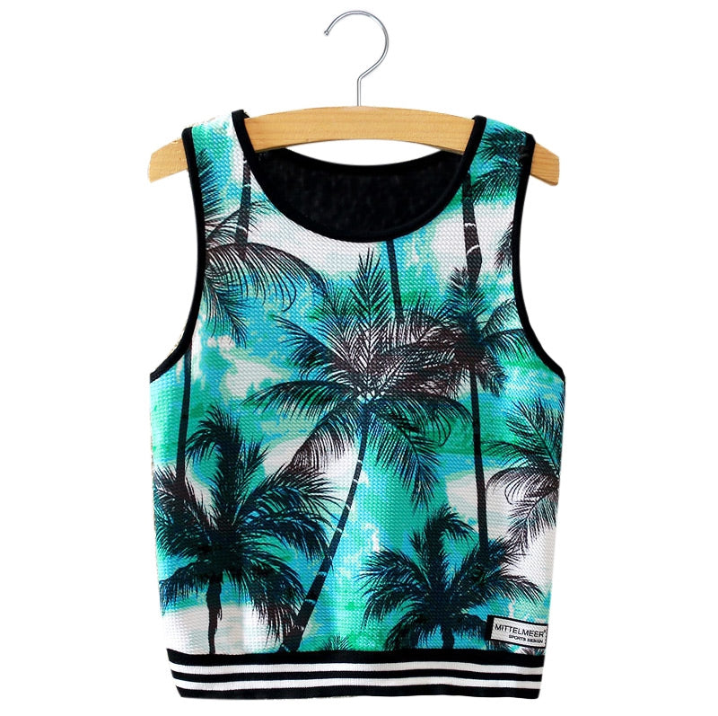 Trendy Round Collar Seeleless Print Slim Tank Top for Women