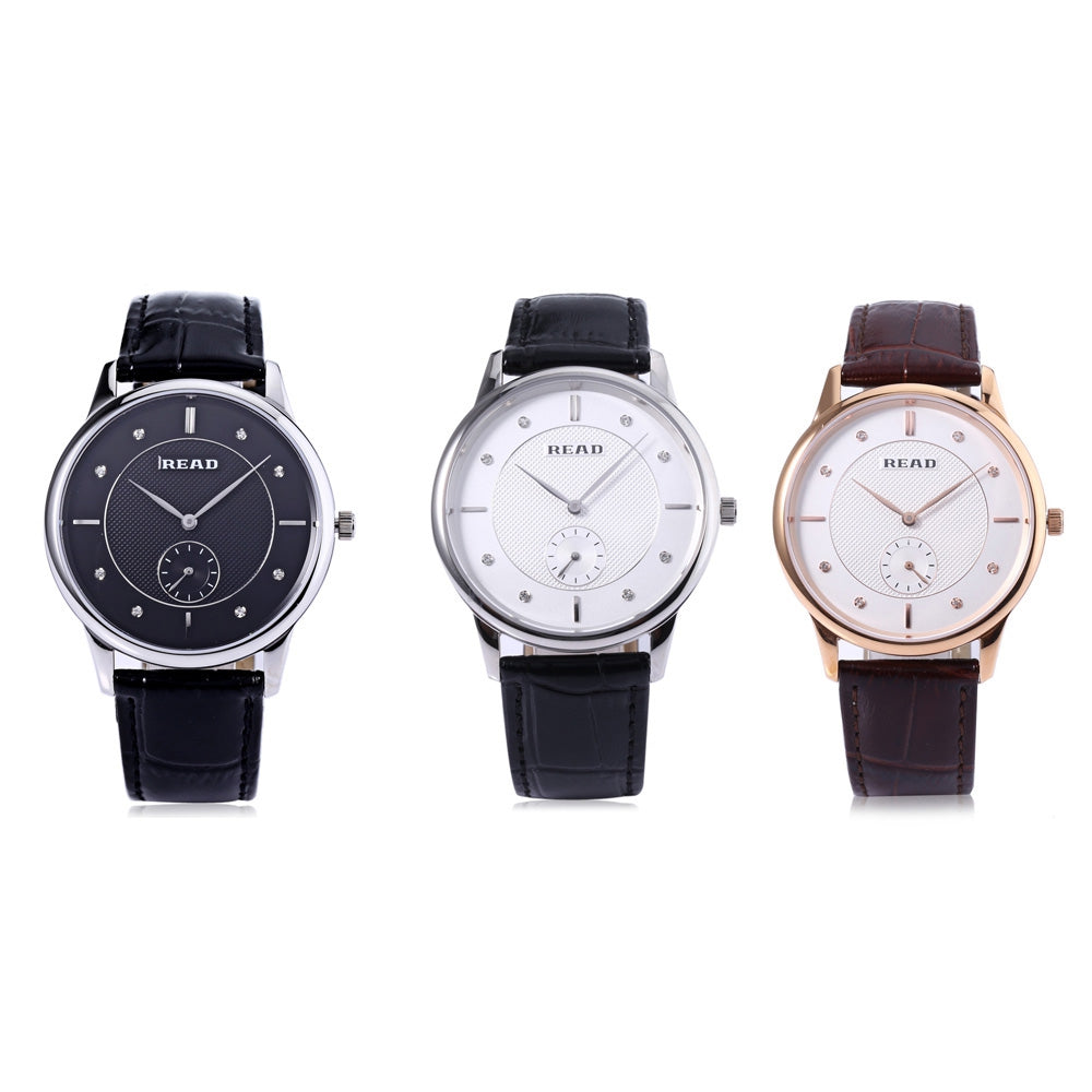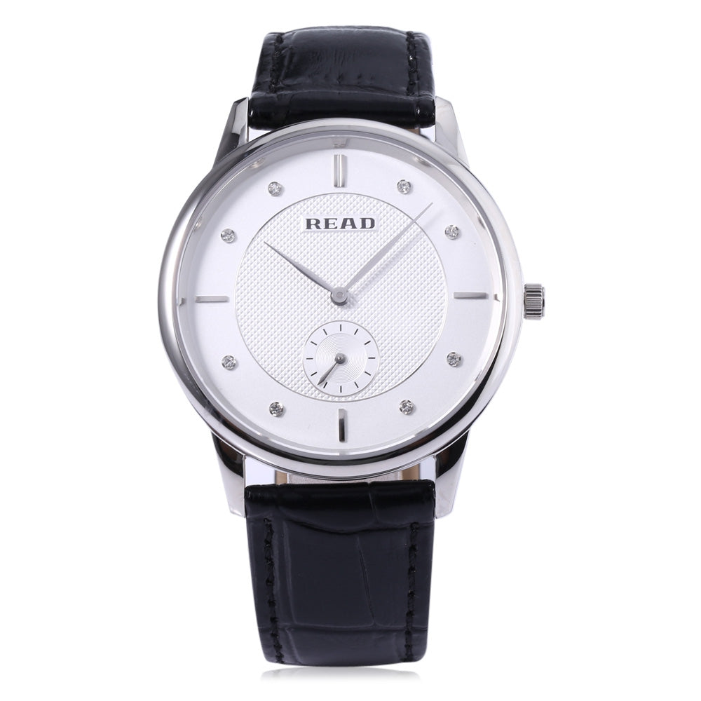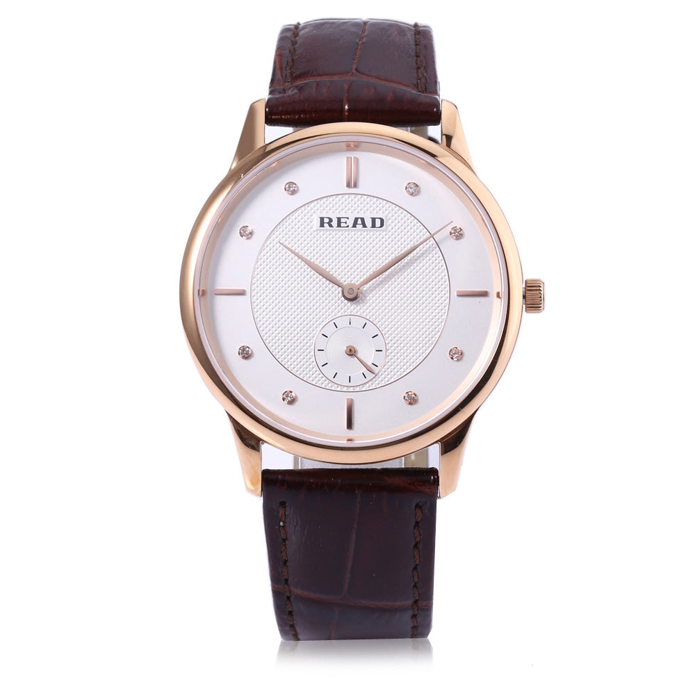 This READ R6025G Men Quartz Watch is not only an ideal accessory for men looking for a timepiece that is both handsome and functional but a perfect choice for girls who want to send a nice gift for their boyfriends. Sparkling artificial diamonds embedded on the wonderful dial not only make this watch stand out of the crowd but reveal your excellent taste. The mirror of the watch is made of durable sapphire glass to withstand nicks and dents, the band is made of genuine leather, comfortable to touch and durable in use. Moreover, it comes with a mini sub-dial displaying the second hand, you can use it as the stopwatch if you need.