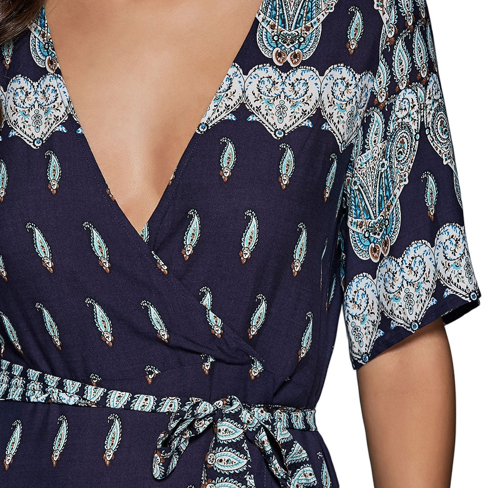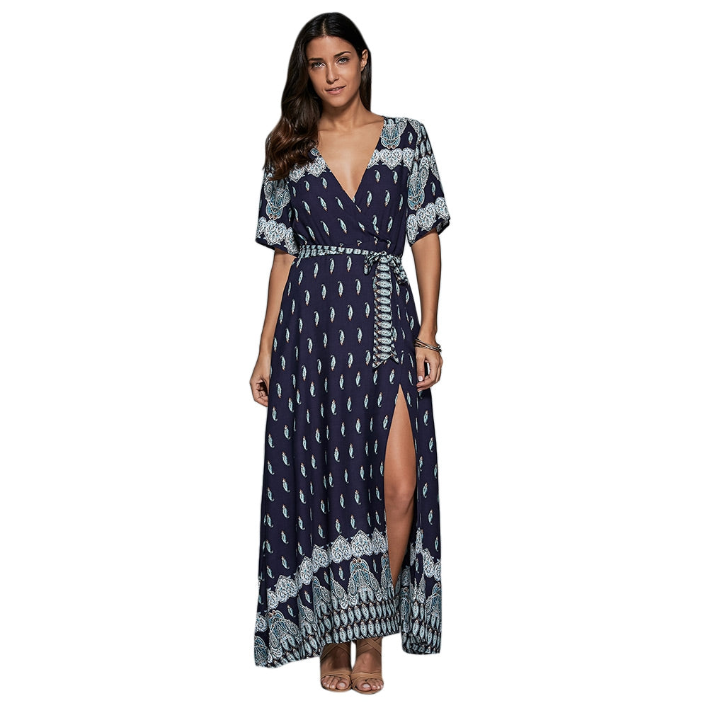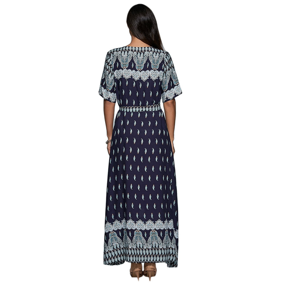 Lightweight flowy maxi dress rendered in ethnic paisley print throughout. Featuring a plunging V surplice neckline and thigh-high slit. Tie belt.