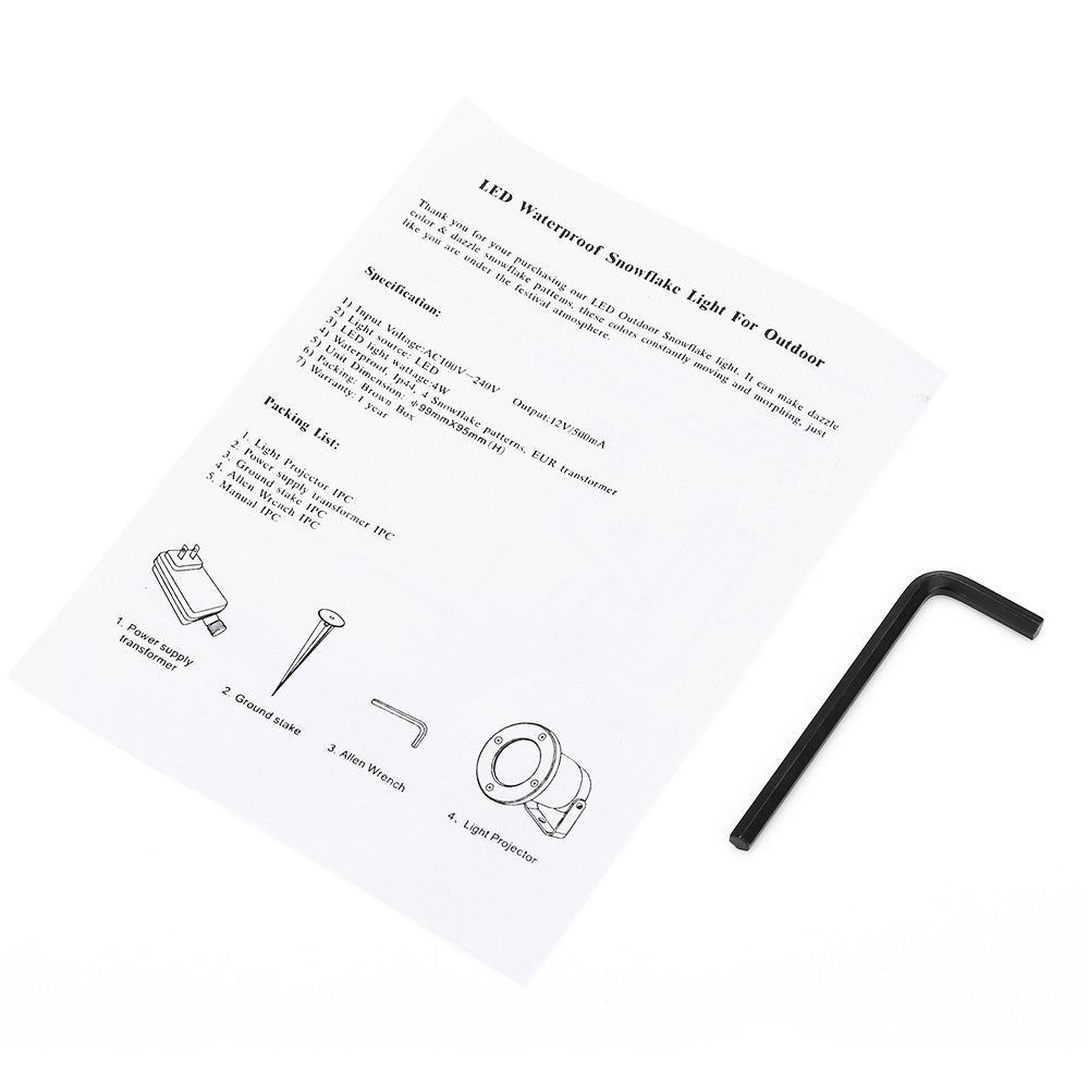 Package Contents: 1 x LED Snowflake Light, 1 x Ground Stake, 1 x Allen Wrench, 1 x Plug, 1 x English User Manual