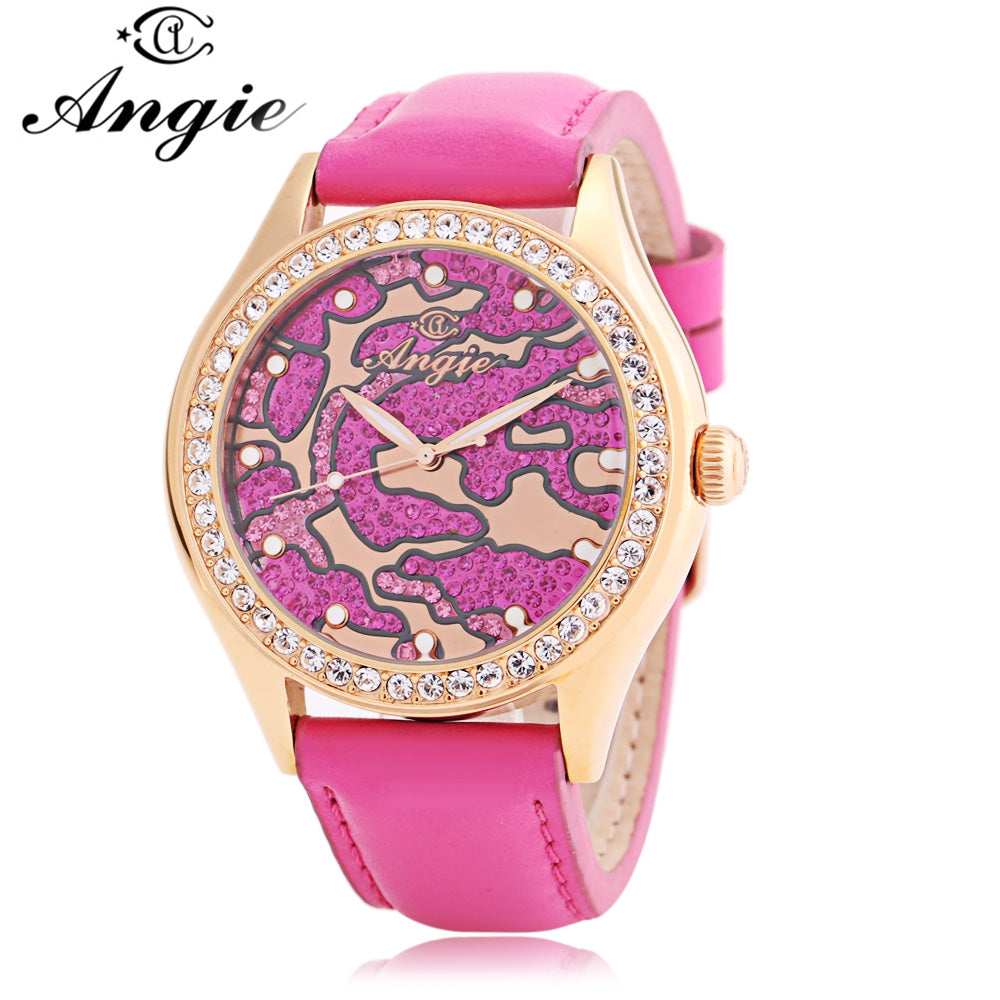 Angie ST710904 Women Quartz Watch 3ATM Luminous Genuine Leather Strap Rhinestone Dial Wristwatch