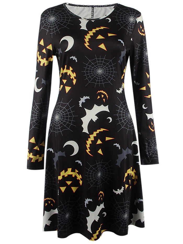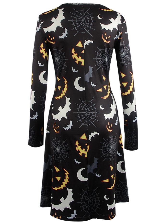 Bat Print Long Sleeve Mini Halloween Swing Dress