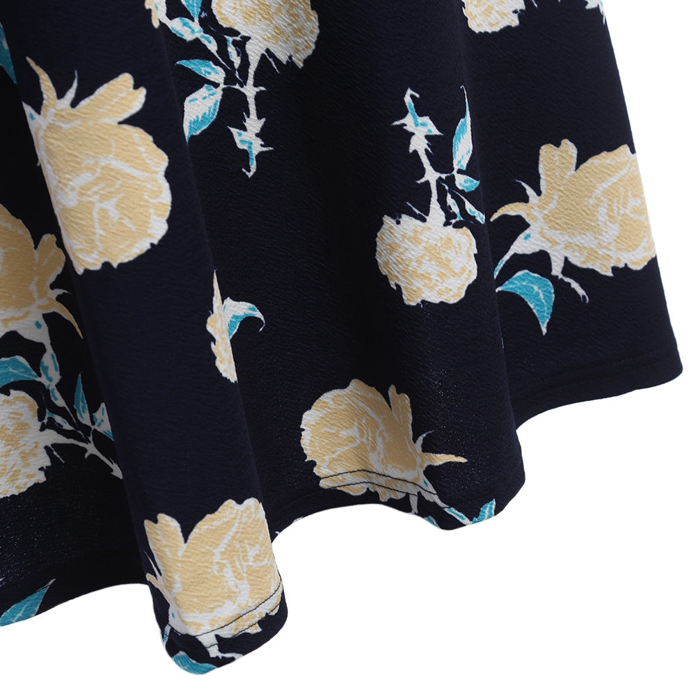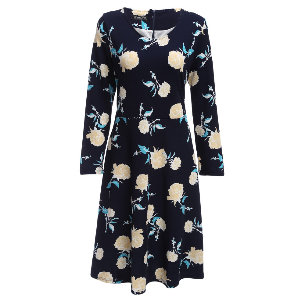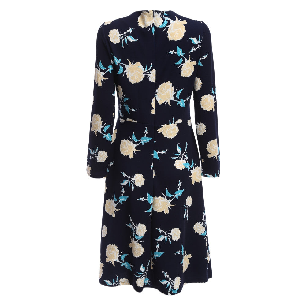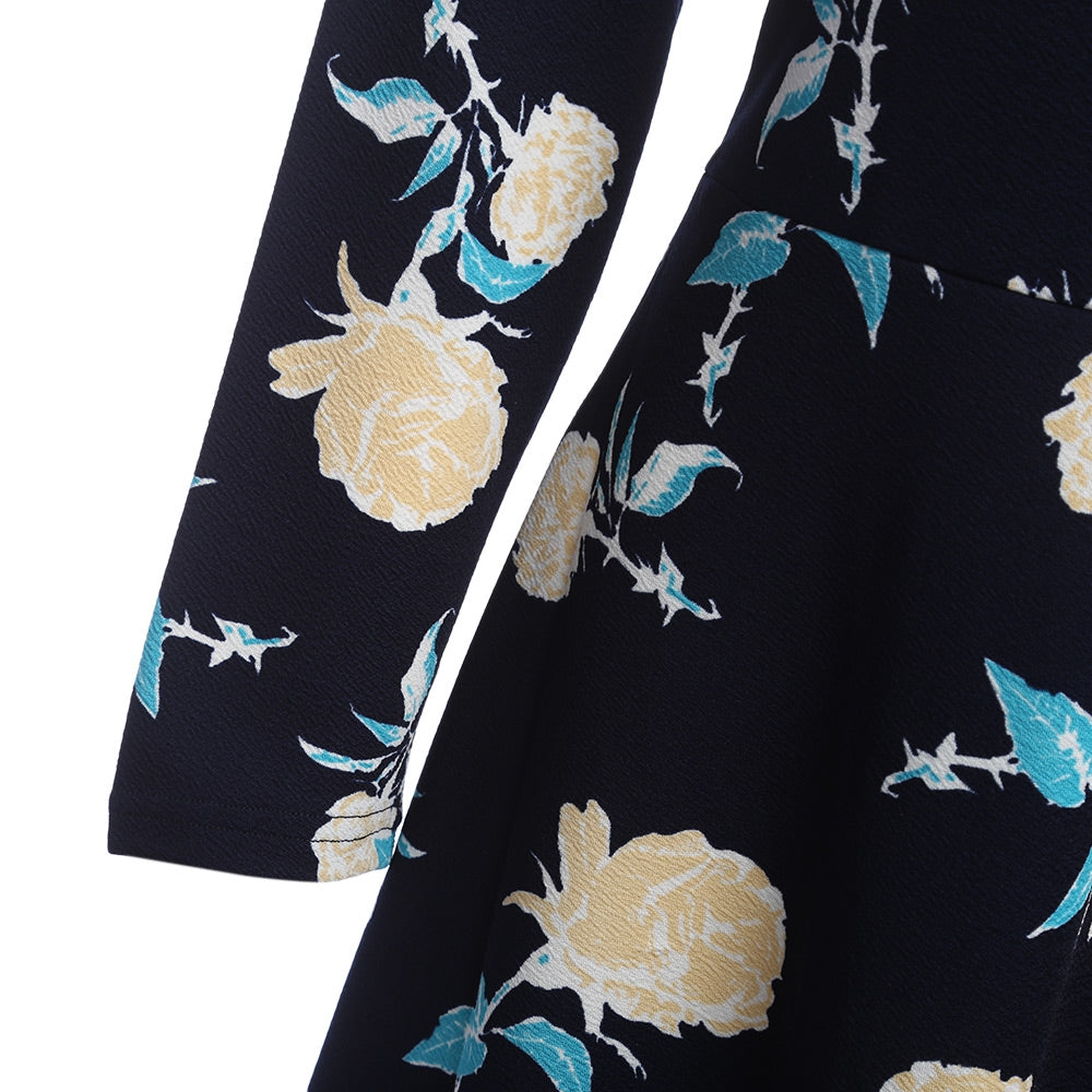 Elegant Round Collar Long Sleeve Allover Floral Print Waist Sheath Dress for Ladies