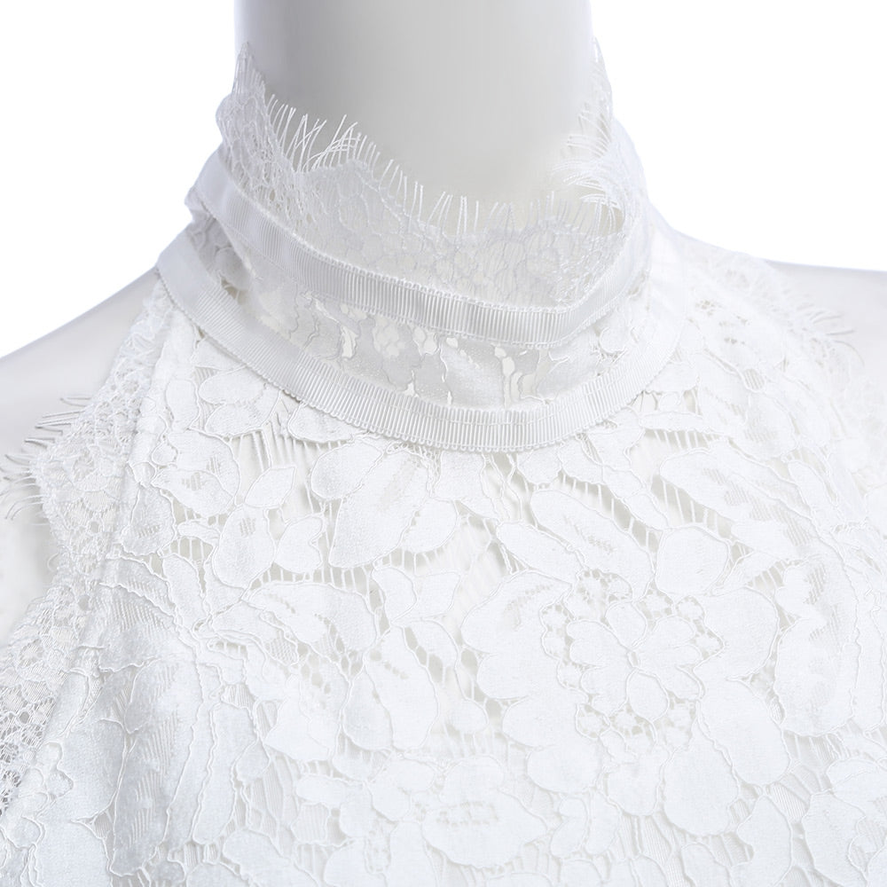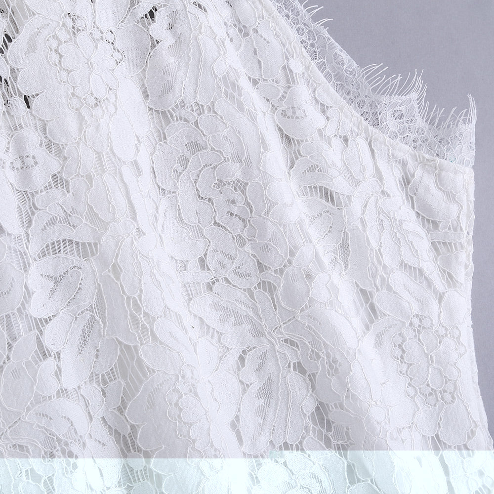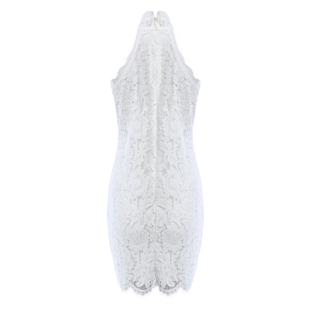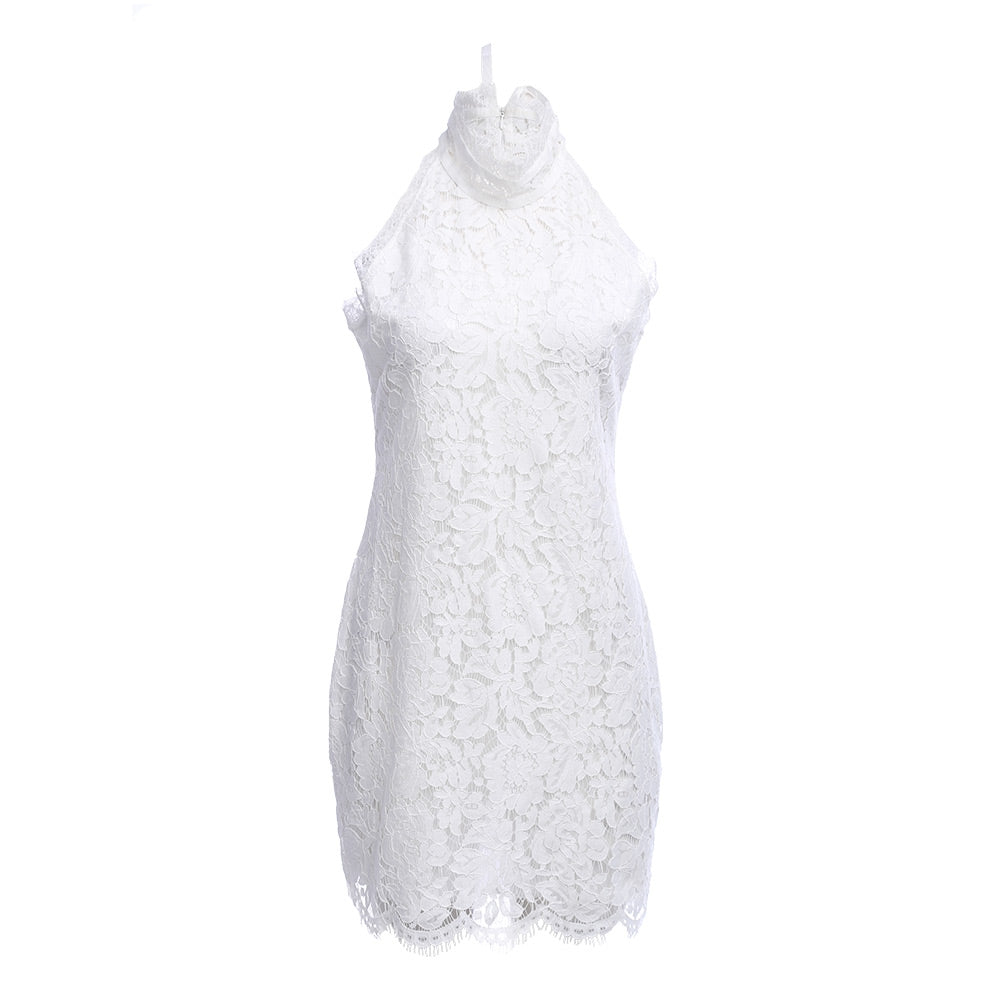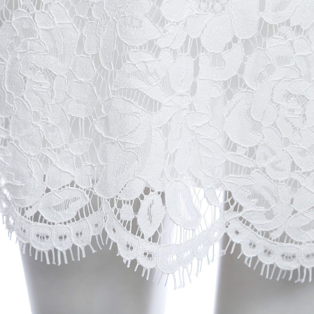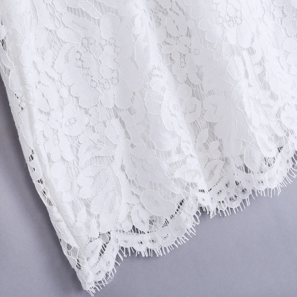 The white lace elegantly creates a feminine slim silhouette of this stunning dress, with a stand collar and scalloped hem. The elaborate lace pattern on this dress shows a sense of elegance, and hollow out design adds a sexy element.