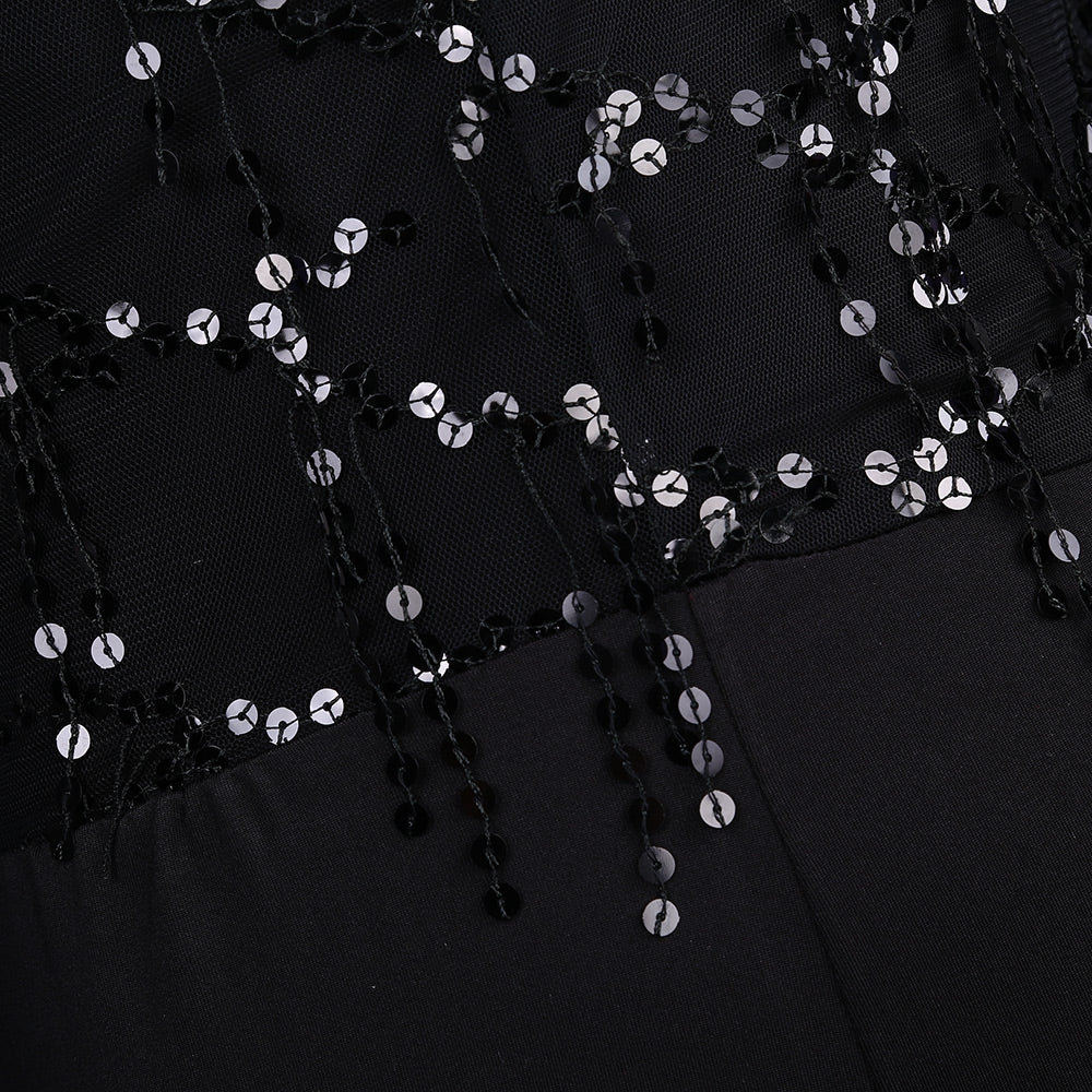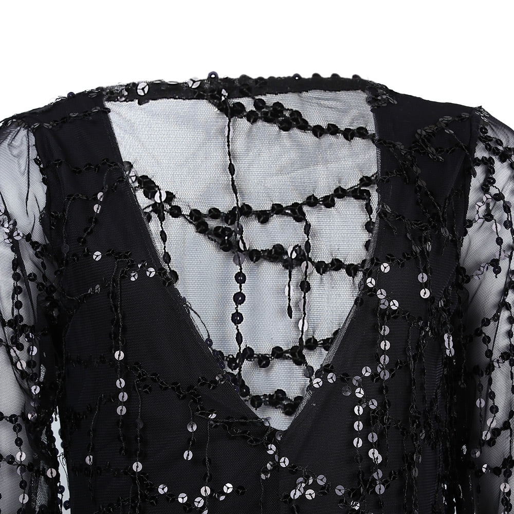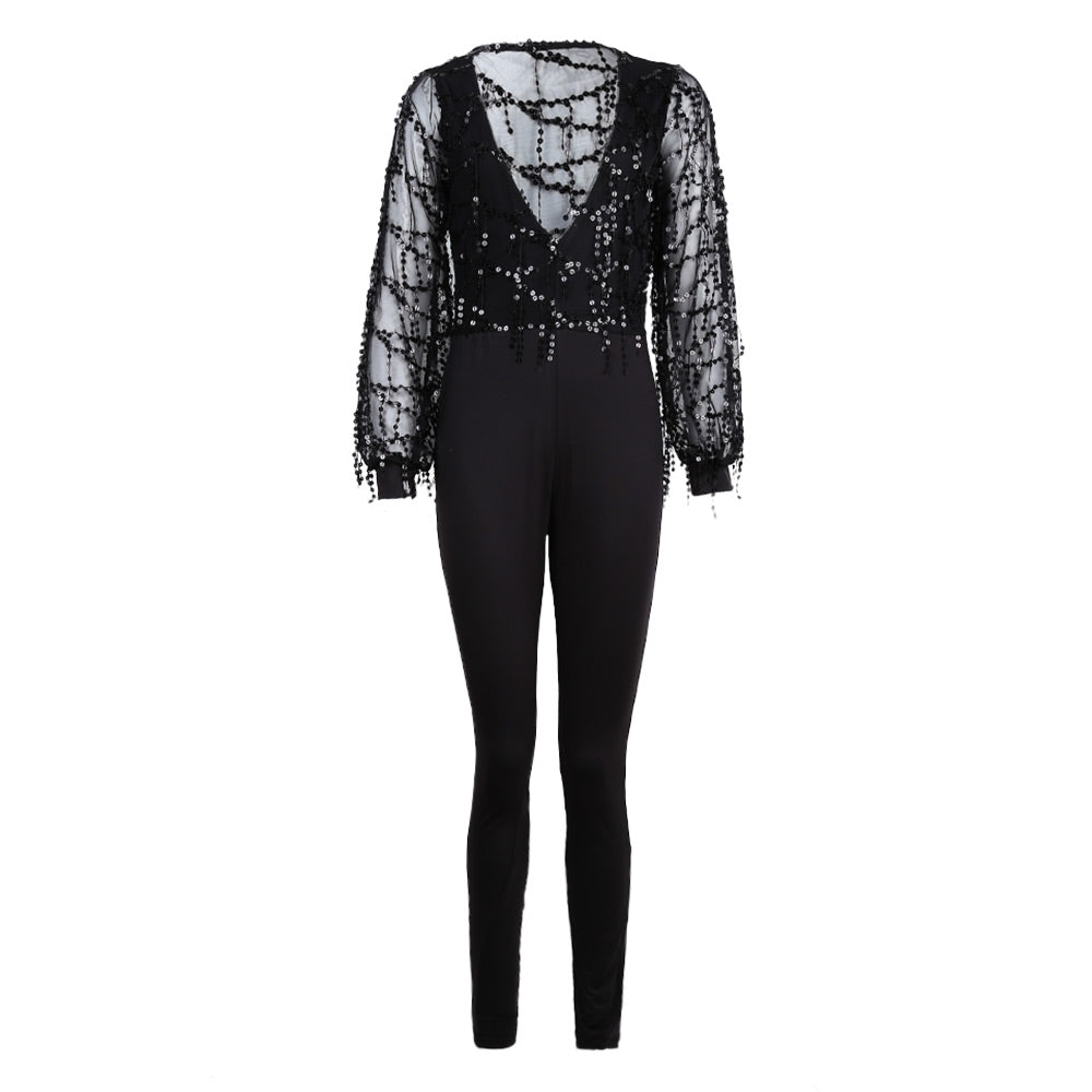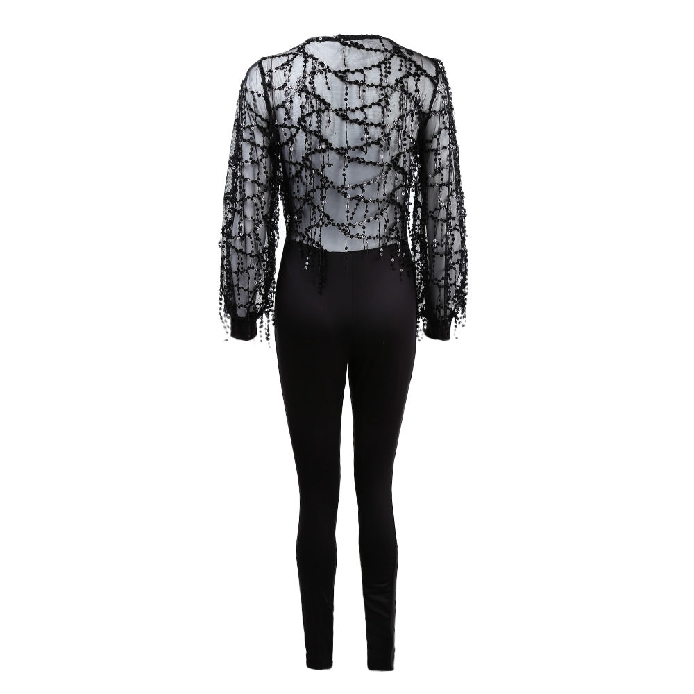 Sexy Mesh V-neck Tassel Jumpsuit with Paillettes