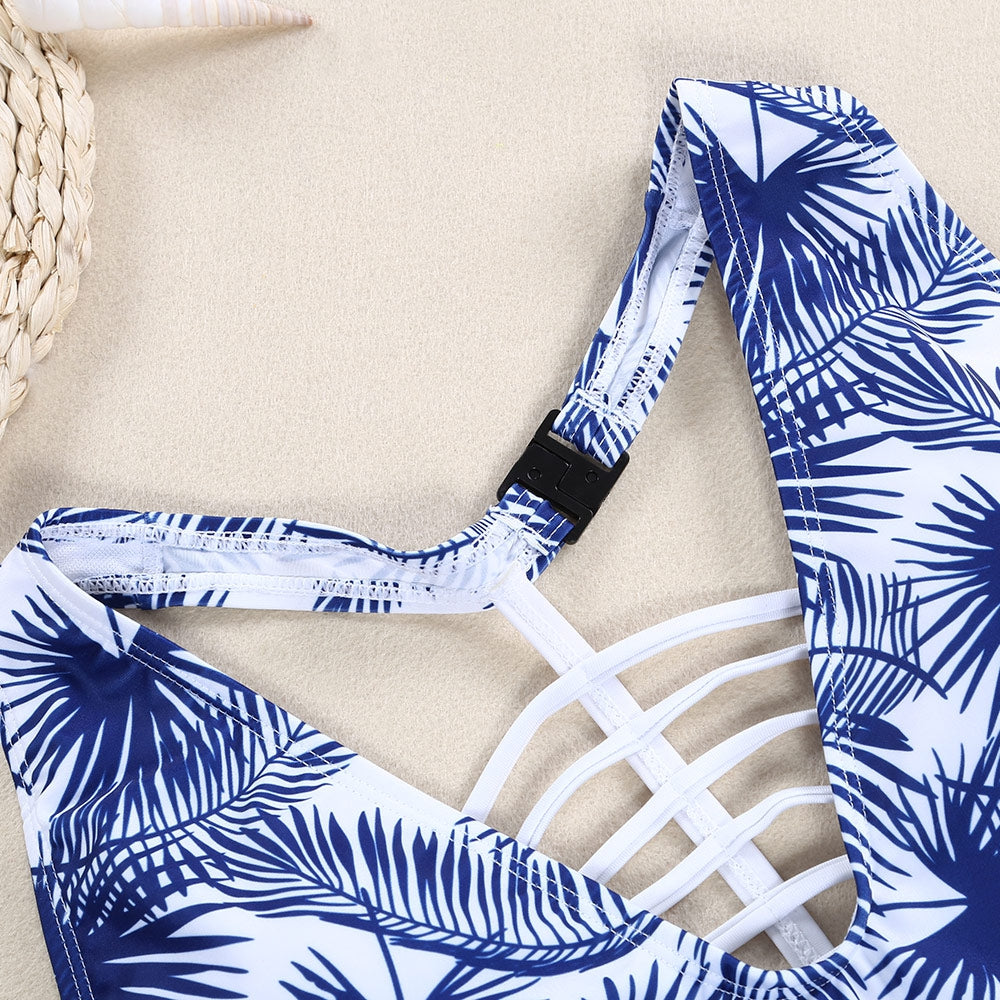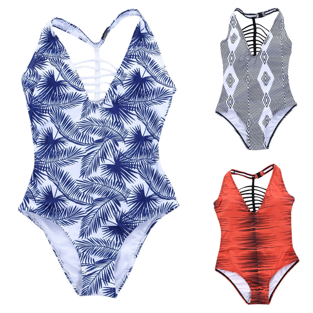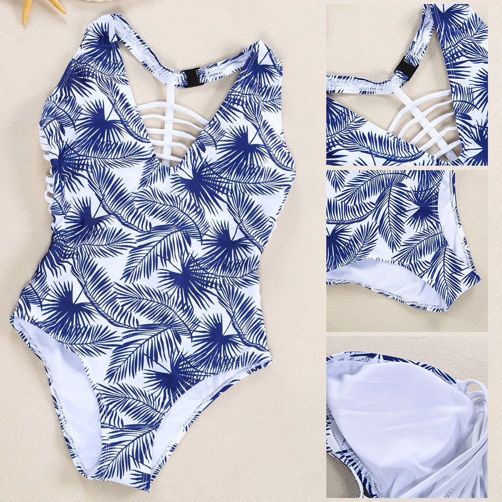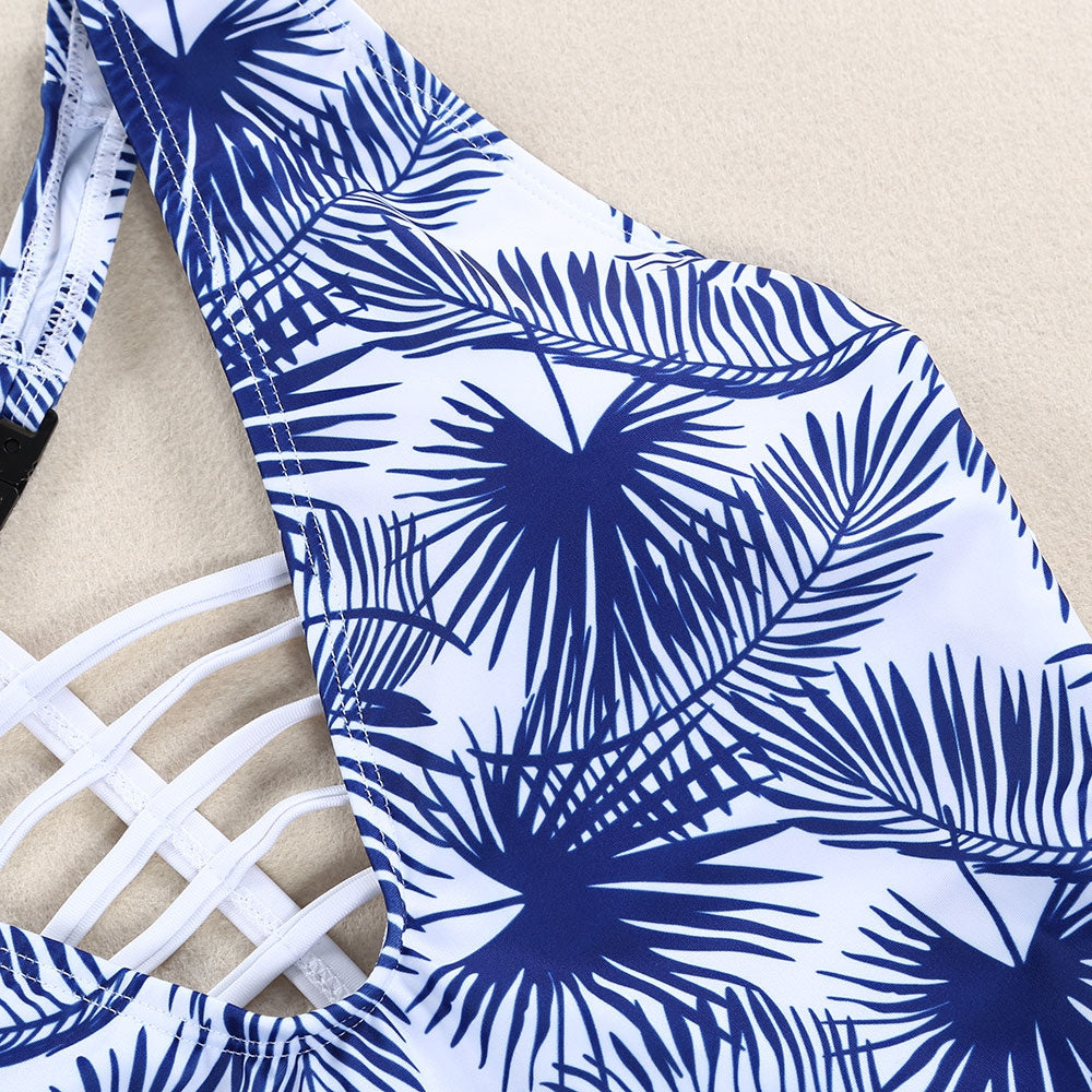 Sexy V Neck Hollow Out Strap Pad Print Women Swimsuit