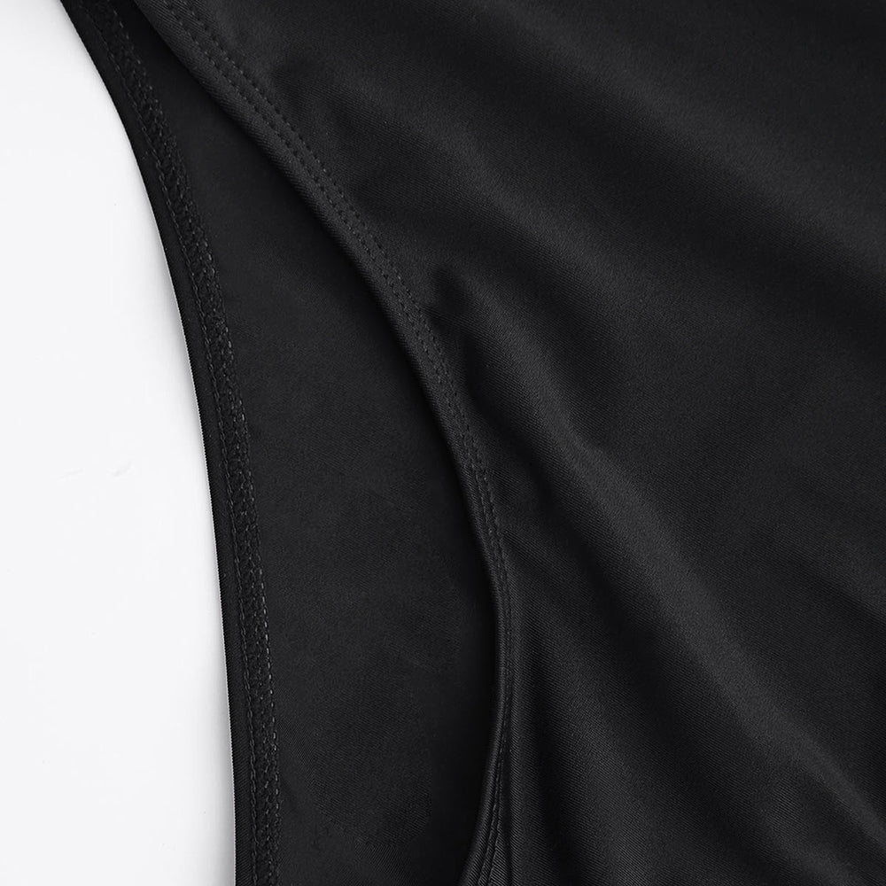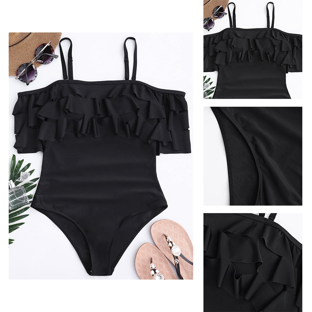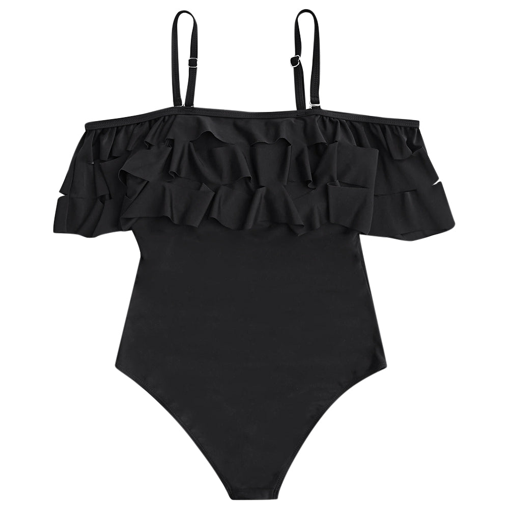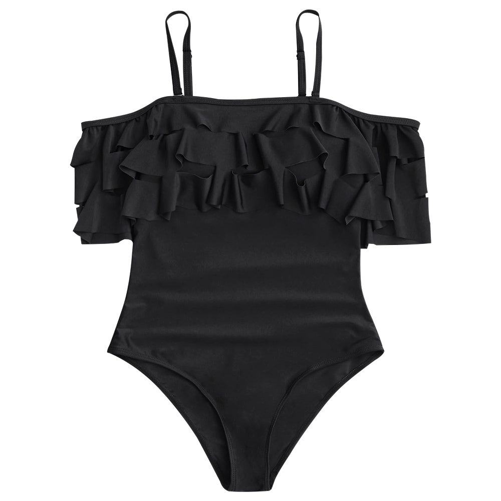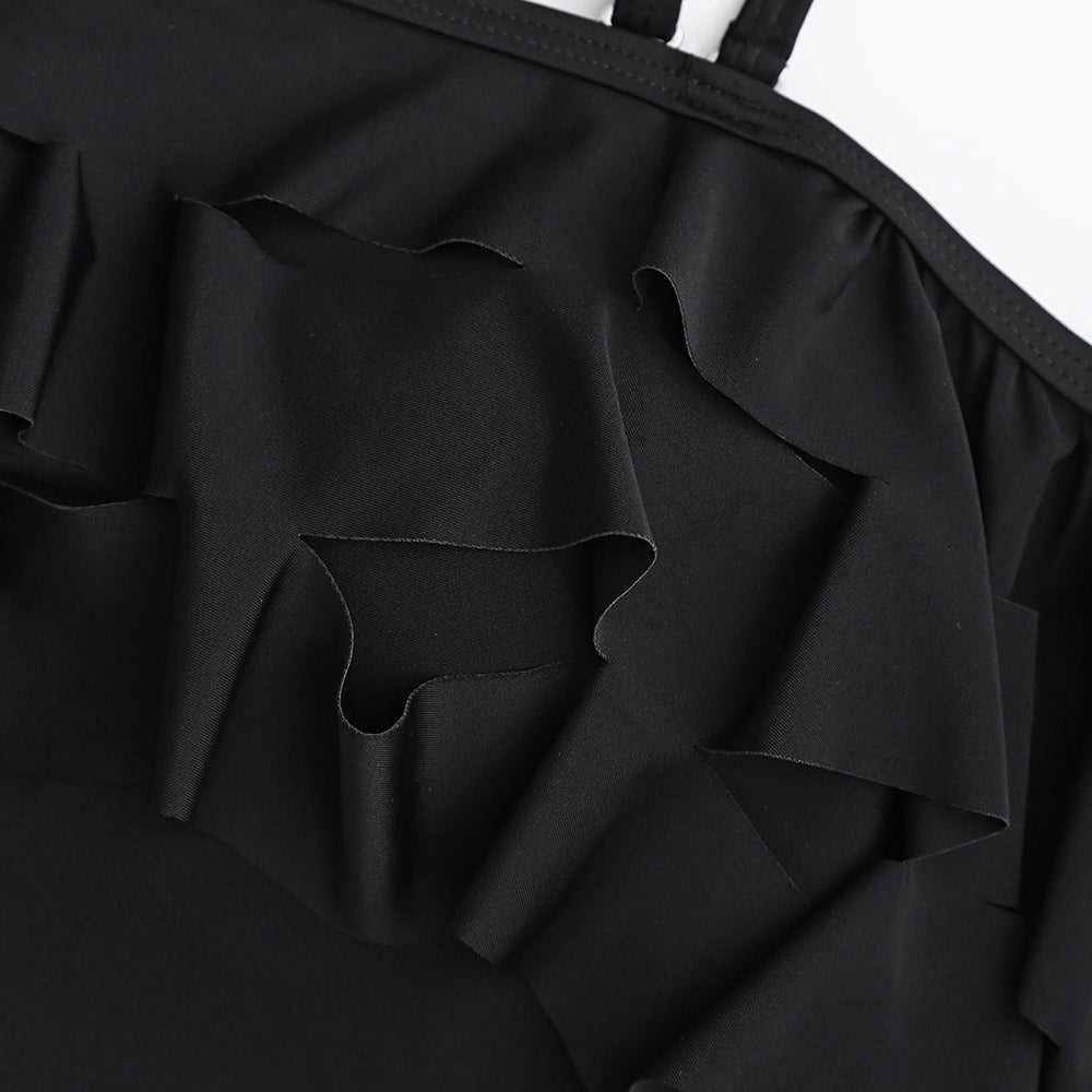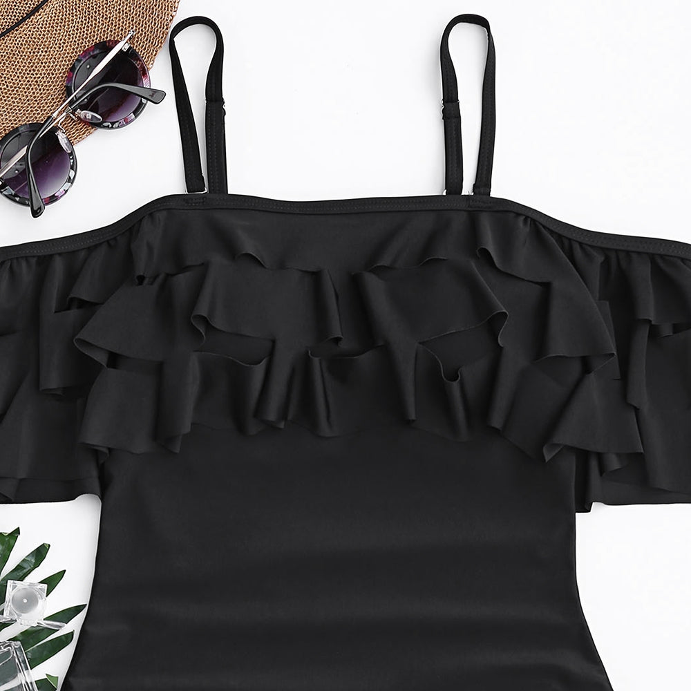 A tummy control one-piece swimwear featuring flounce overlay and removable adjustable shoulder straps.