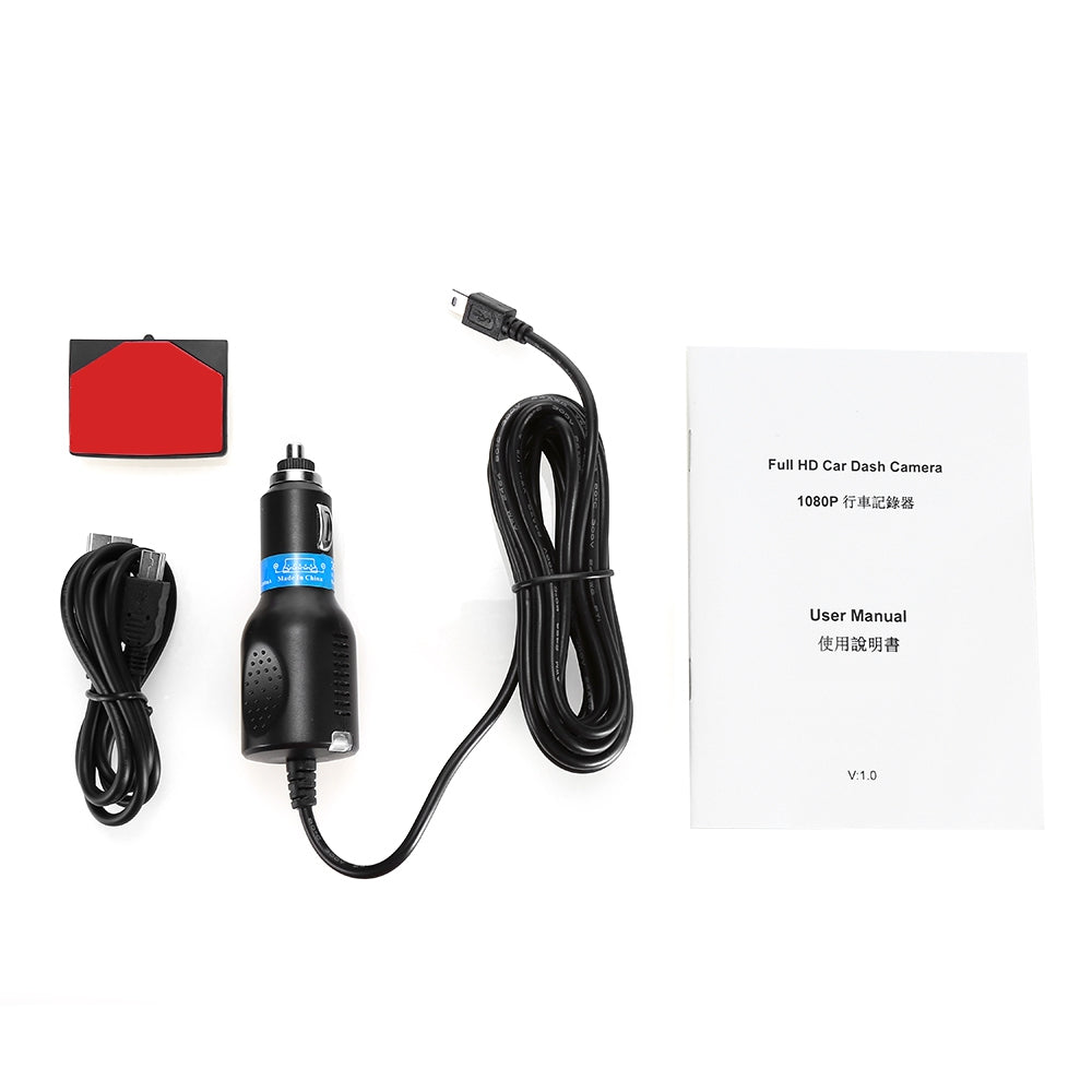 Package Contents: 1 x Dash Cam, 1 x Power Cable, 1 x USB Cable, 1 x Adhesive, 1 x English and Chinese User Manual