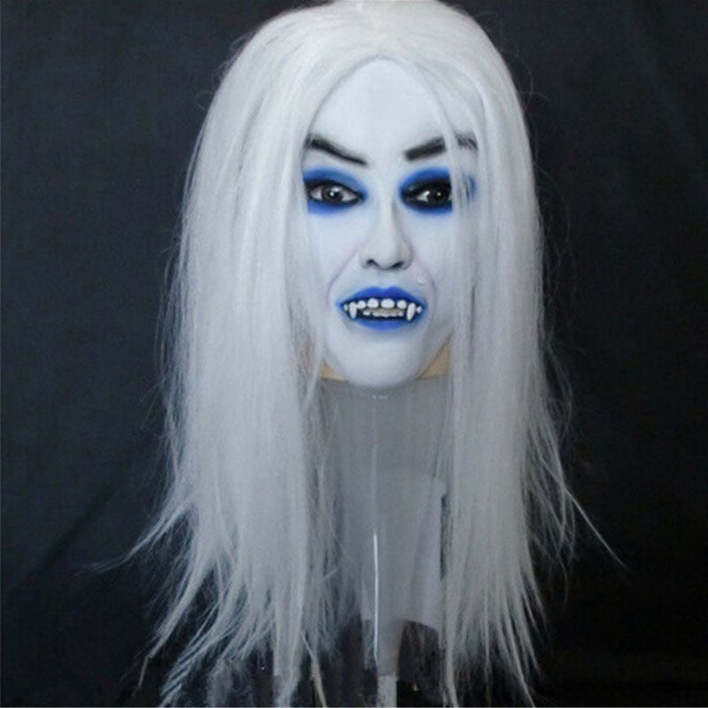 Yeduo Horrible Toothy White Long Hair Ghost Face Latex Soft Mask Halloween Party Prop Costume Mus