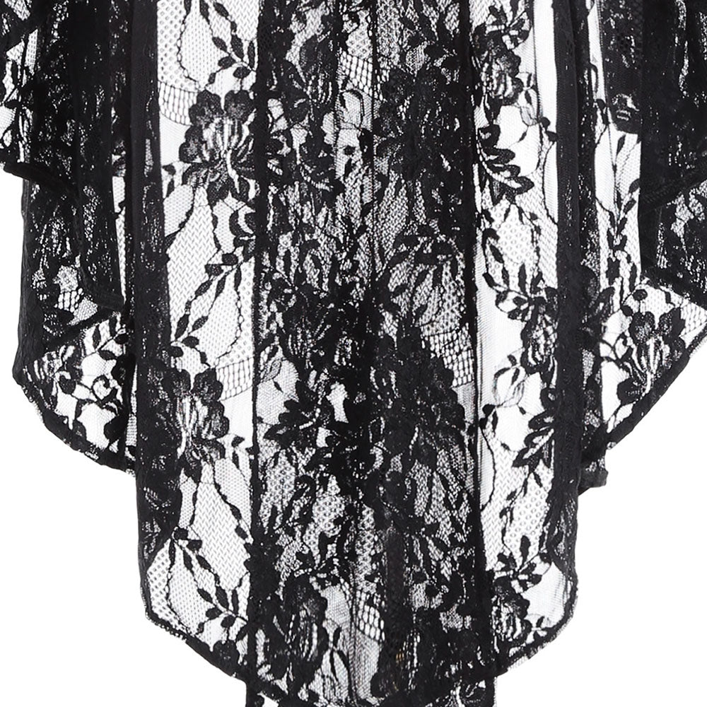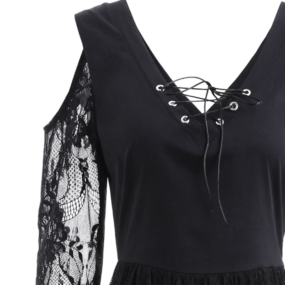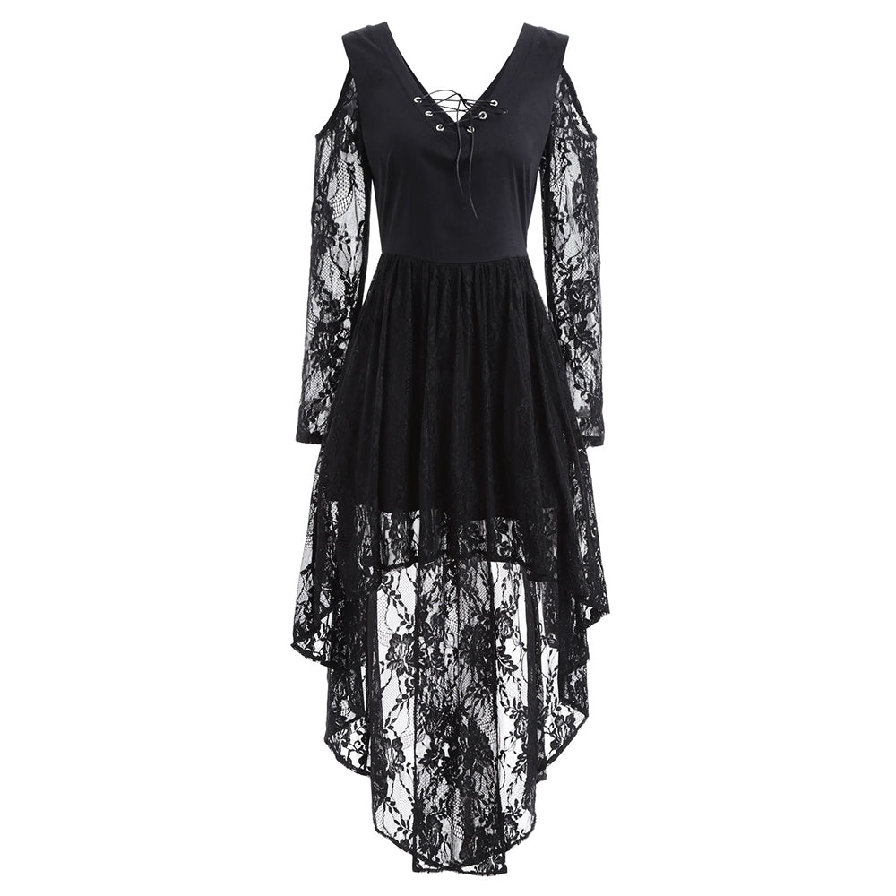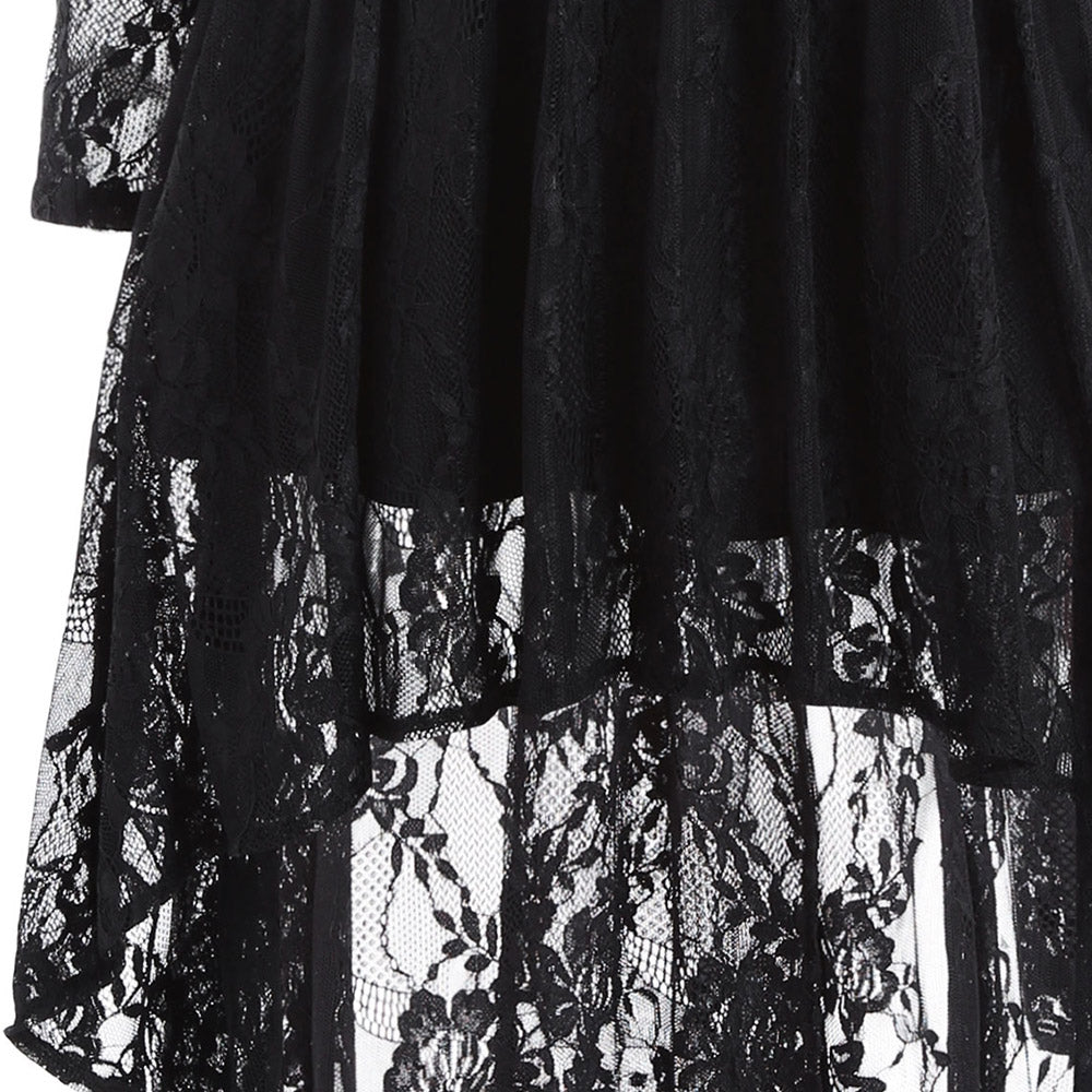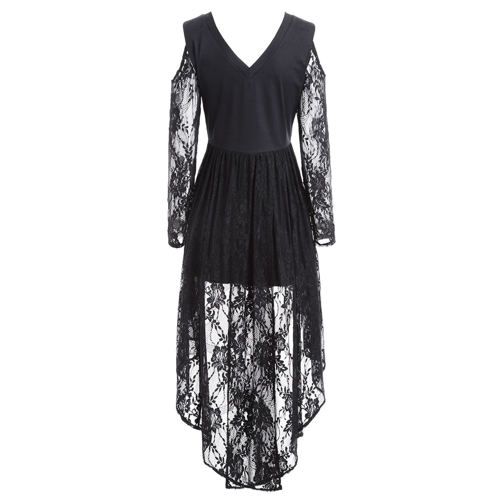 Chi, flowy dress crafts from high low silhouette with a lovely femme lace details. Featuring lace up detailing on the v-neckline and open shoulder design.