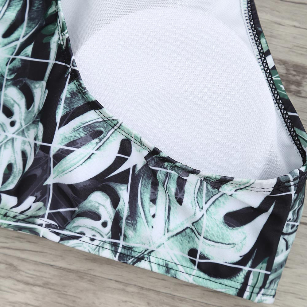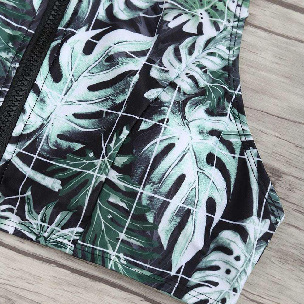 This tropical bikini set featuring allover leaves print, front zip up closure, racerback, and wire free padded cups.