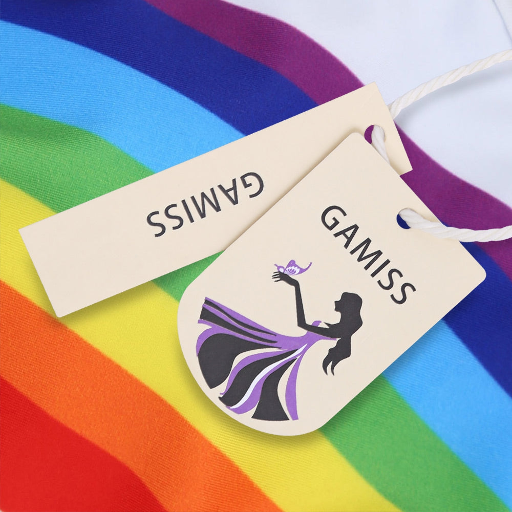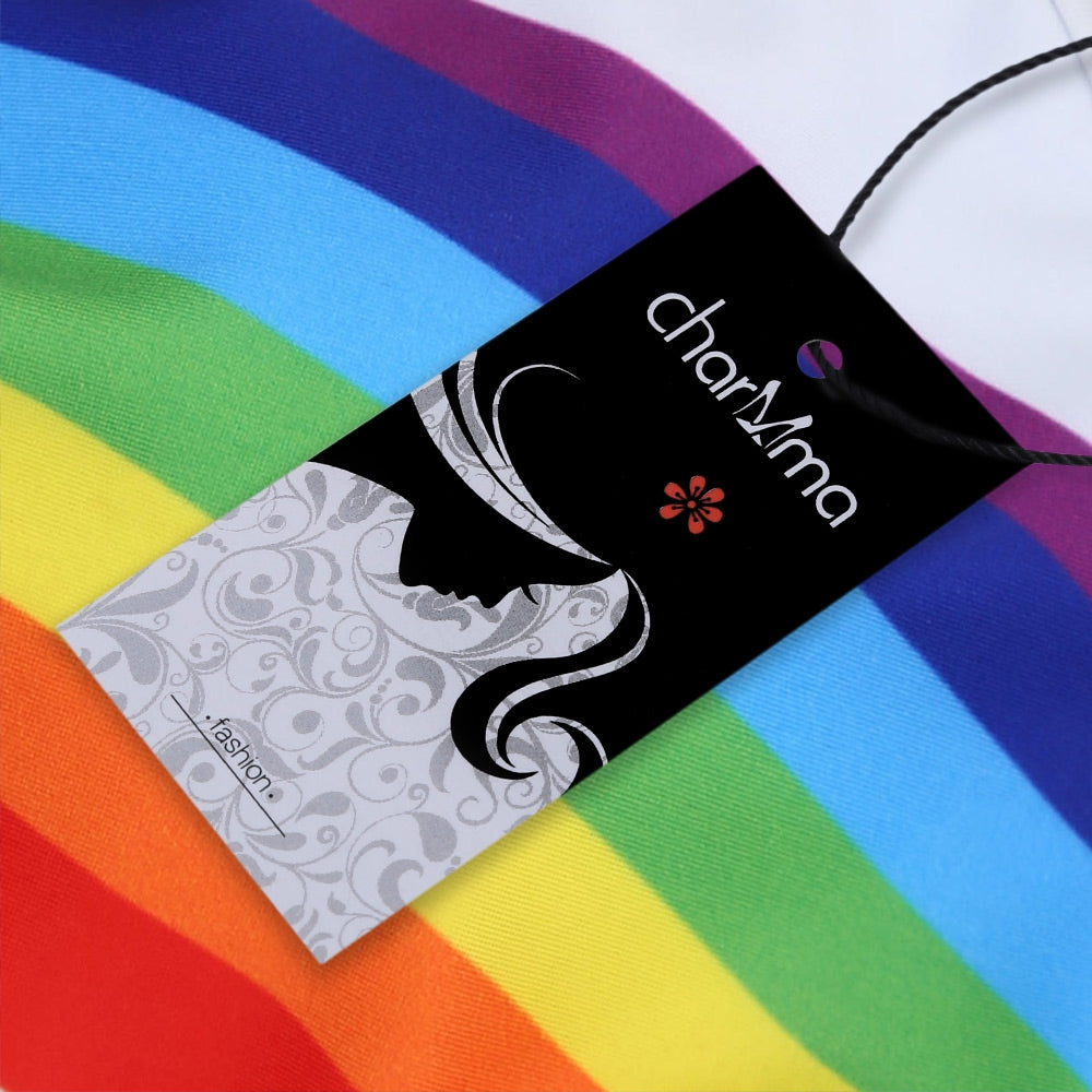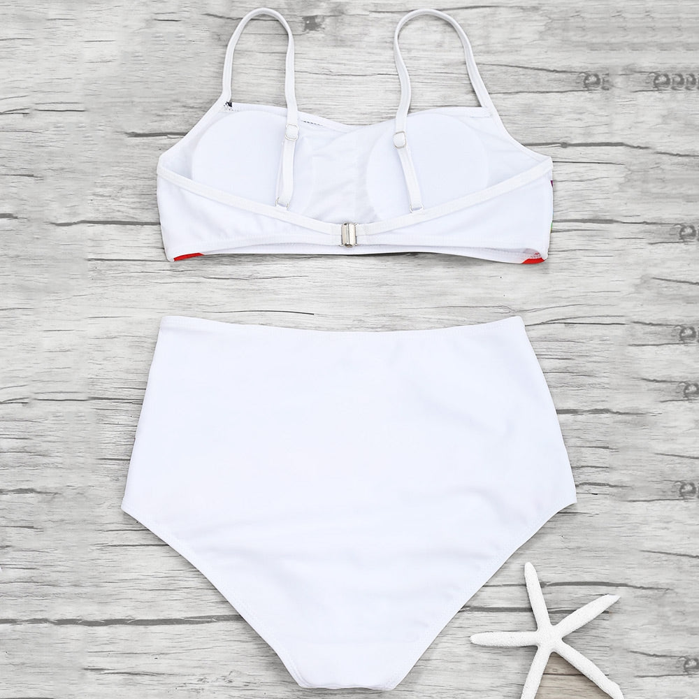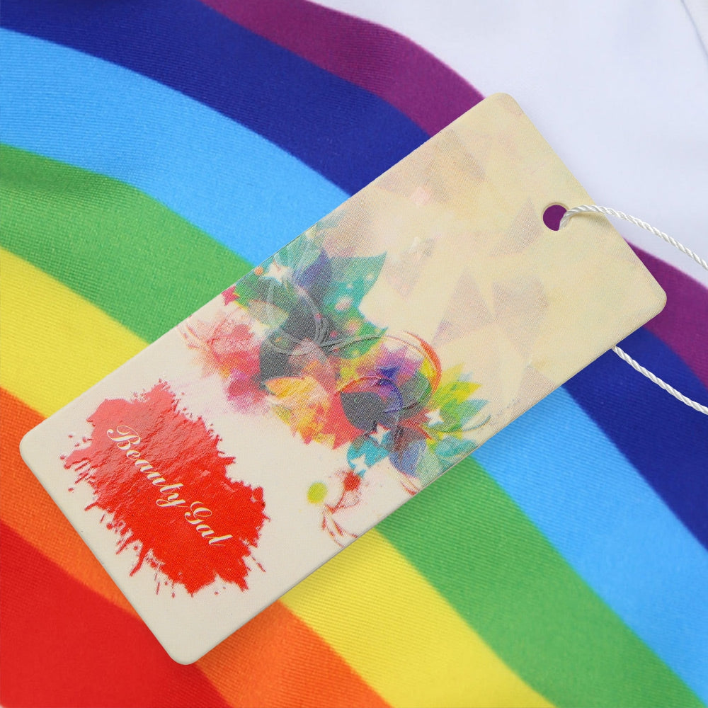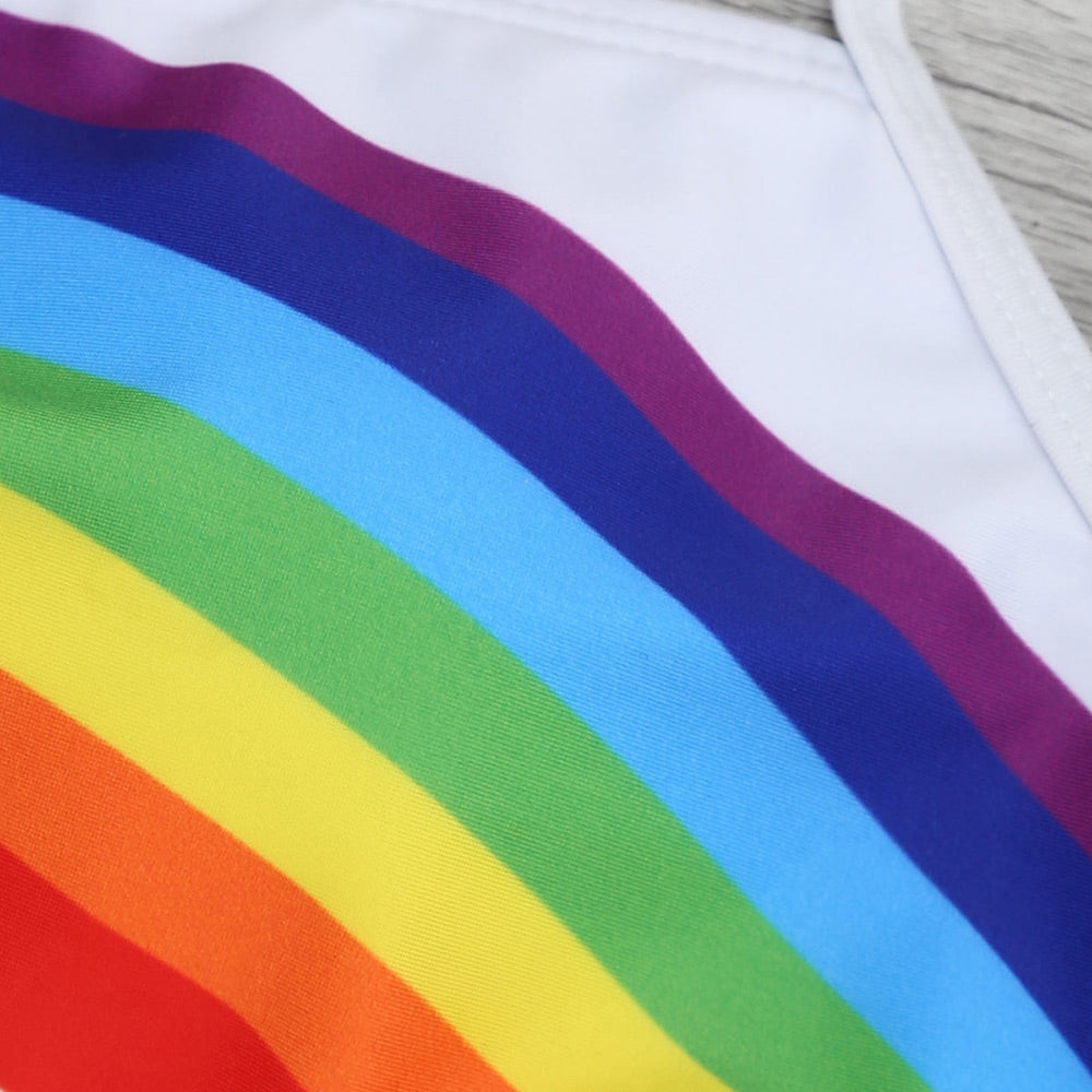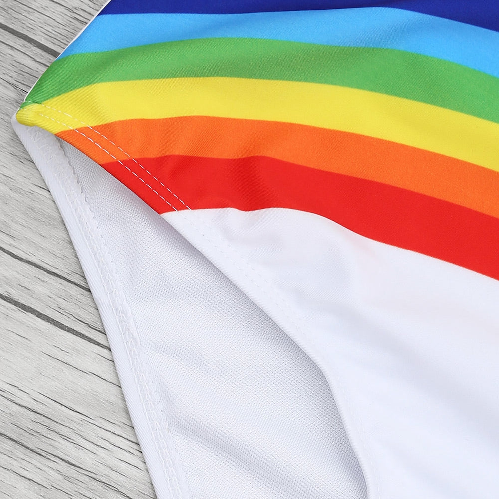 This high waisted bikini set features colorful rainbow print, adjustable spaghetti shoulder straps, and supportless wire free round padded cups.