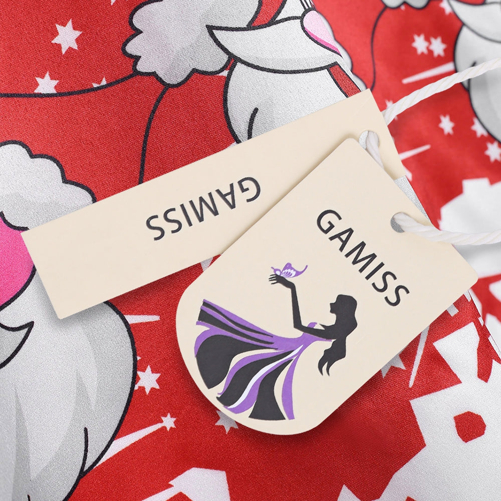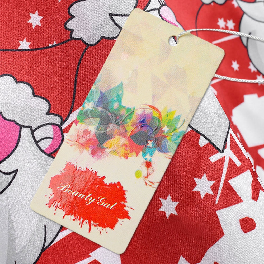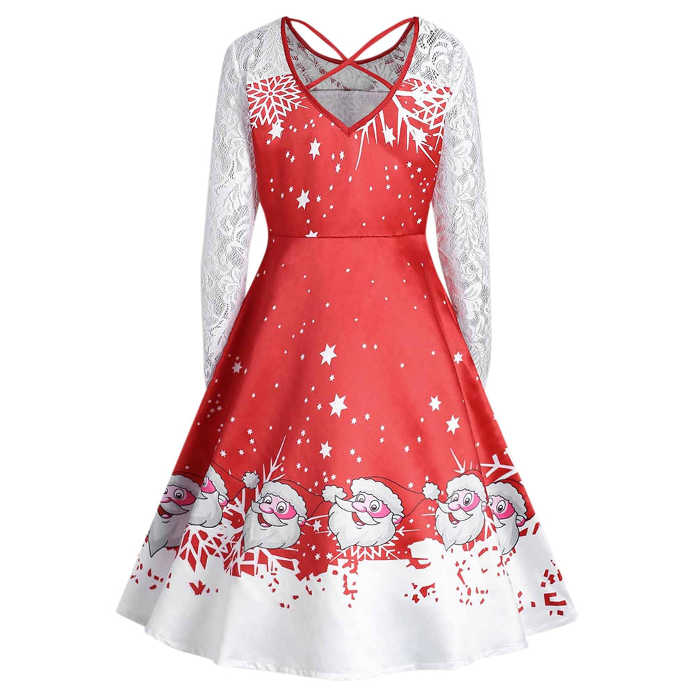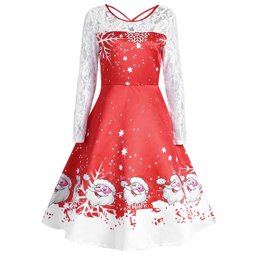 Cute Santa Claus printed long sleeve flare dress featuring an easy, effortless shape with lace sleeve and cross v back design, pull-on style