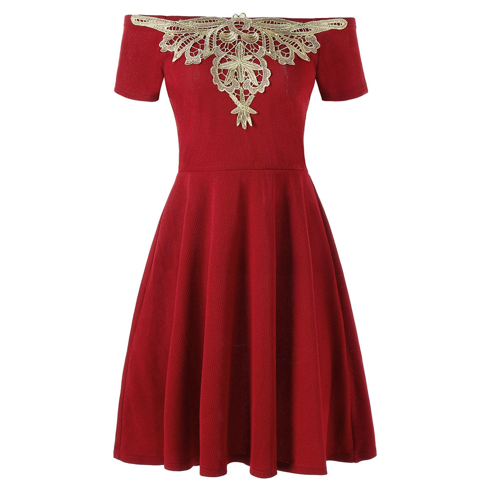 This gorgeous mini dress features a romantic soft material, a sexy off the shoulder neckline with applique detailing and a trendy fit and flare silhouette. It is a stunning choice for your next date night, party or girls night out!