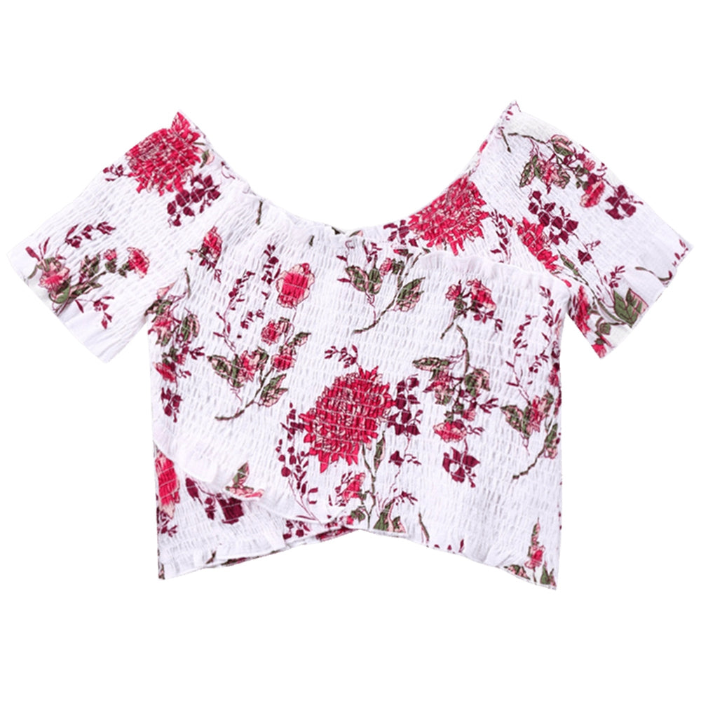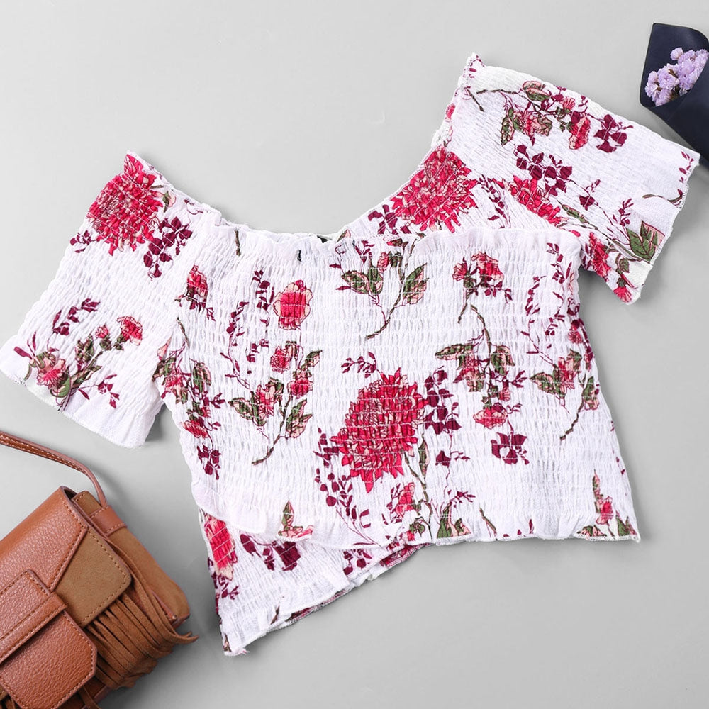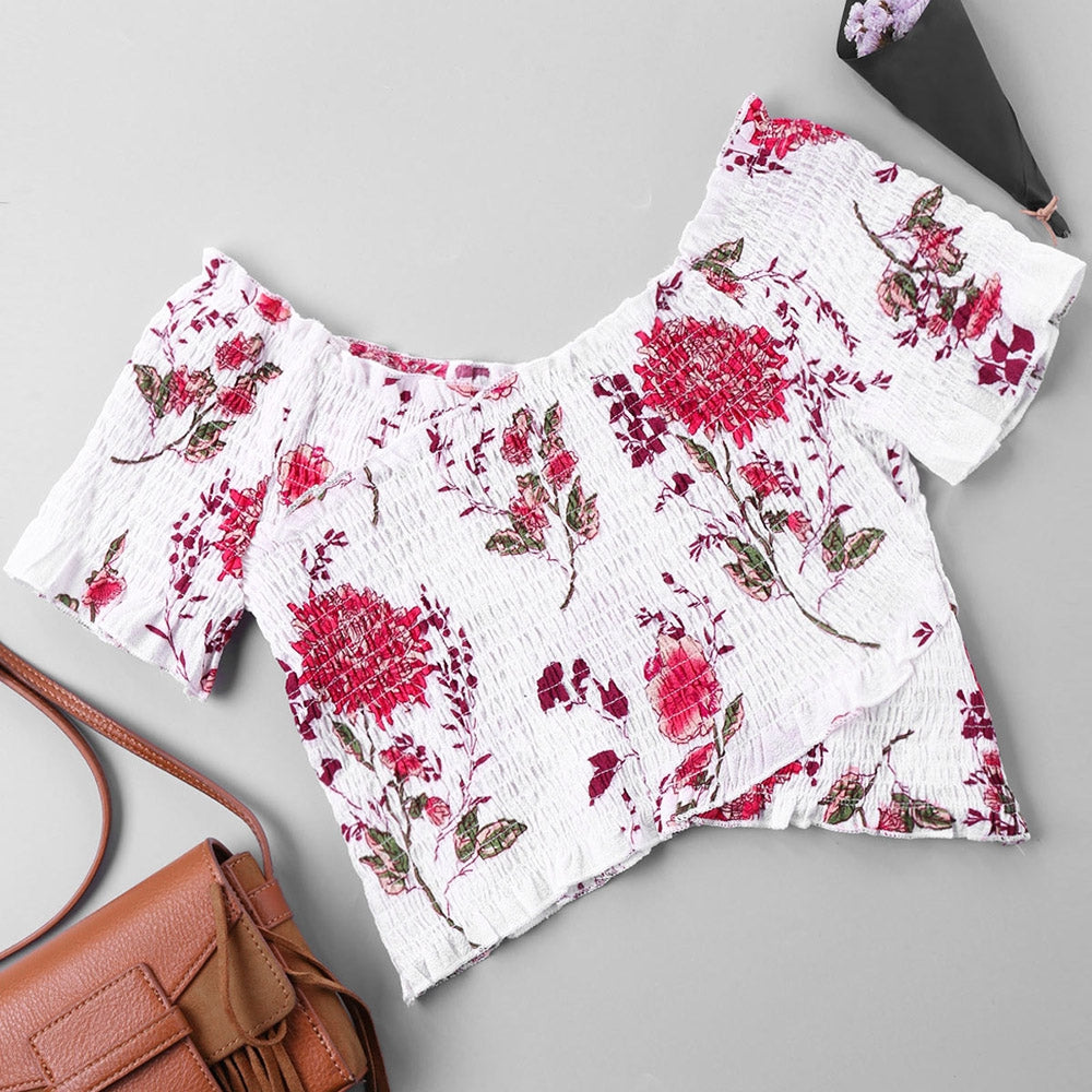 Bohemia style crop blouse always is a good choice to wear in summer. No doubt that the blouse is. Its features full flourishing floral print, cross front with elastic shirred design, short sleeve and exposed belly length. It's very fashion to pair it with palazzo pants, comfortable sandals, cool sunglasses and beautiful headband.