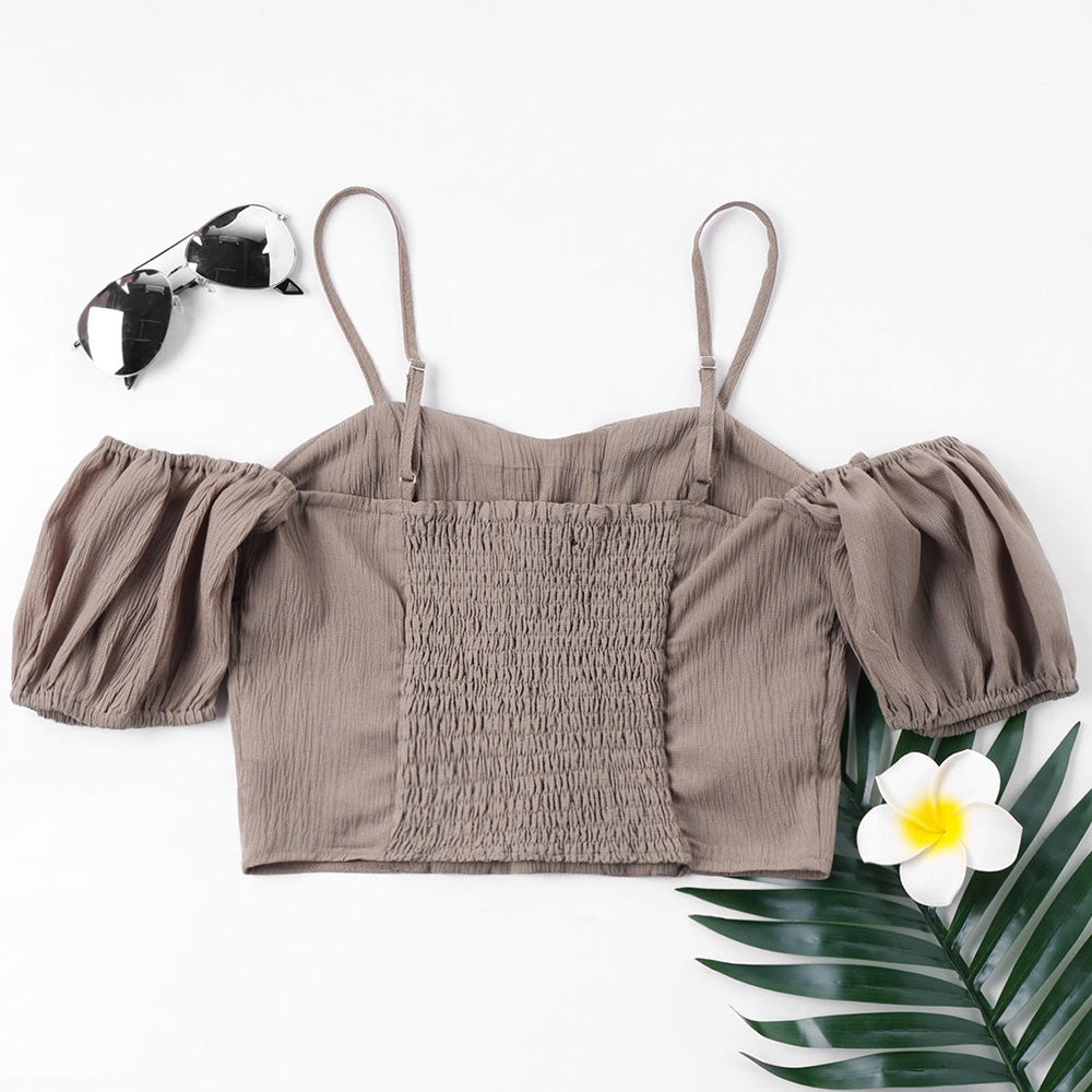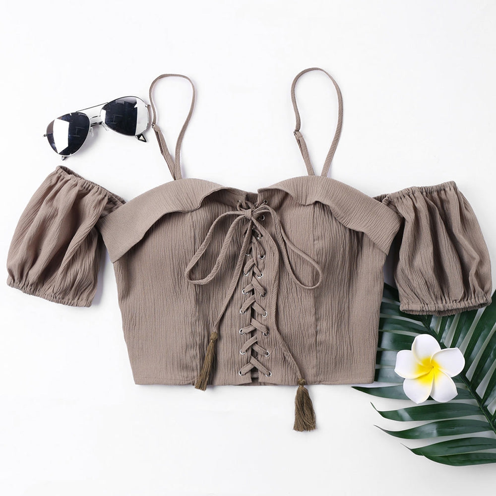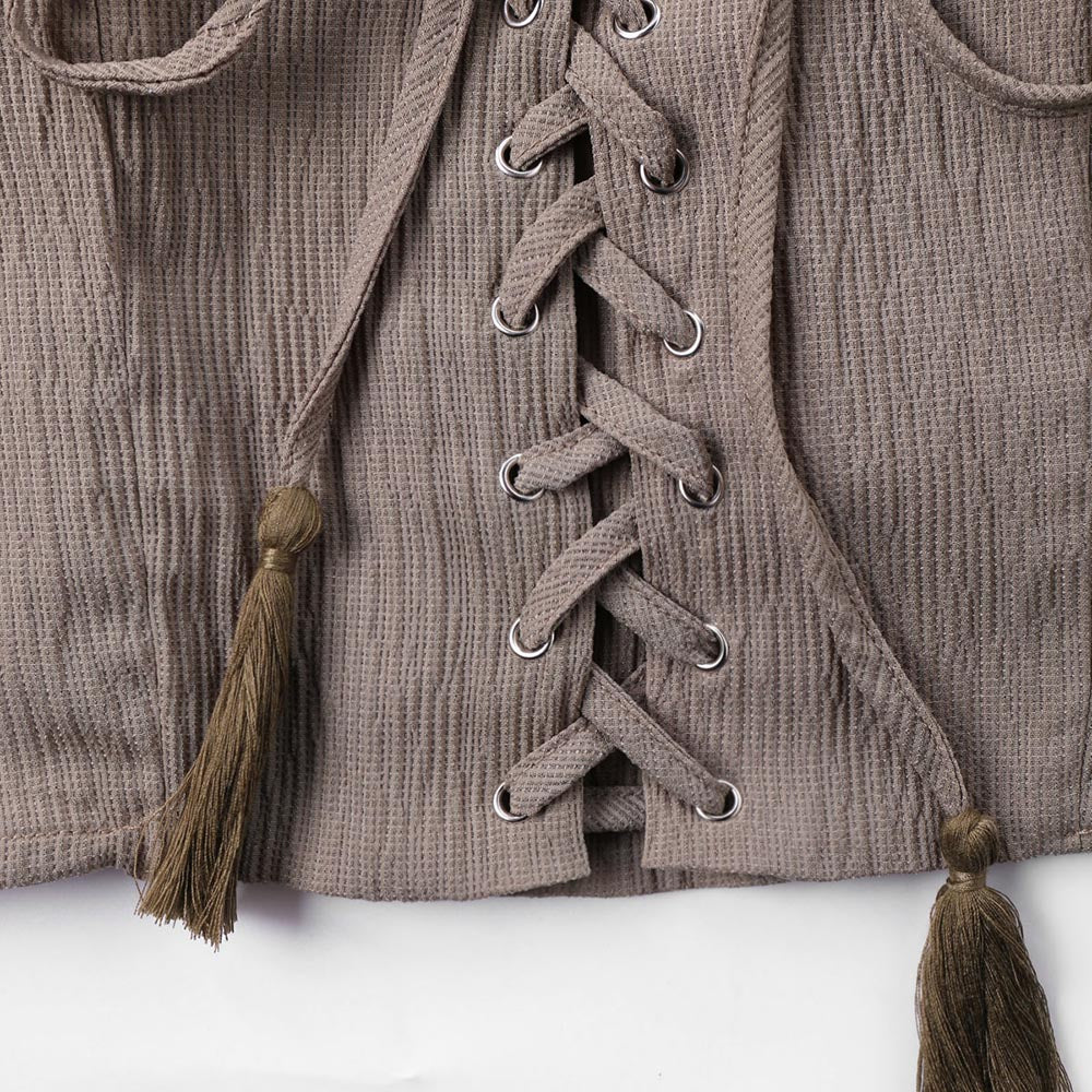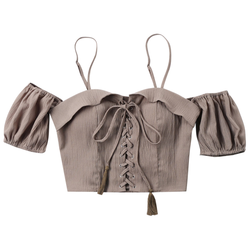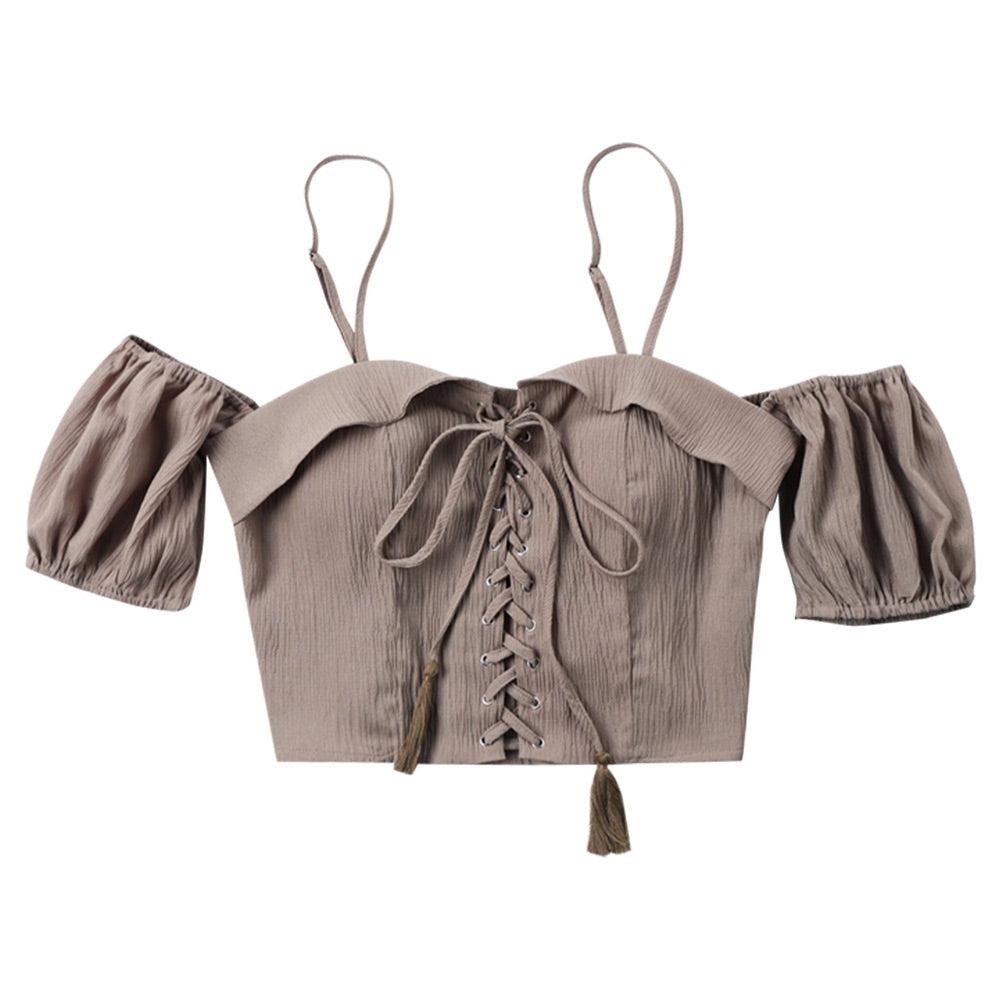 This blouse with a little bit Bohemia style is very cool for this summer. Trendy criss-cross lace-up tassels from bottom to the top then end with bowknot. Humanized adjustable cami straps with cutting to form a cold shoulder design. And wrinkle elastic back design is also one of its features. Easy to match for creating your varied style.