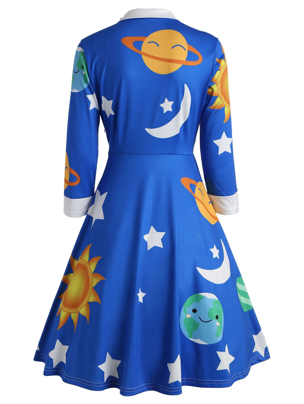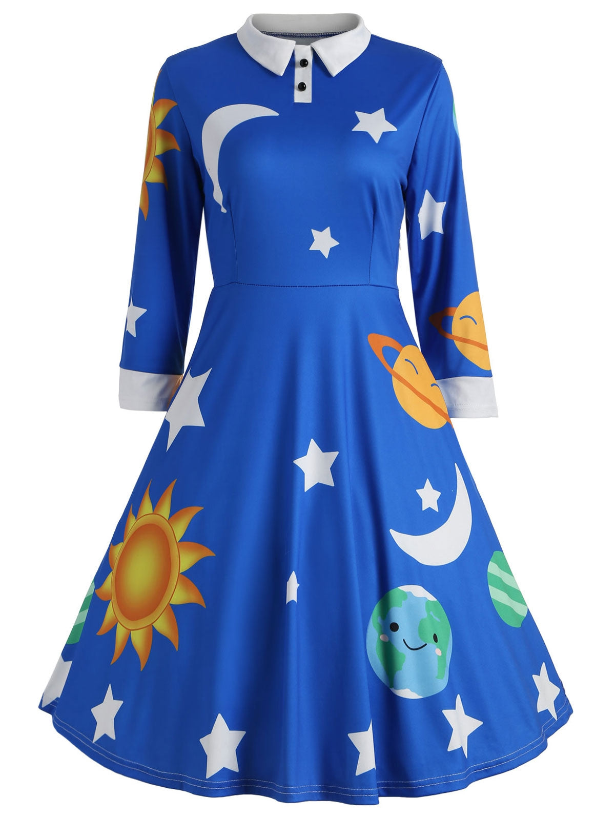 Play around with this wonderful dress in sun moon star and earth pattern. Full of fun and funky, the cute style and color are sure to make you smile.