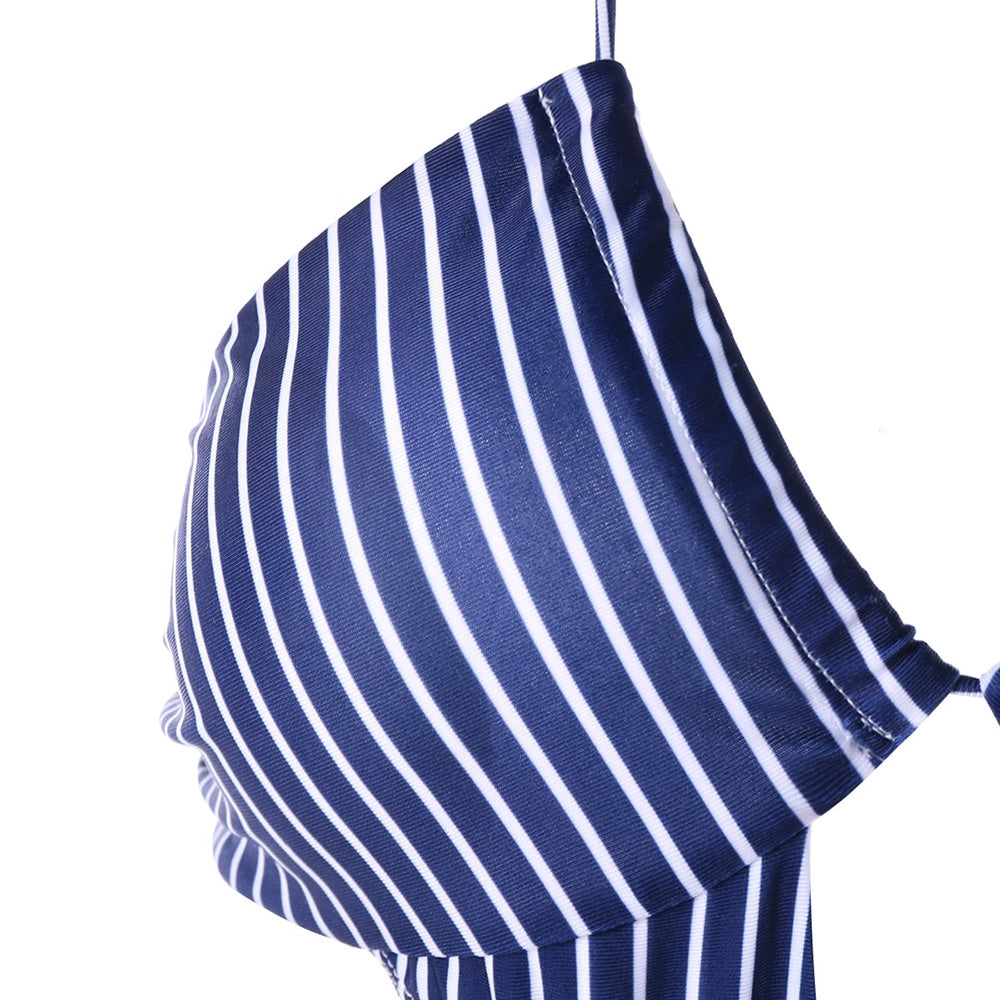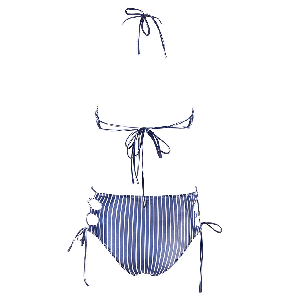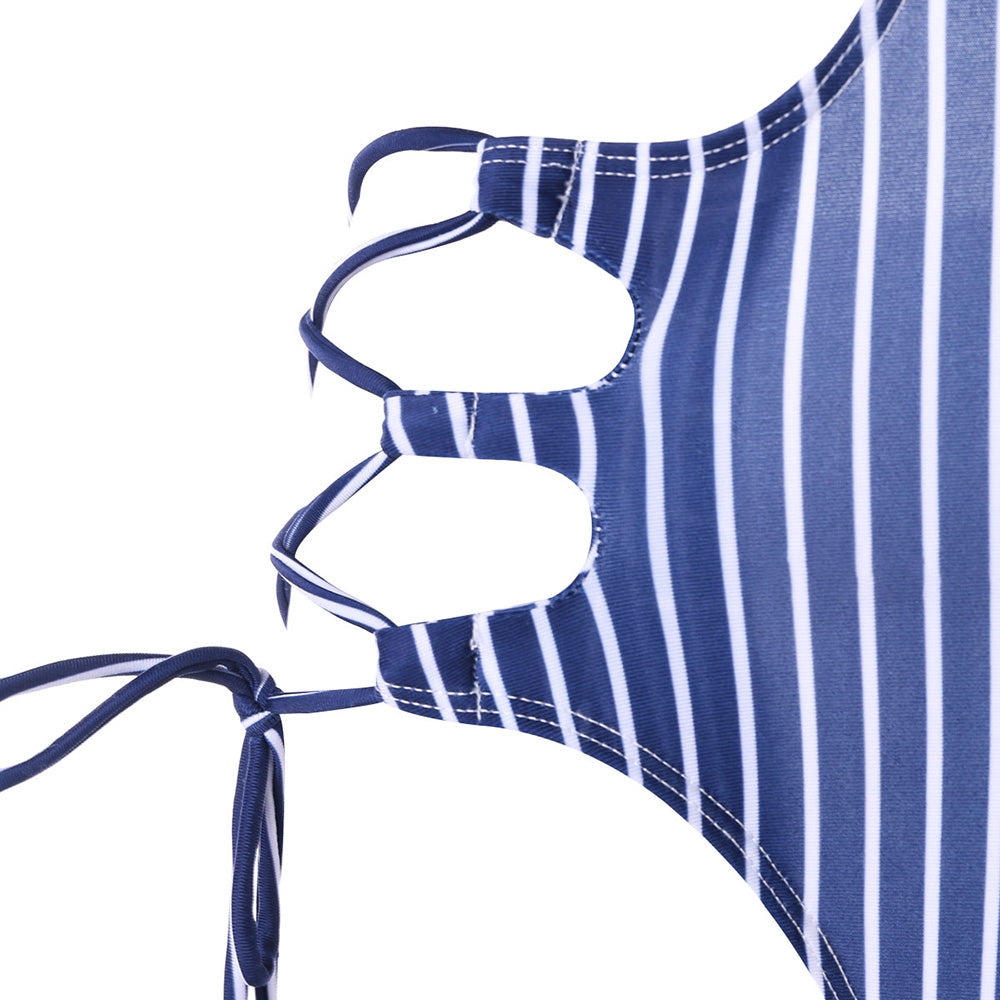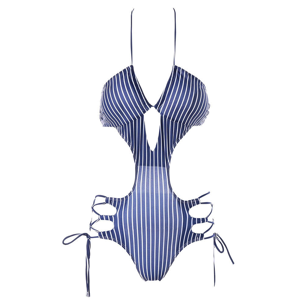 Coordinating cutouts at both the front and sides of this one-piece swimsuit shows off a sexy look. Featuring striped design, strings on neckline and back, and lace-up details at the bottom sides finish the stunning look. This sexy swimsuit will become part of the beach and pool gear.