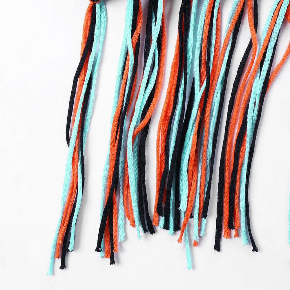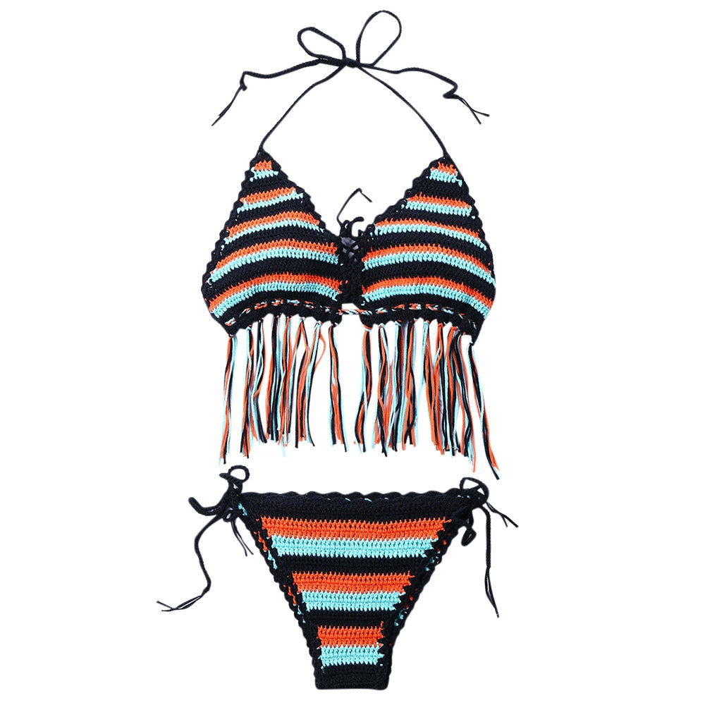Color block stripes detailing adds boho-chic texture to this beach-ready bikini set. This bra top boasts fringes hem, halter style, and backless make. Paired with tied briefs. Show off your enthusiasm in this knitted bikini set.
