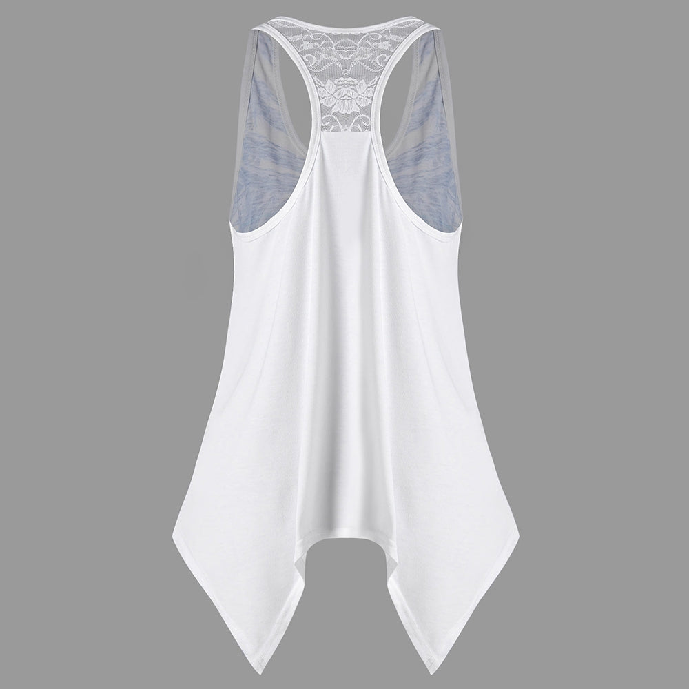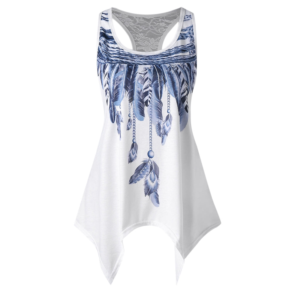 In an easy, effortless fit, this trendy top features a low scoop neck with beautiful feather print. The tank top also features a handkerchief shape, a racerback design and lace insert detail in the back for a chic look. Just add shorts or pants for a must-have look.