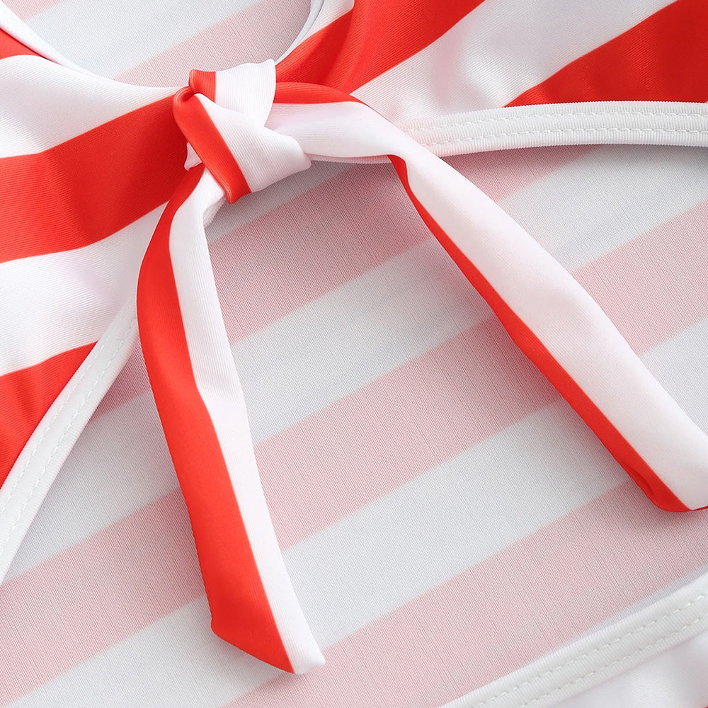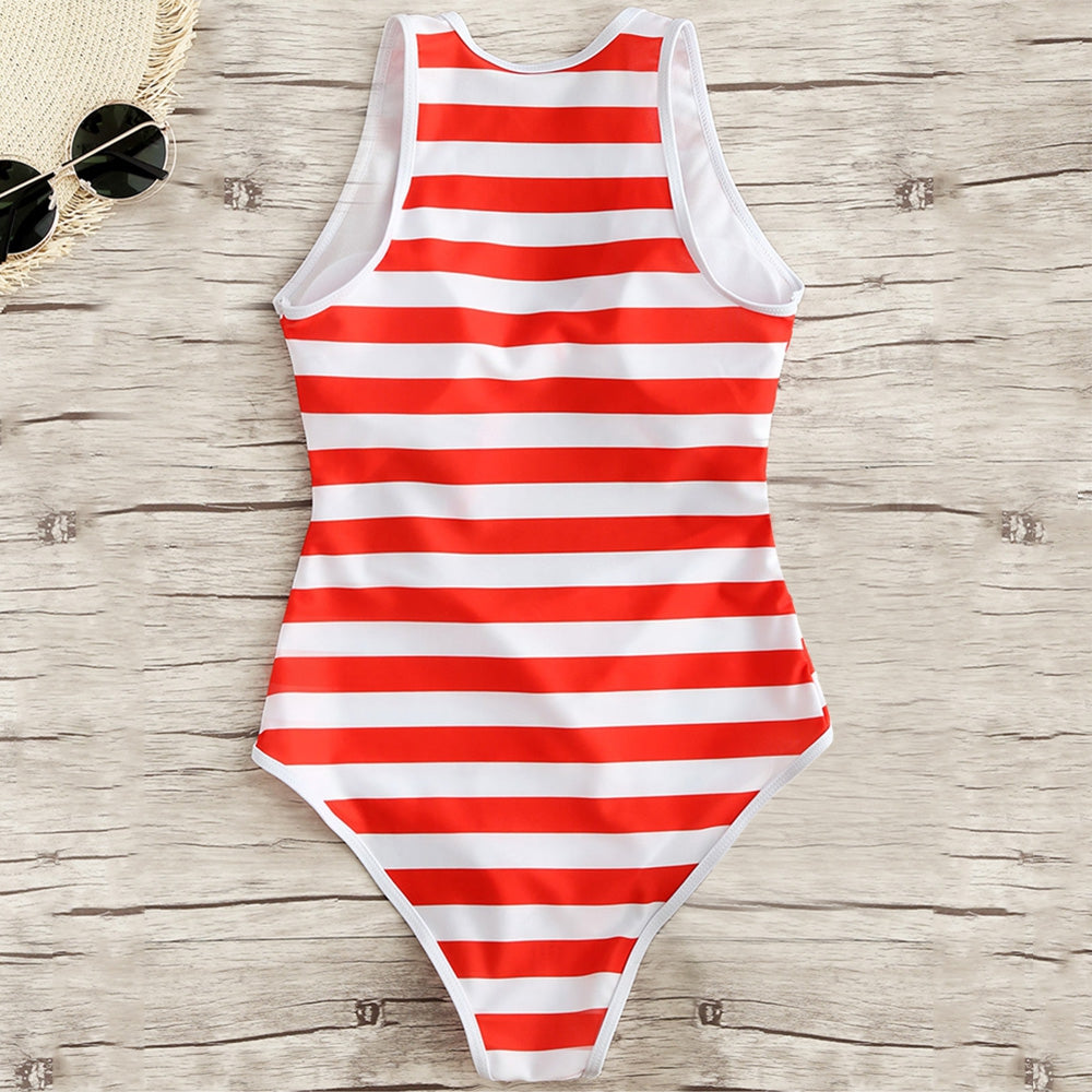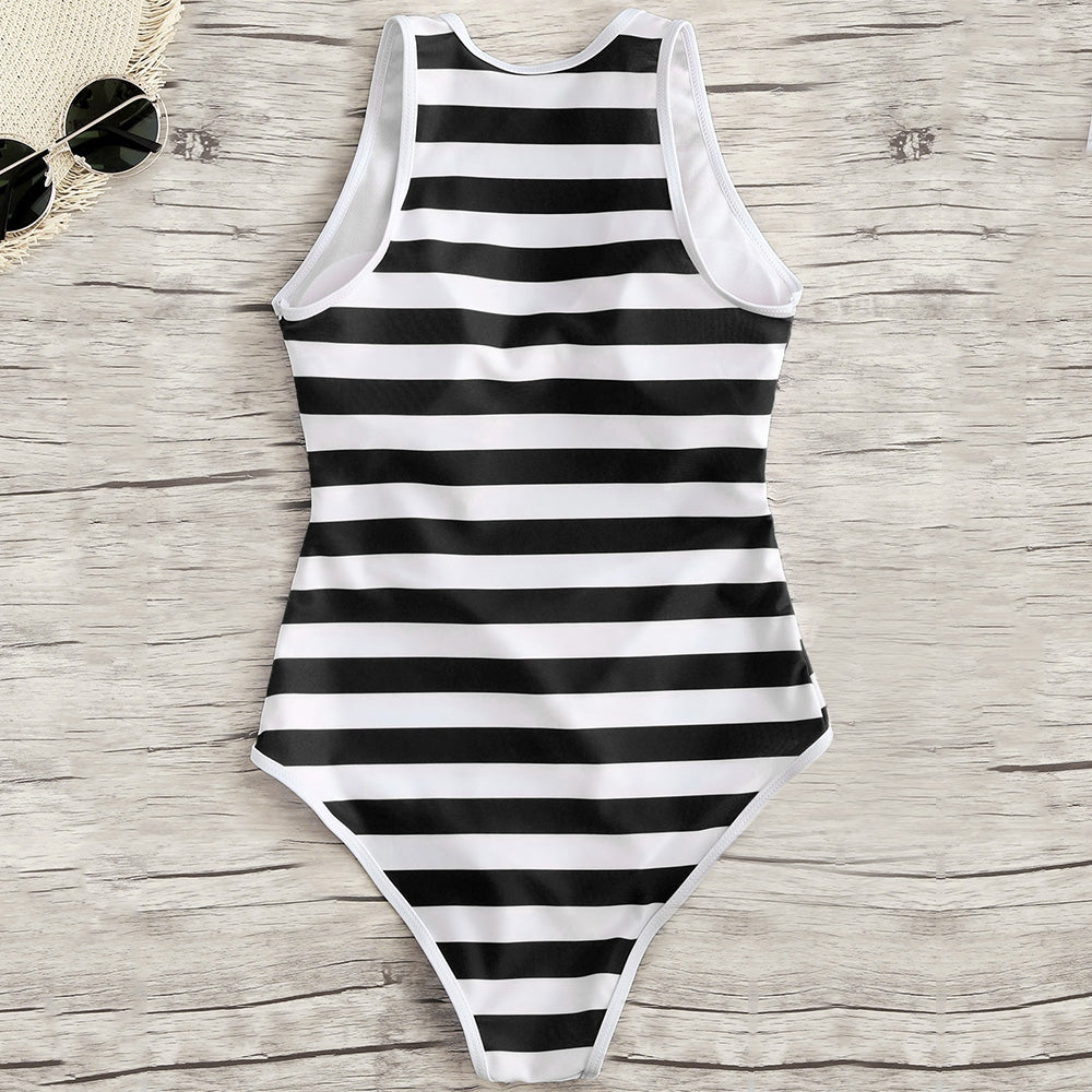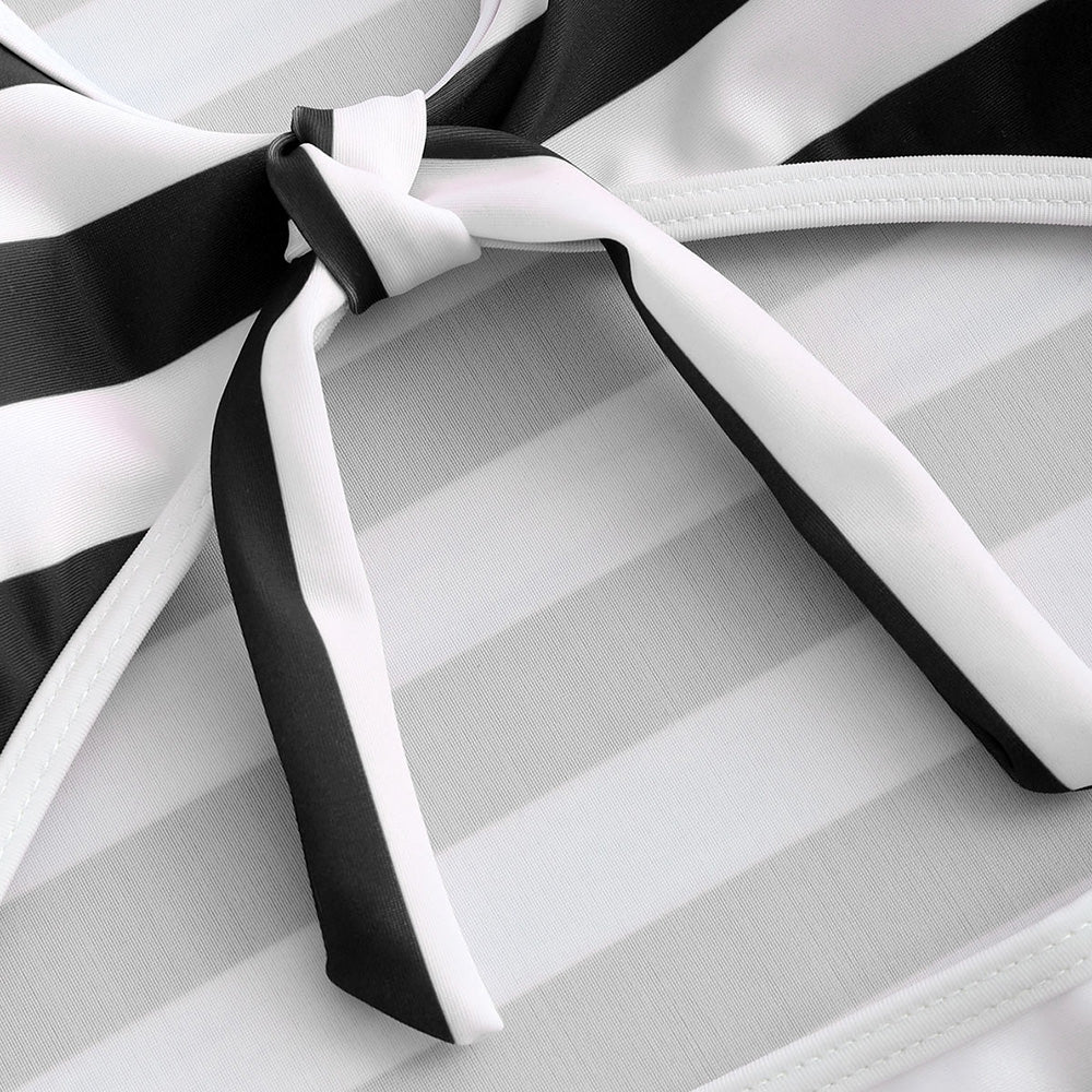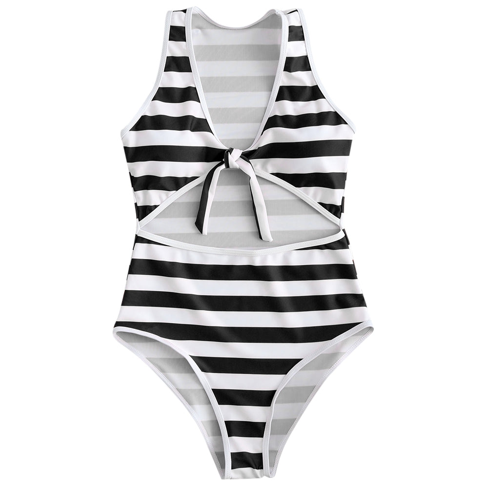 Looks like a two-piece design at the first sight, it features allover stylish striped pattern, flirty cut out front with a cute knot detail, and high-cut bottom with moderate rear coverage. It has no underwire but soft sponge insert the cups. Bra paddings are removable. Three colors for your perfect choice.