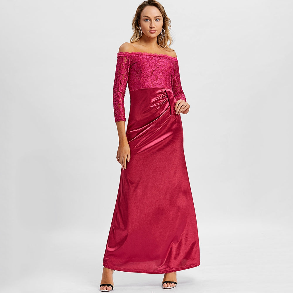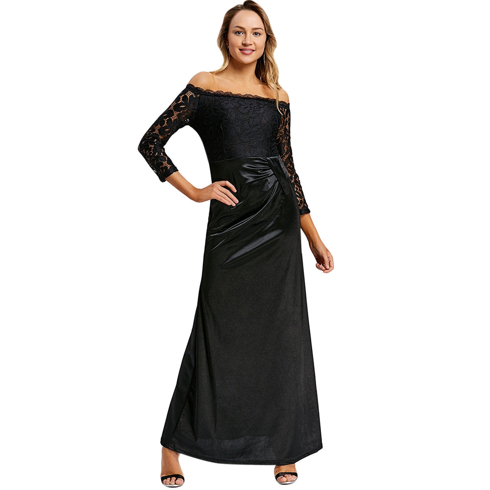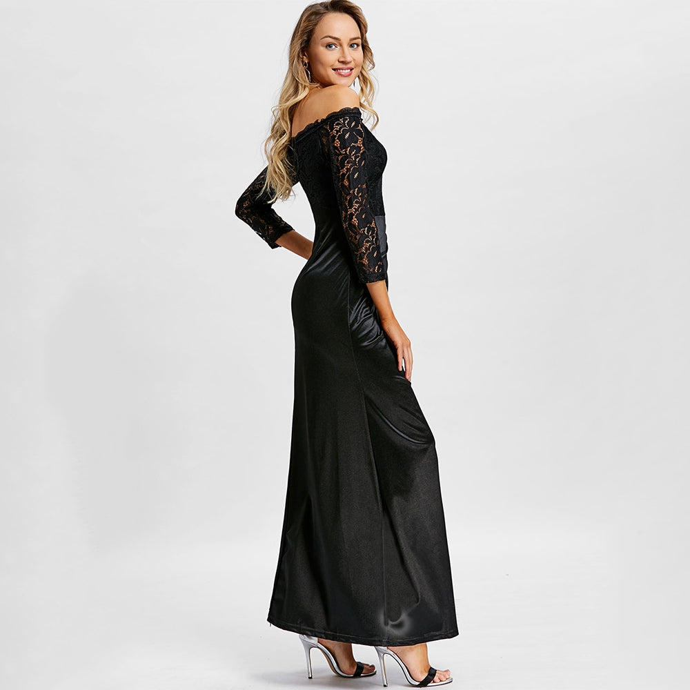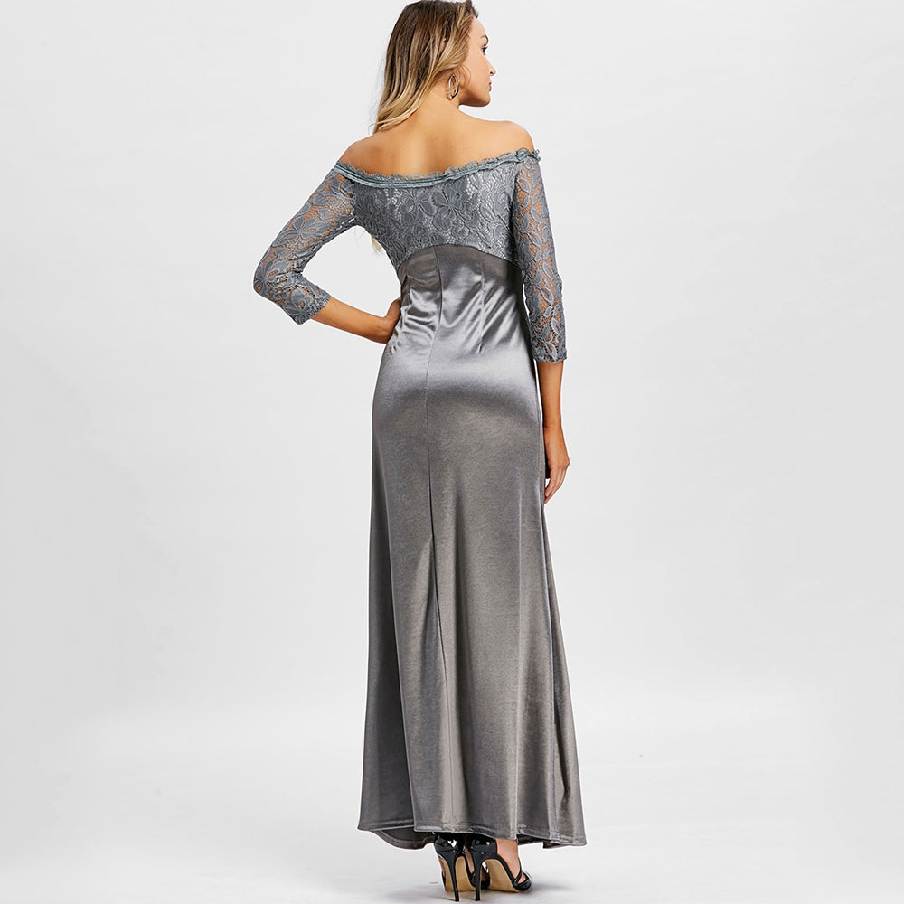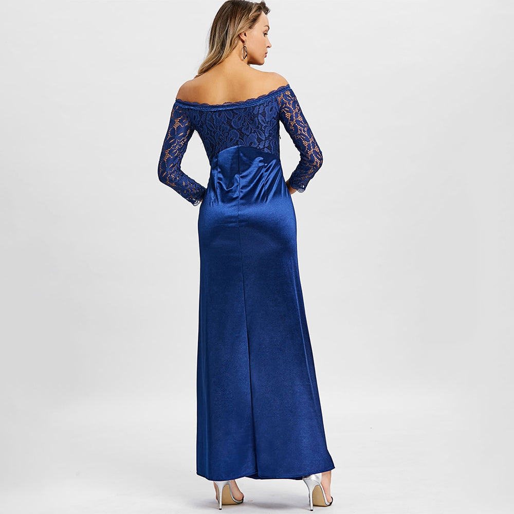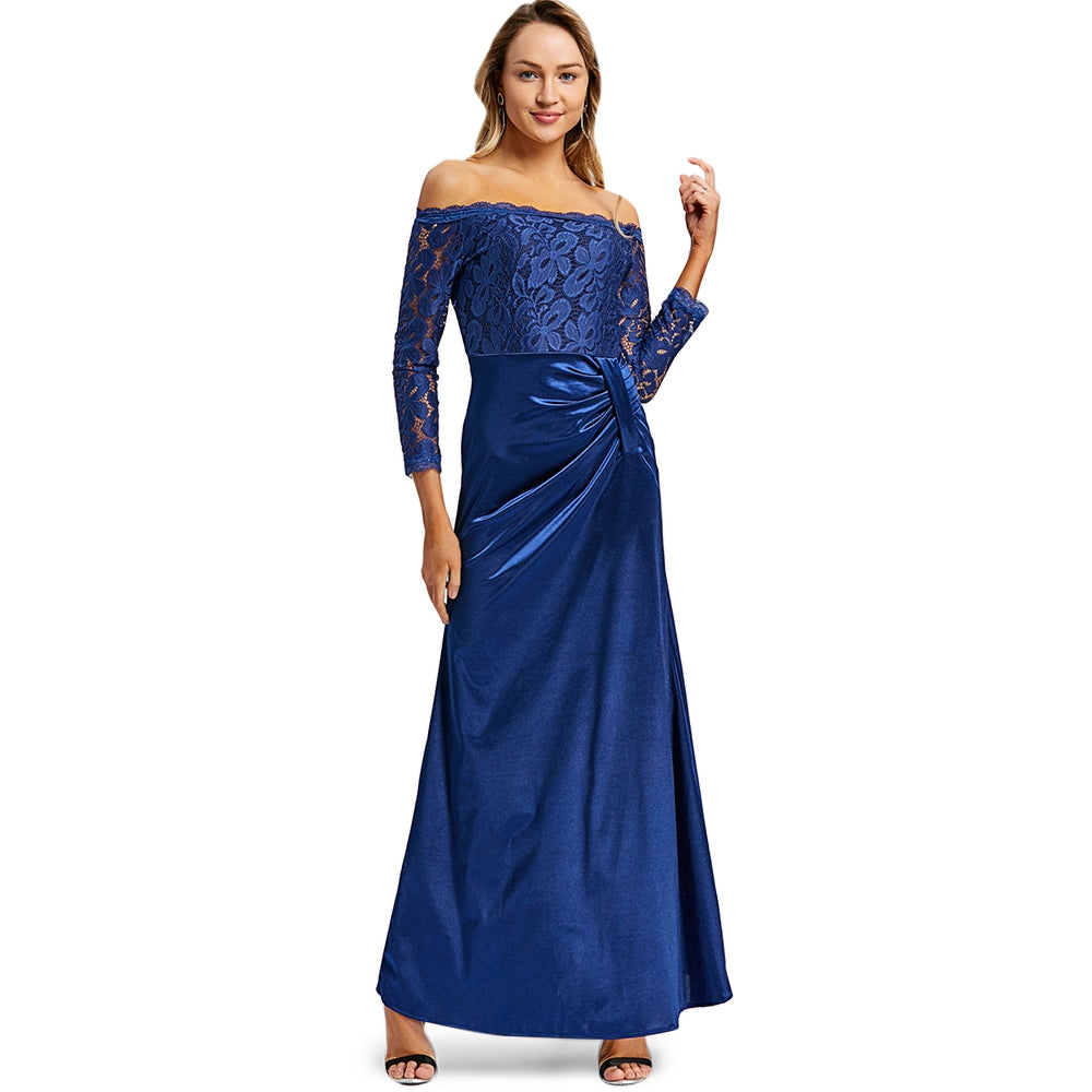 You're sure to be the focus in this stunning maxi dress! Featuring a beautiful off the shoulder design this elegant look is the best way to make a statement at any formal occasion! Lace accents add a chic feel. Just add a sparkling necklace and an elegant pair of heels to complete this dazzling look!