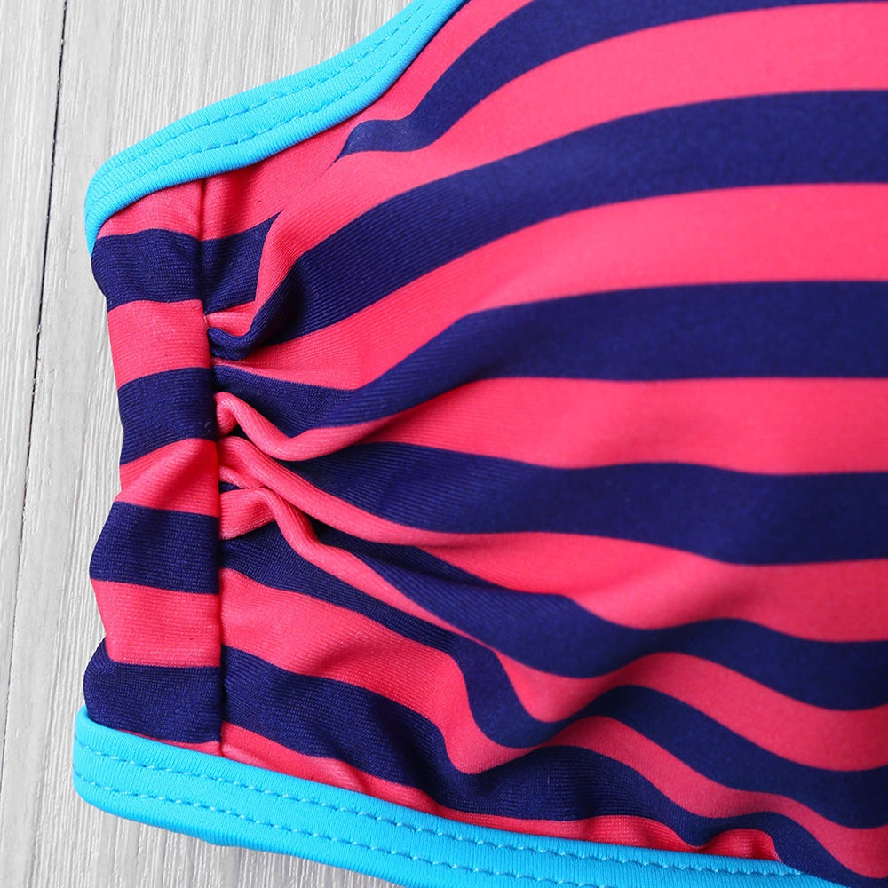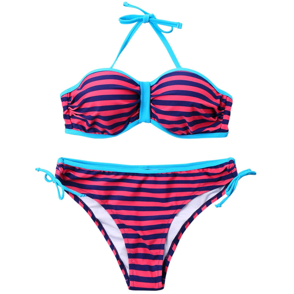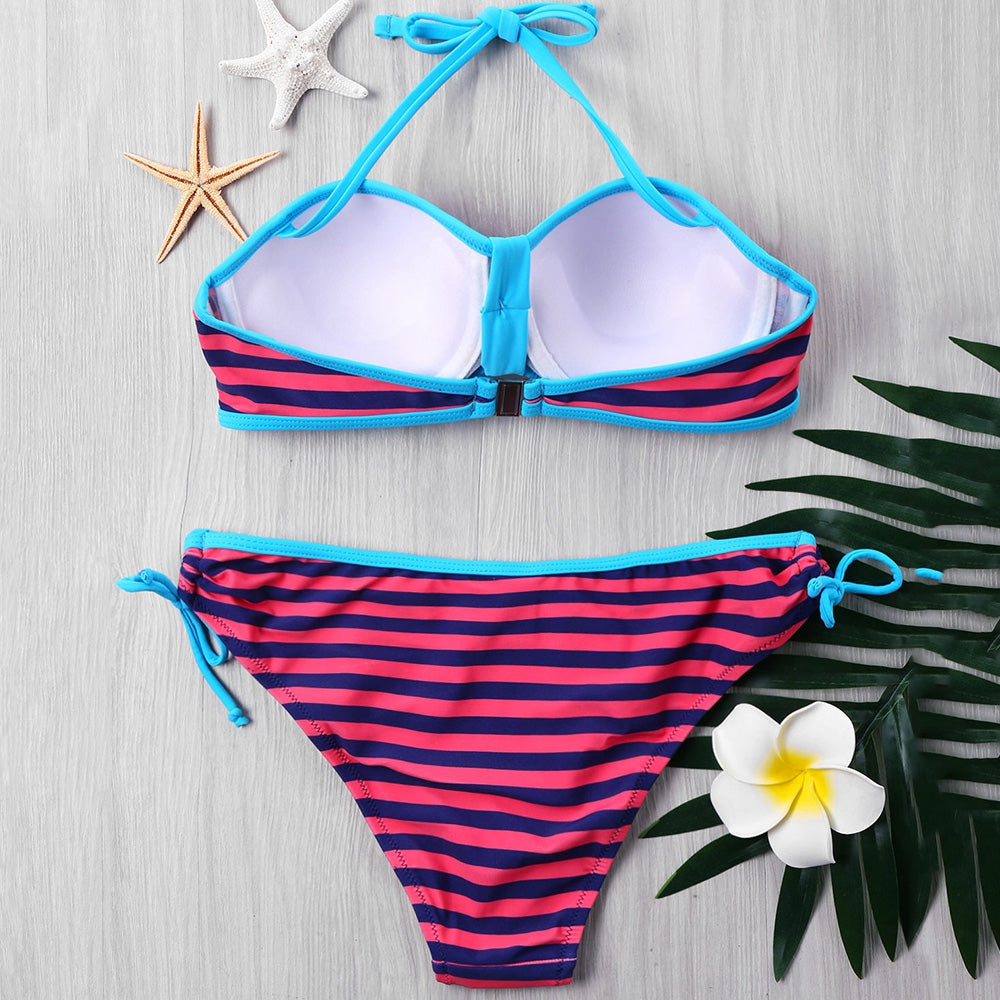 This simple stripe bikini set is divided into adjustable halter neckline bra which looks like a bow-tie and lace-up side briefs.