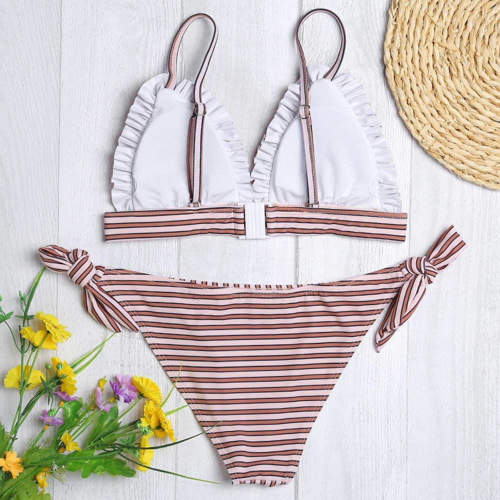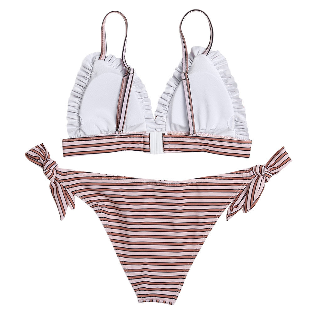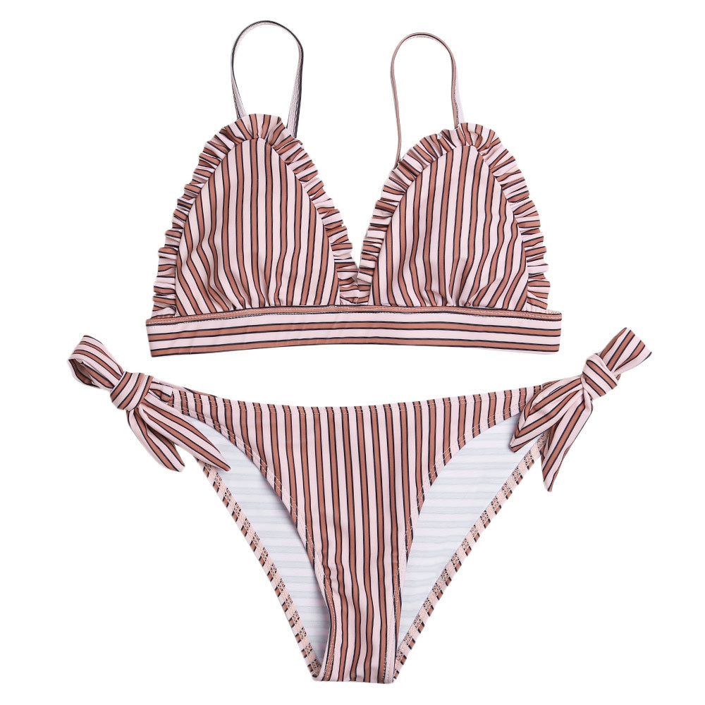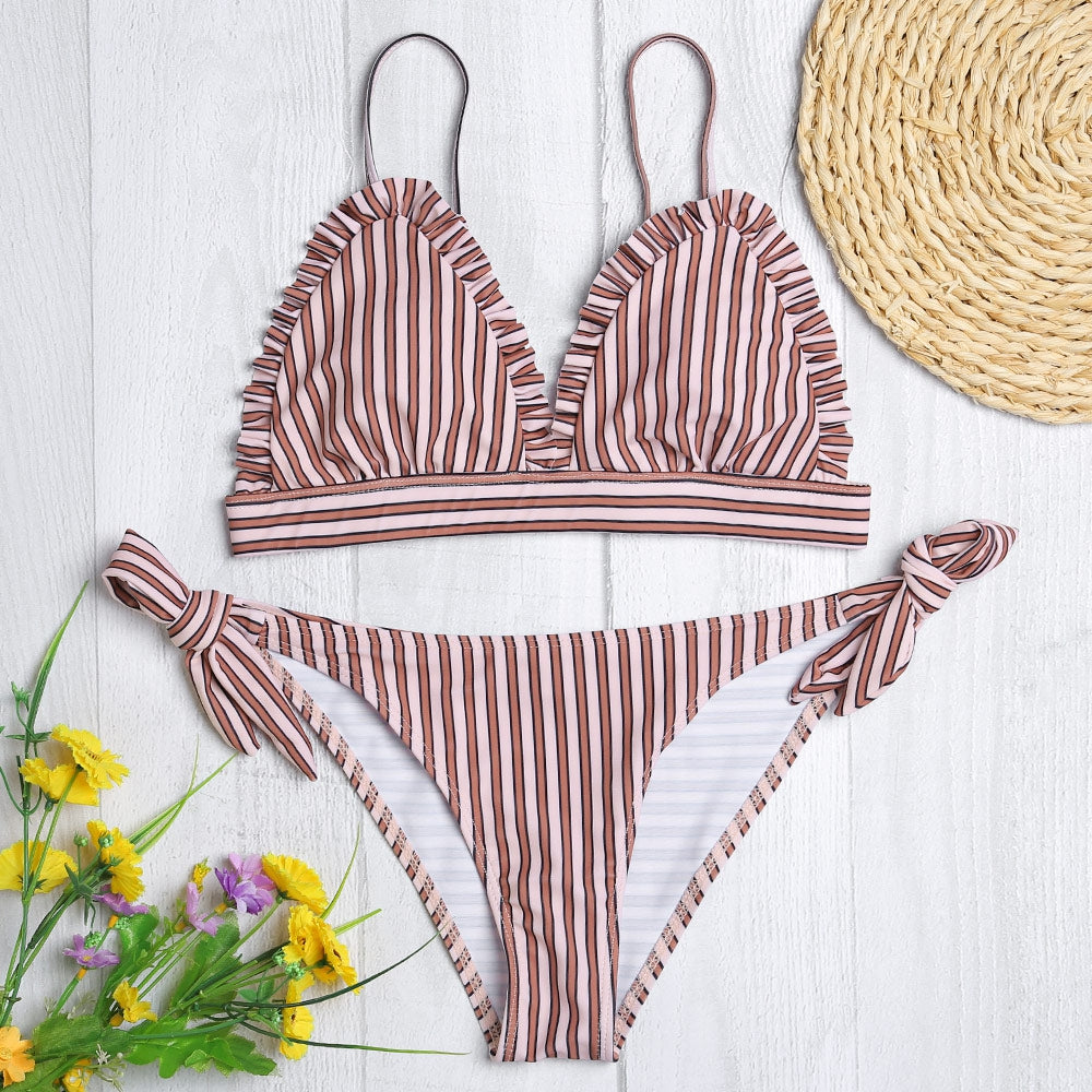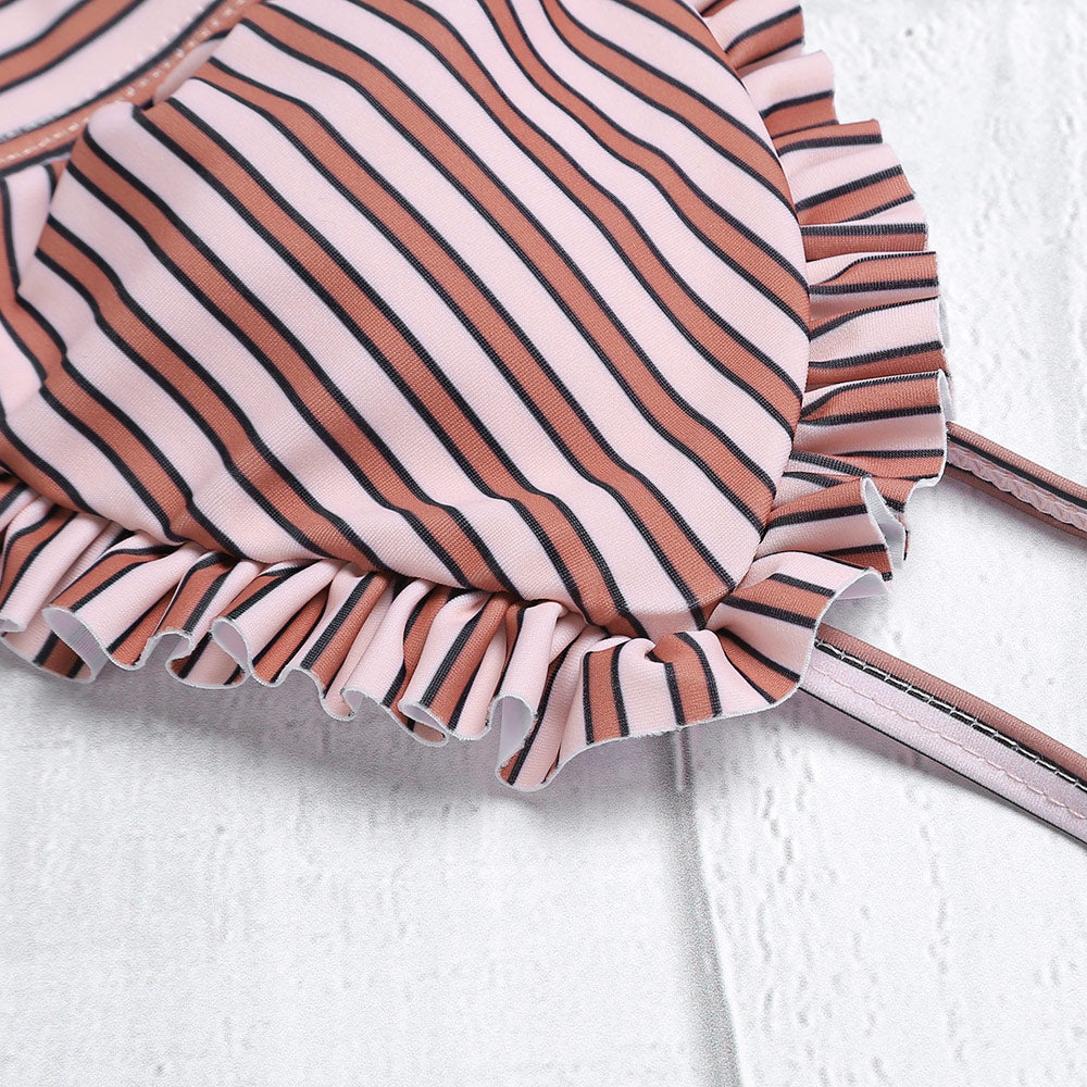 Sexy Spaghetti Strap Padded Stripe Ruffle Women Bikini Set