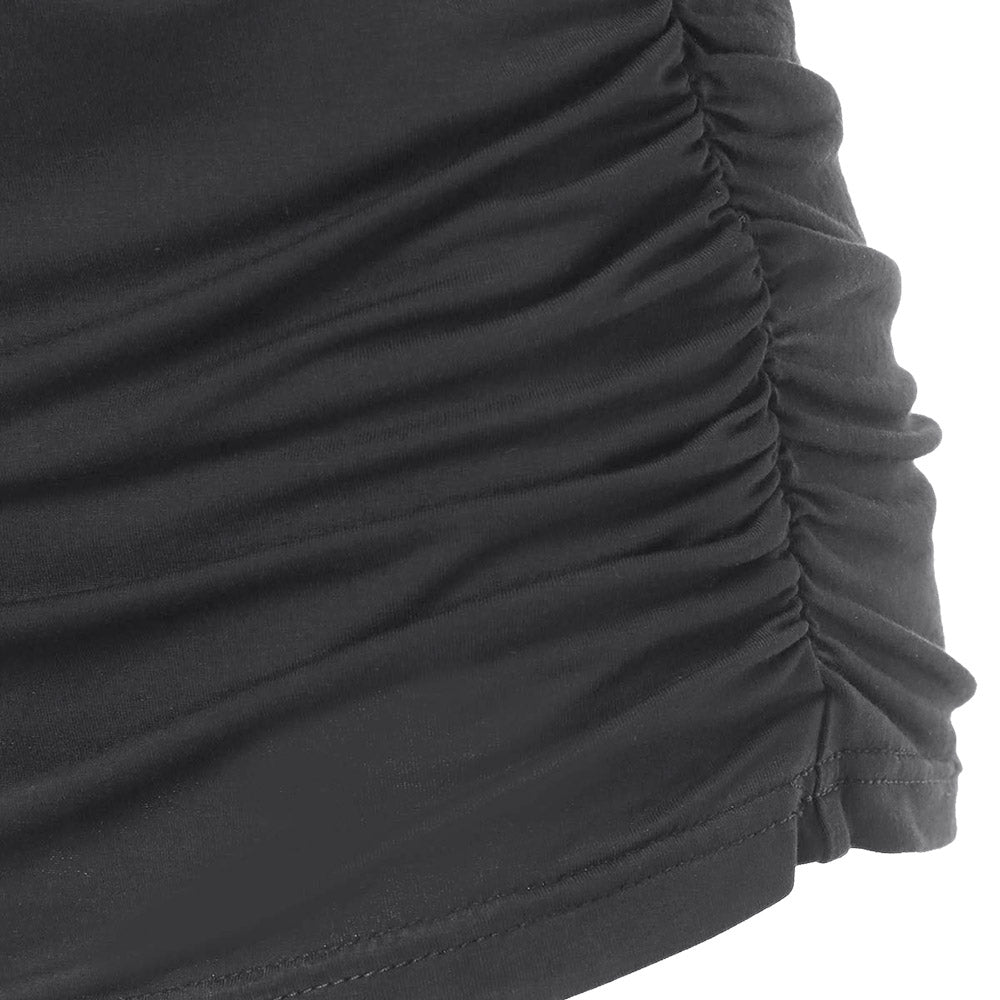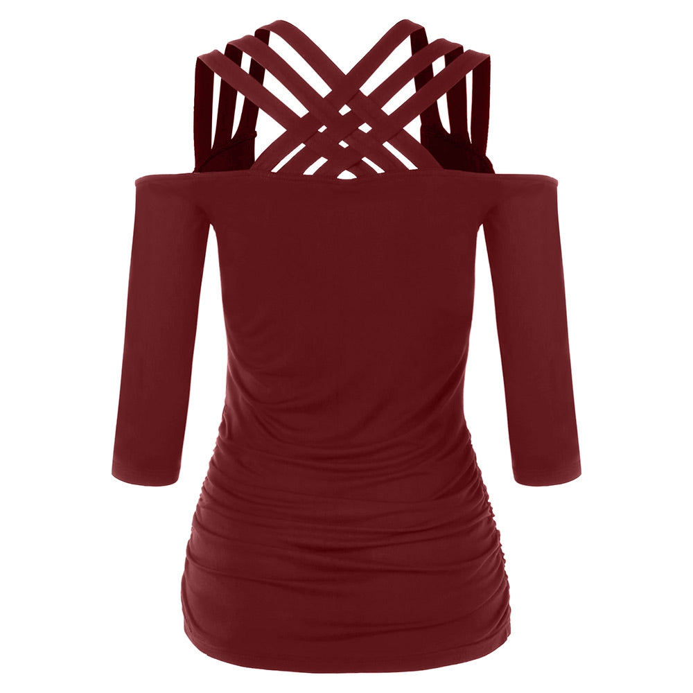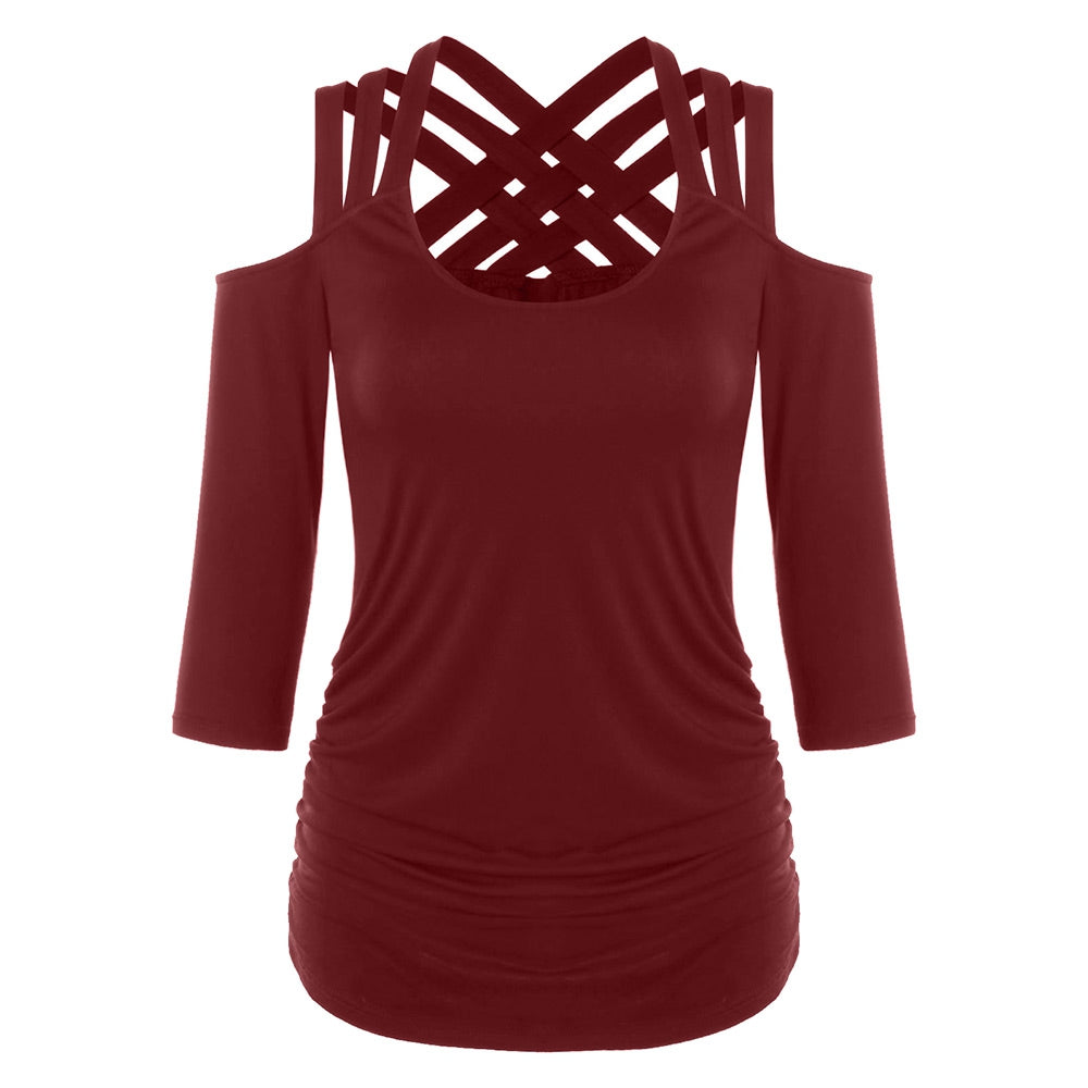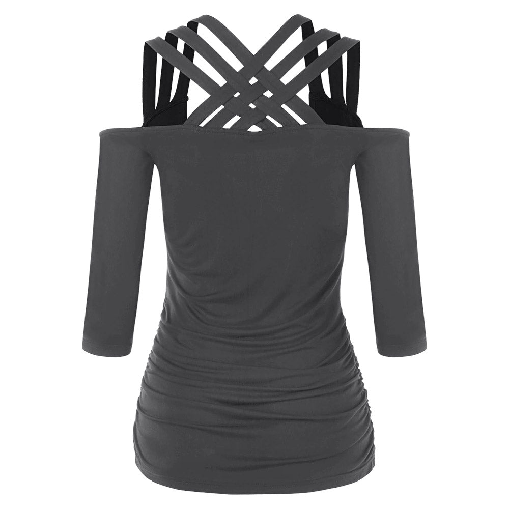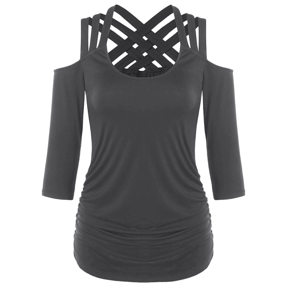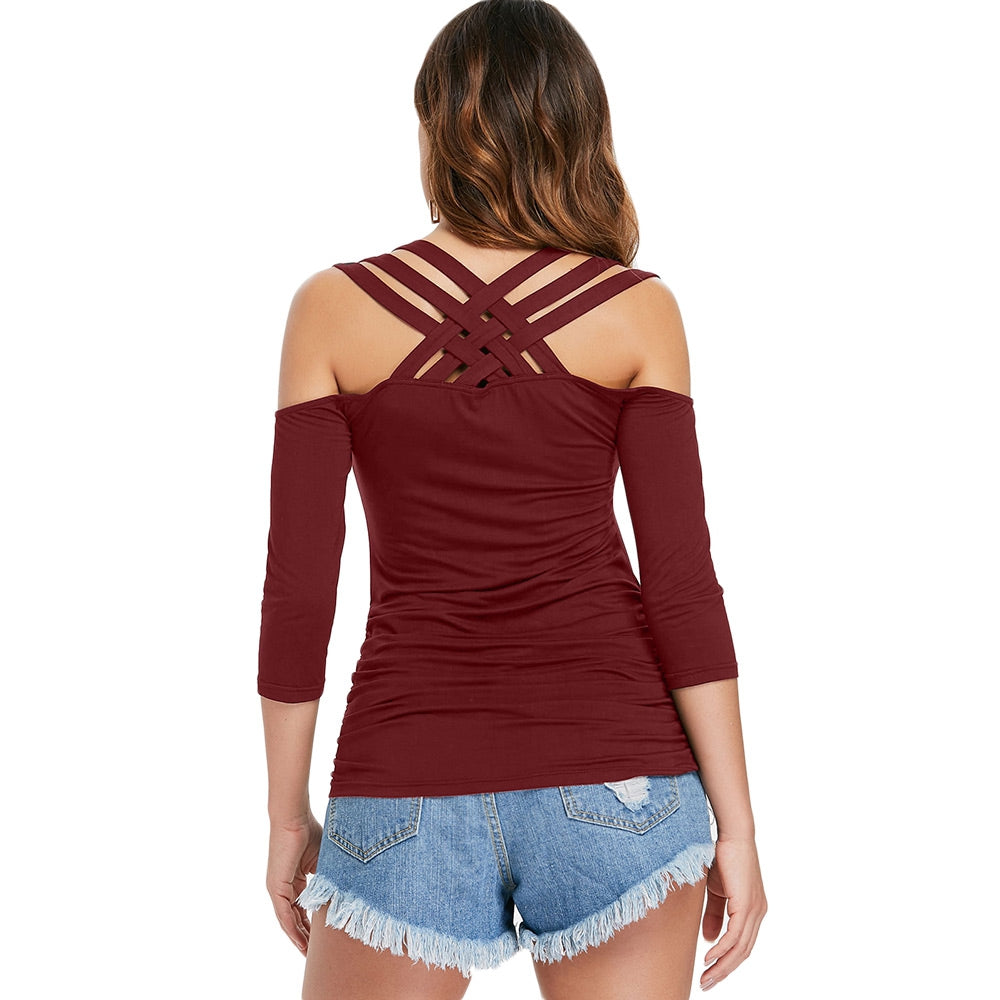 This fashionable T-shirt features simple black tone, the strappy design which looks like a Chinese knot to interweave at the back, cut out sleeve to expose the shoulder for cool, and ruched side layout. Fitted silhouette.