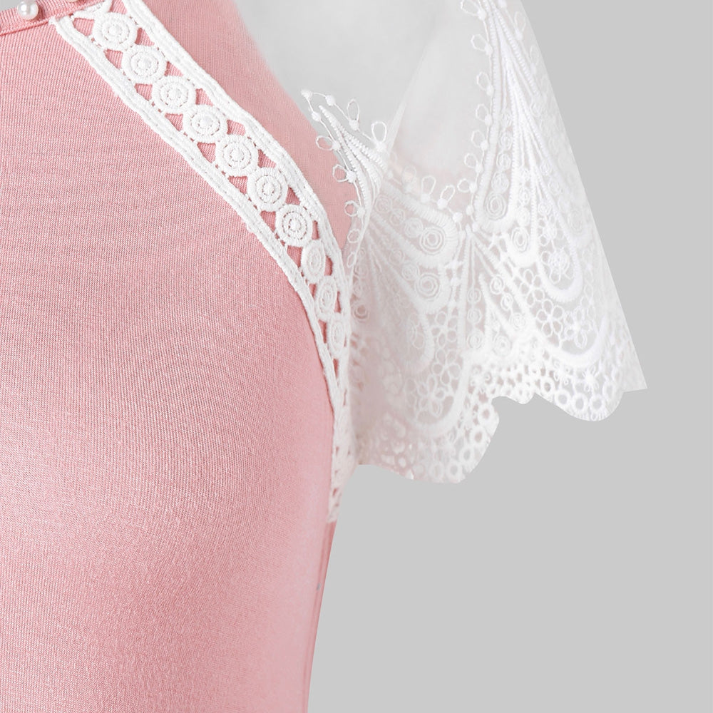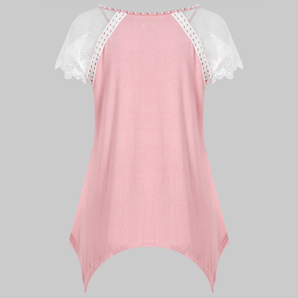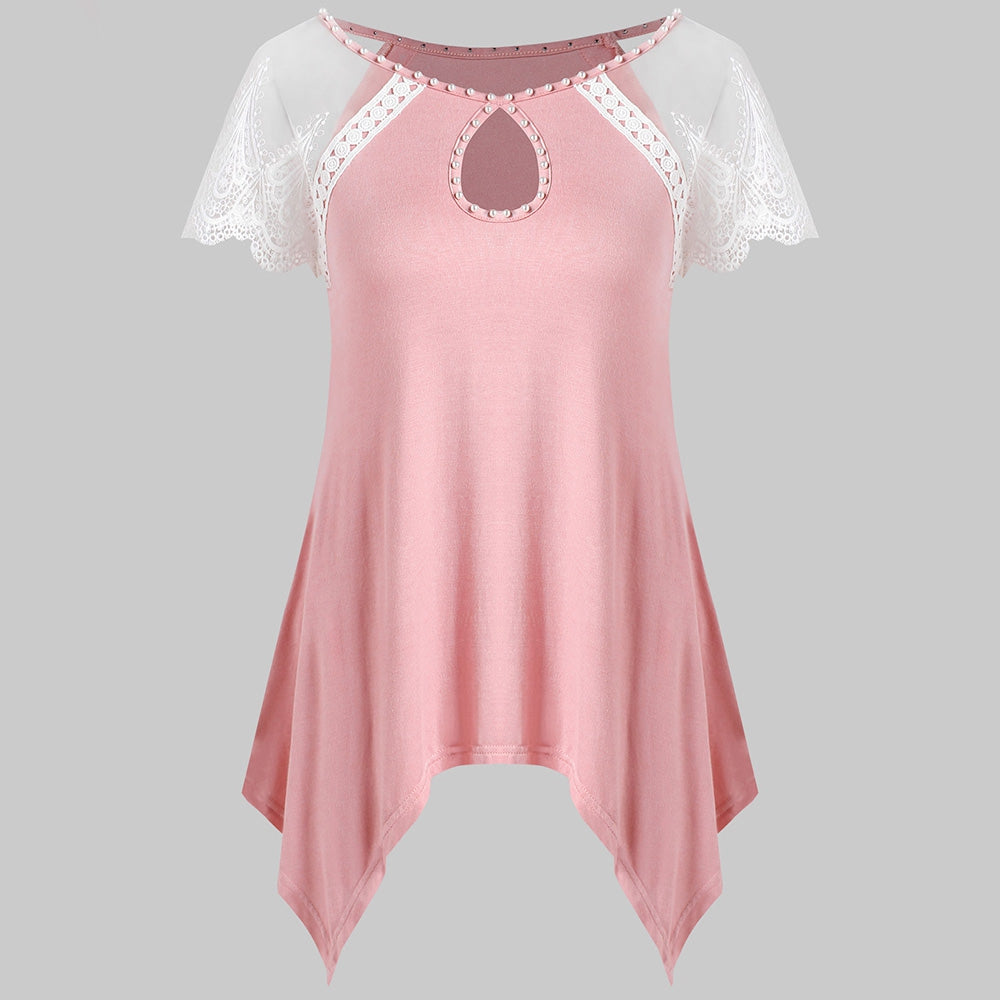 Take your fashion with this tunic t-shirt in soft material. It features a keyhole neck that is embellished with beads which are elegant and feminine, sheer lace on the shoulder, and a trendy handkerchief hemline which makes it quite figure flattering and gives it a very feminine drape.