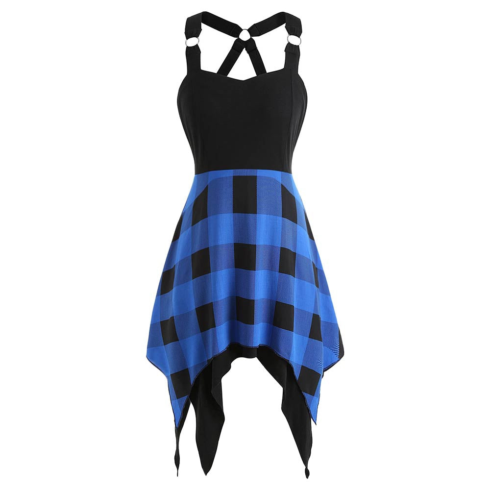 A chic handkerchief hem dress is back to classic vintage style. Featuring a sweetheart neckline with wide shoulder straps, criss-cross and O-ring design connected. Retro tartan print splicing for an eye-catching. This dress is a perfect addition to your summer, formal, retro wardrobe!