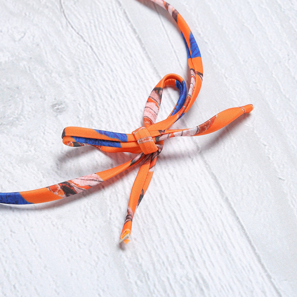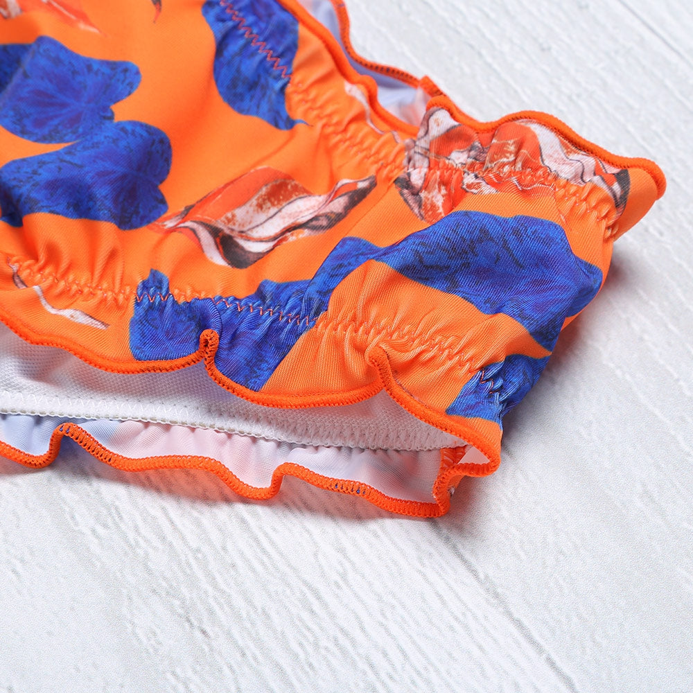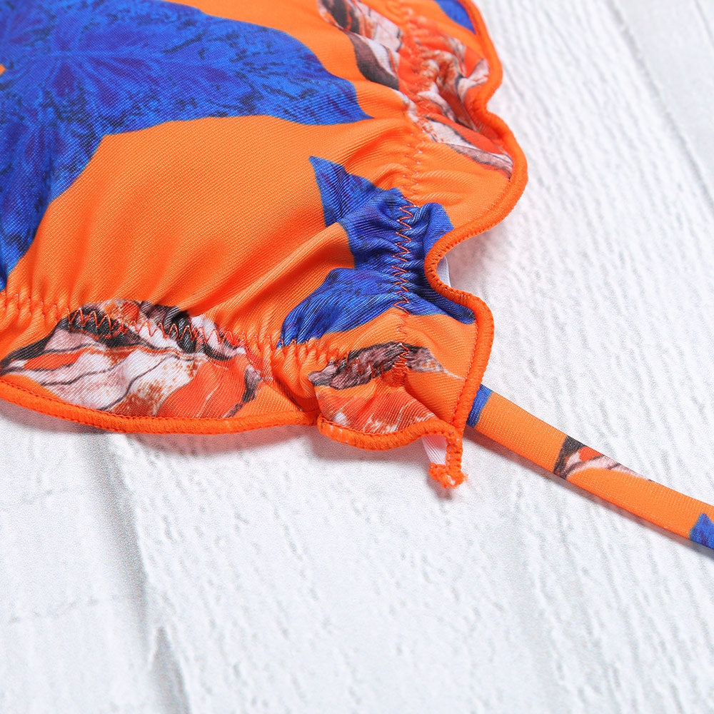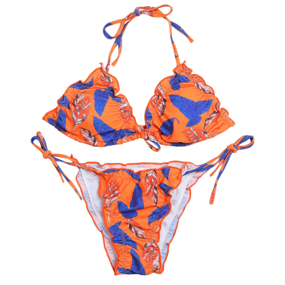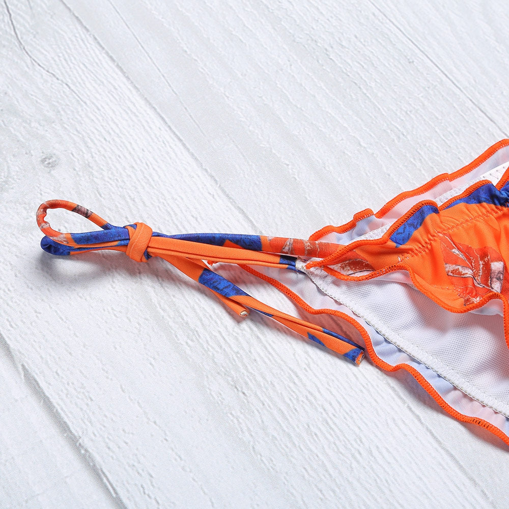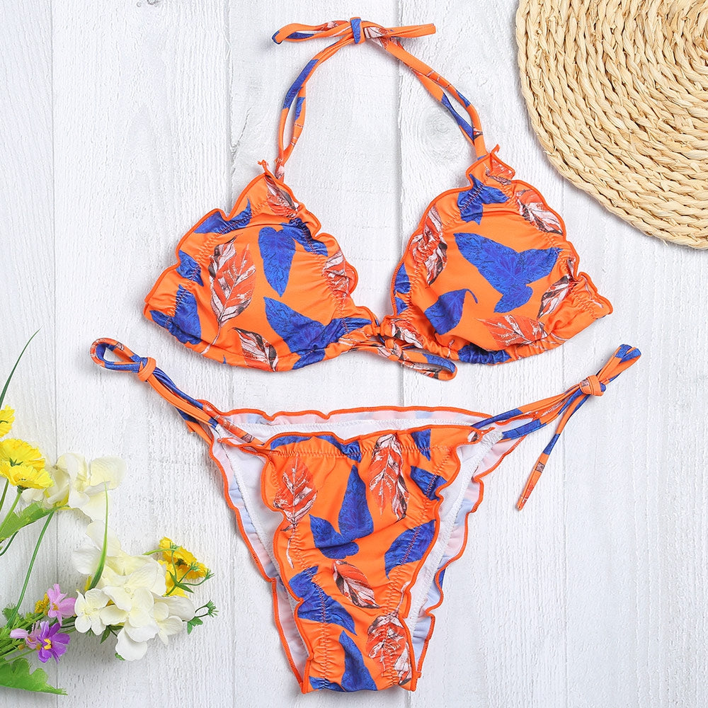 Women Sexy Tied Strap Backless Lady Swimwear Flouncing Leaf Print Bikini Set
