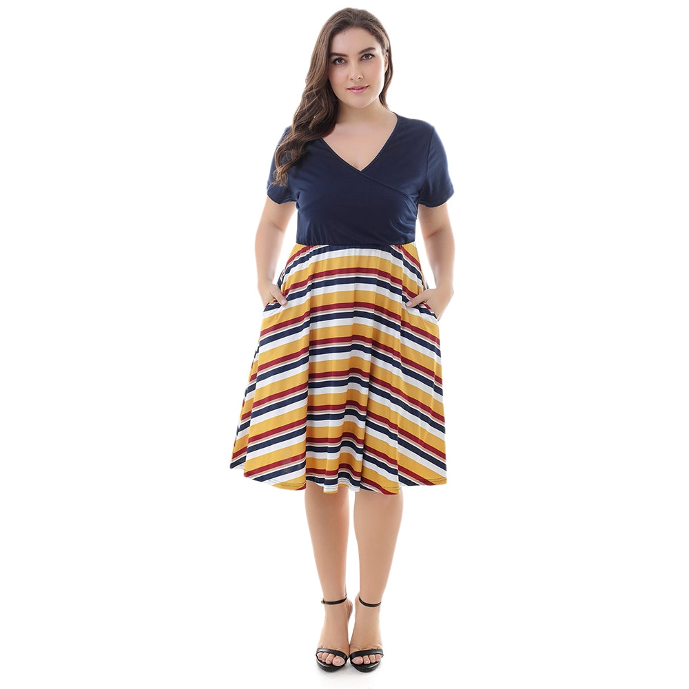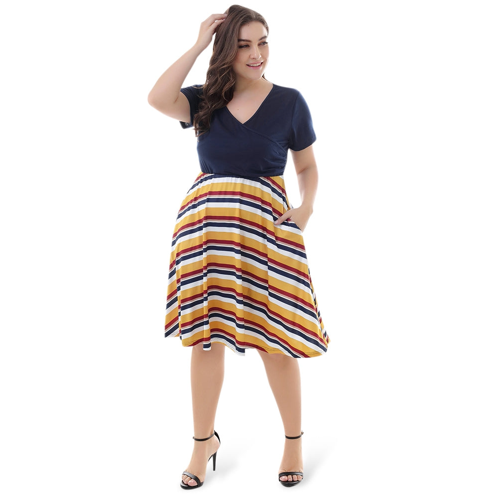 Plunge Neck Short Sleeve Plaid Stripe Plus Size A-line Women Dress