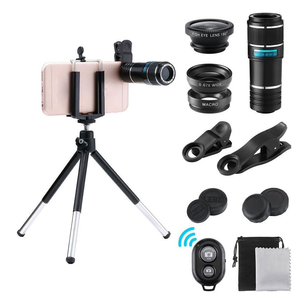 Package Contents: 1 x 12x Telephoto Lens,1 x Fish Eye Lens,1 x 2in1 Lens(Wide Angle + Macro Lens),1 x Bluetooth Remote Control,1 x Mini Tripod,1 x Small Pouch,1 x Phone Clip,2 x Lens Clip,1 x Lens Cloth