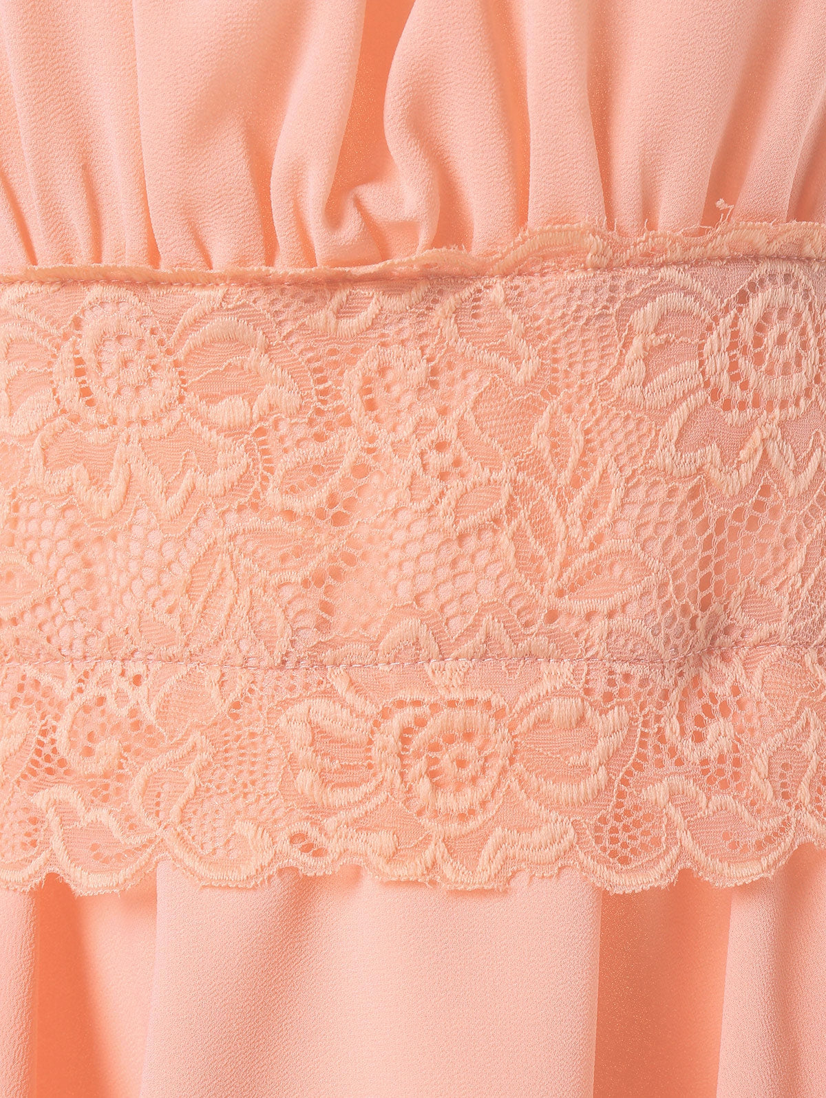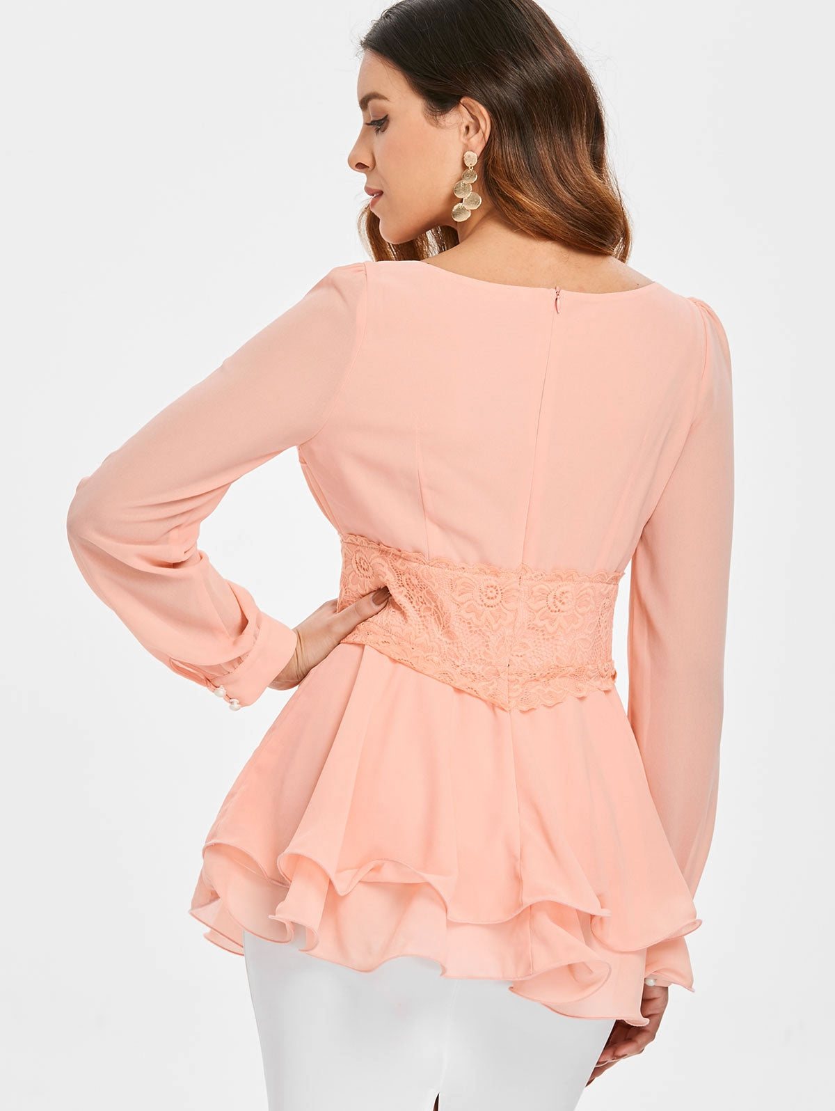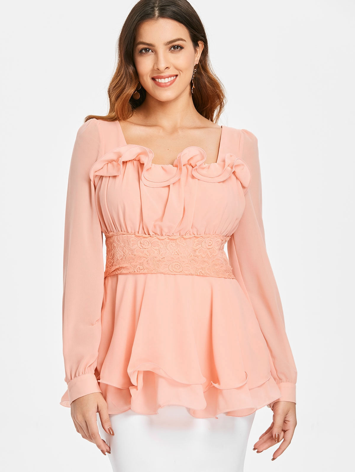 This modern blouse in sweet light pink with cute ruffled trimming features a square neck, long sleeves with two-button closure cuffs and pretty zip up fastening, as well as an alluring layered design. The lace insert detail at waist creates a peplum vision, which adds charm and fashion.