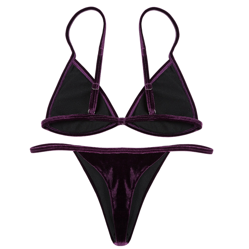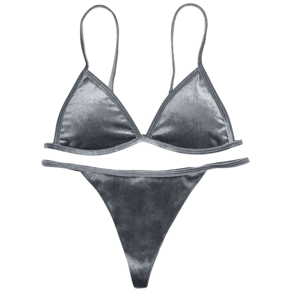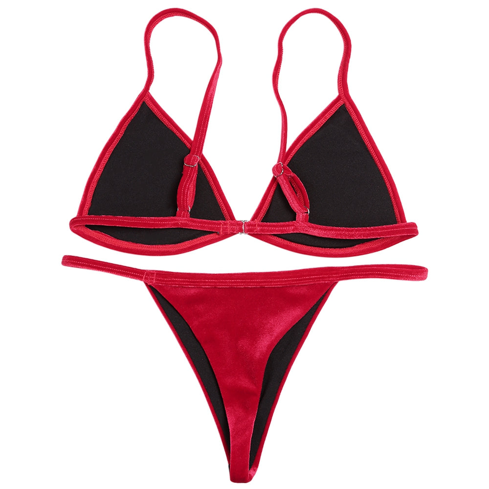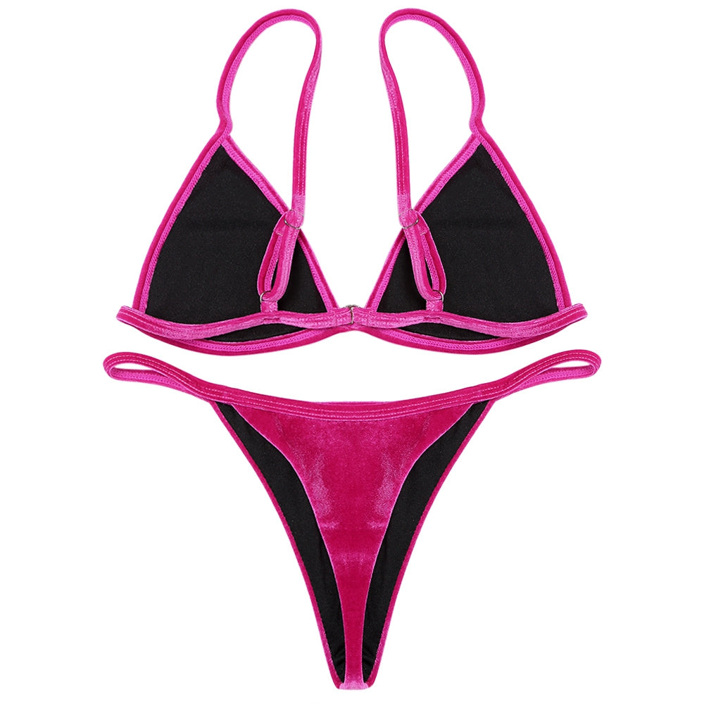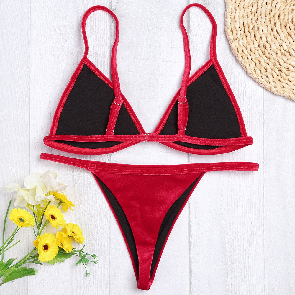 Spaghetti Strap Padded Backless Low Waist Velour Women Bikini Set