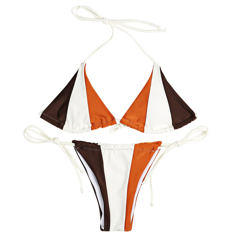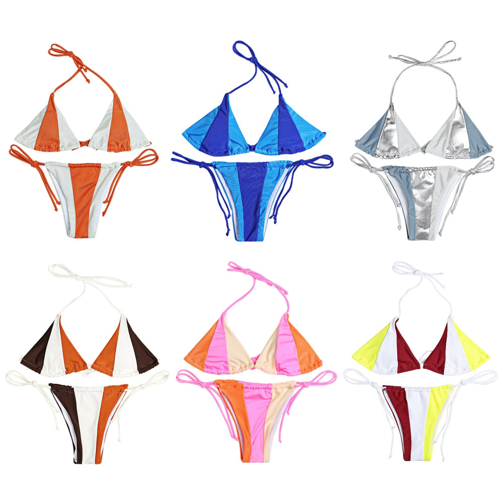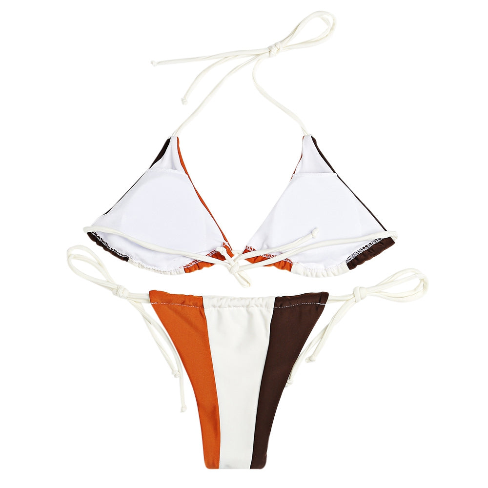 Halter Neck Backless Padded Color Blocking Low Waist Women Bikini Set
