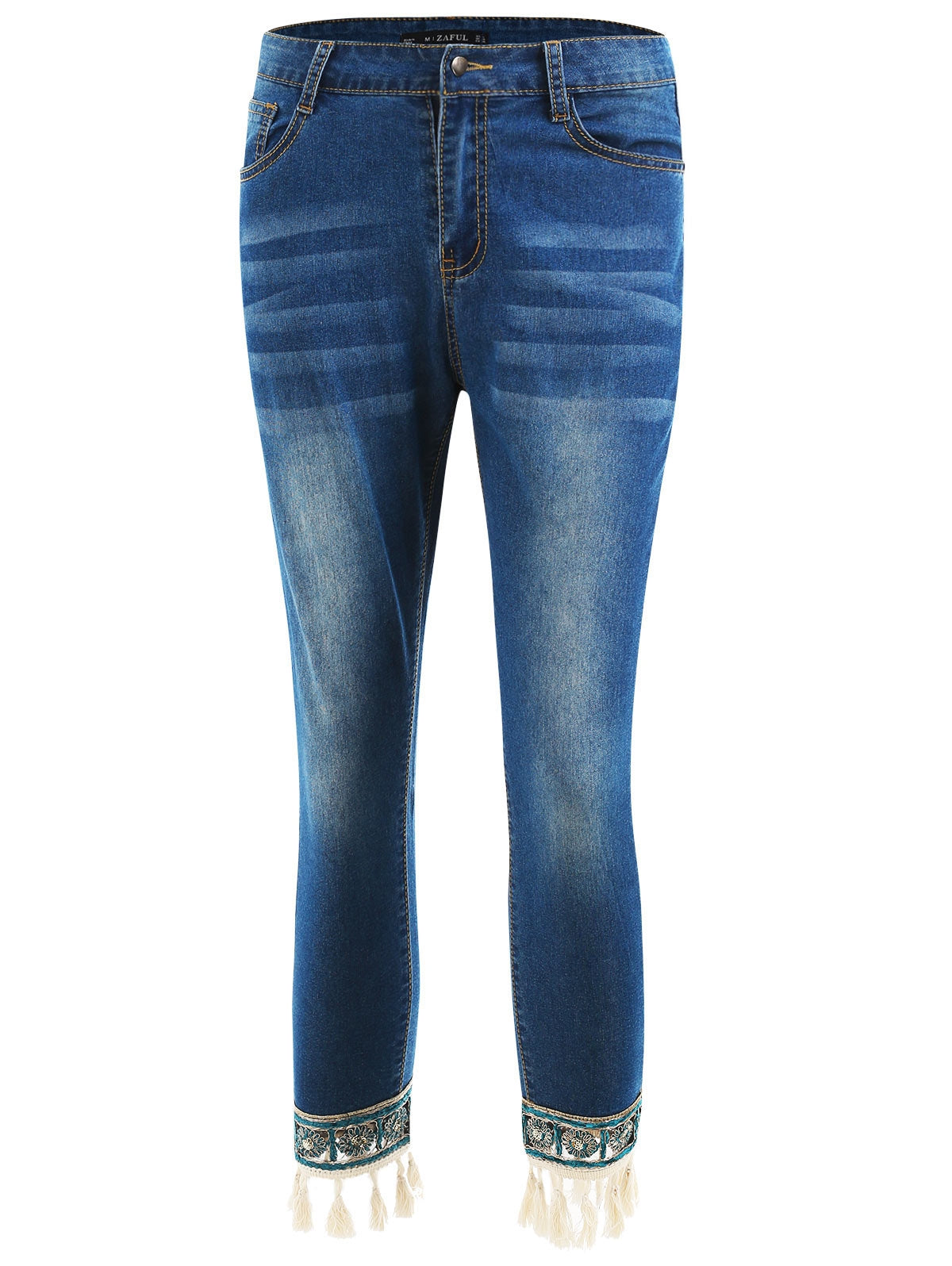 Must-have tassel hem jeans that become an exclusive piece of the season. Tassel jean is a fabulous choice for stylish women. Mid-rise, ankle-cropped jeans adorned embroidered and tassel dangle down at the ends. Easy to pair with tee or blouse.