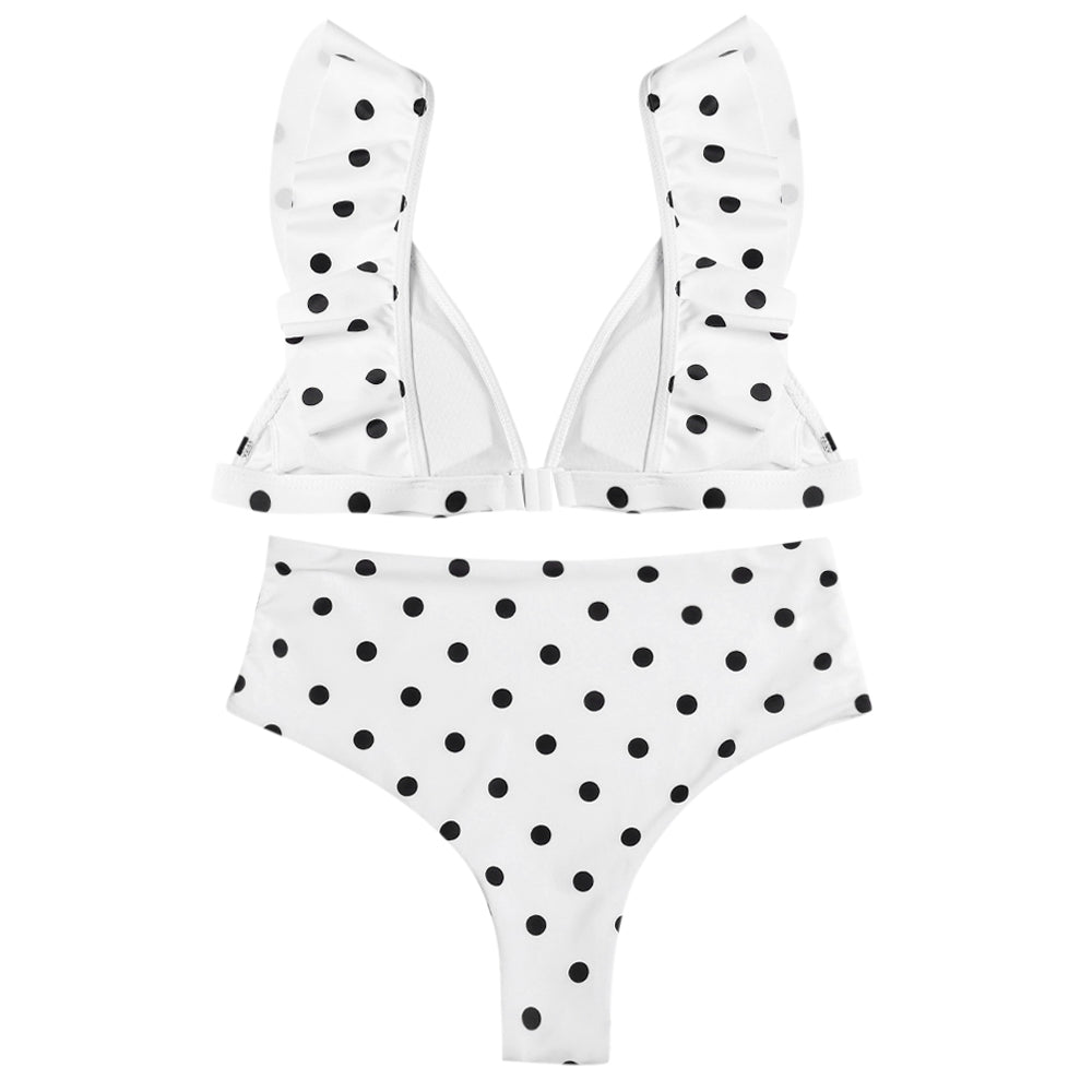 Plunge Neck Backless Padded Flounce Polka Dot High Waist Women Bikini Set