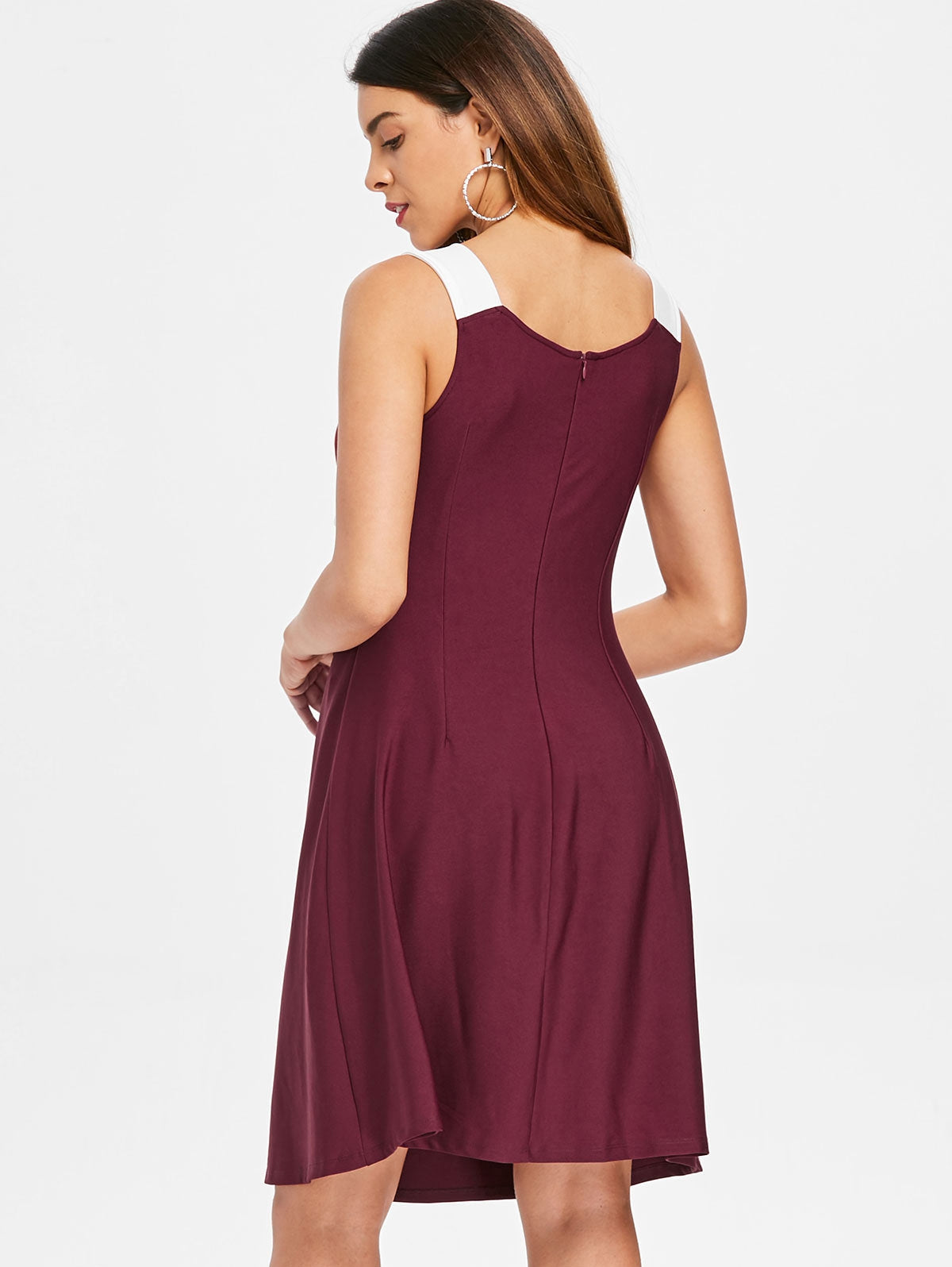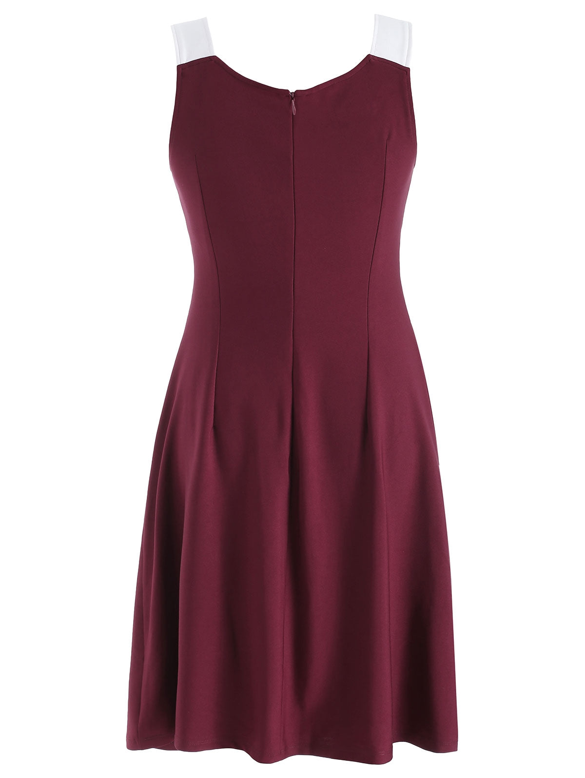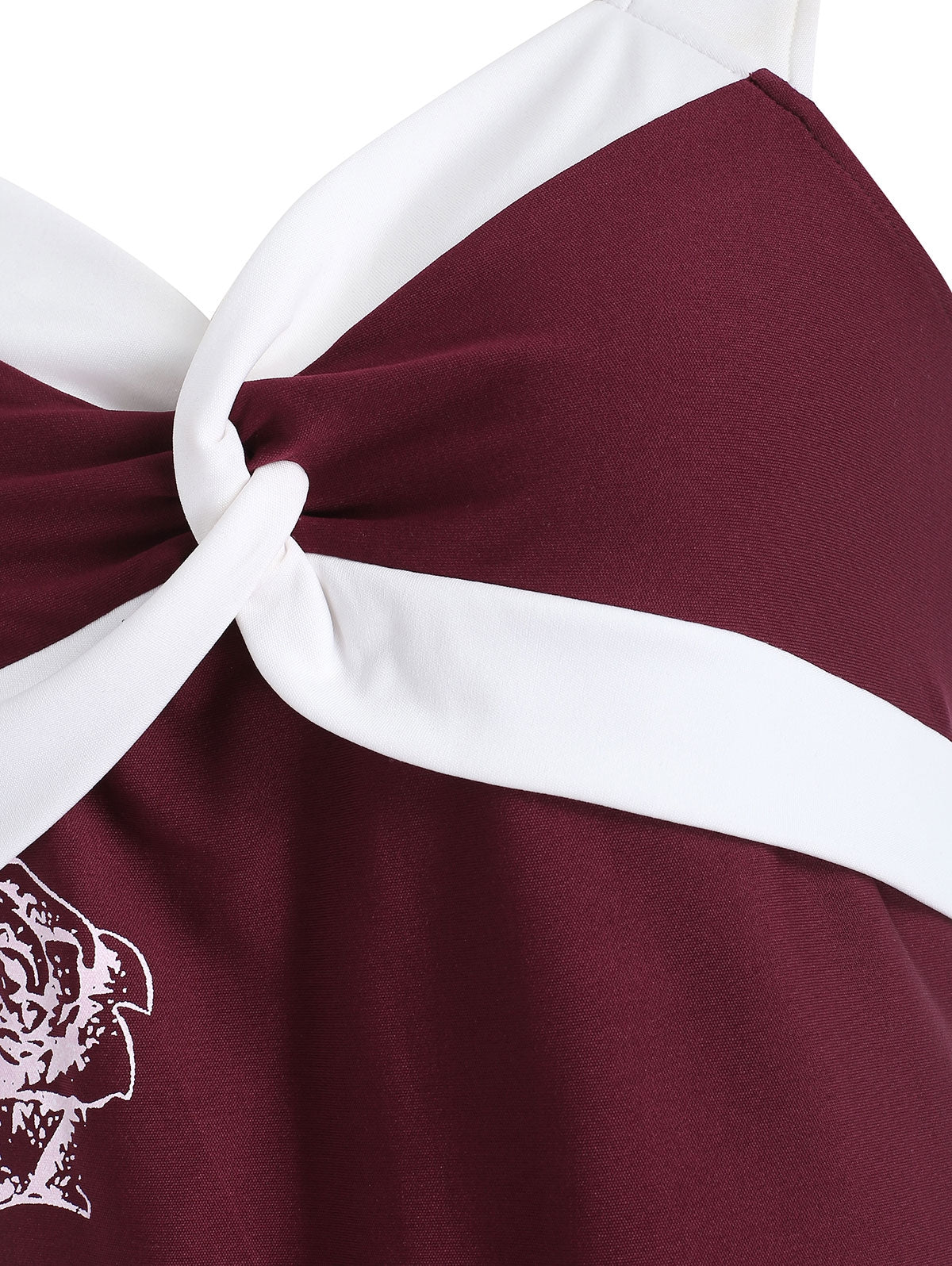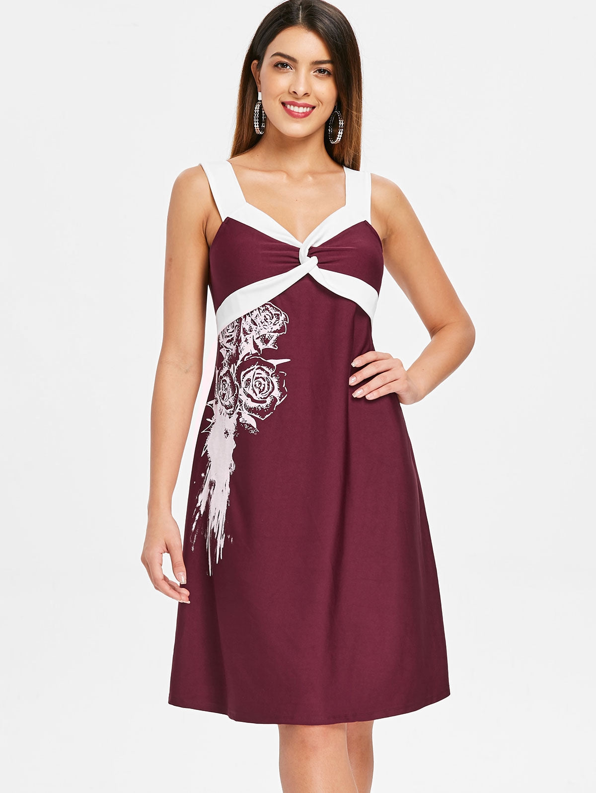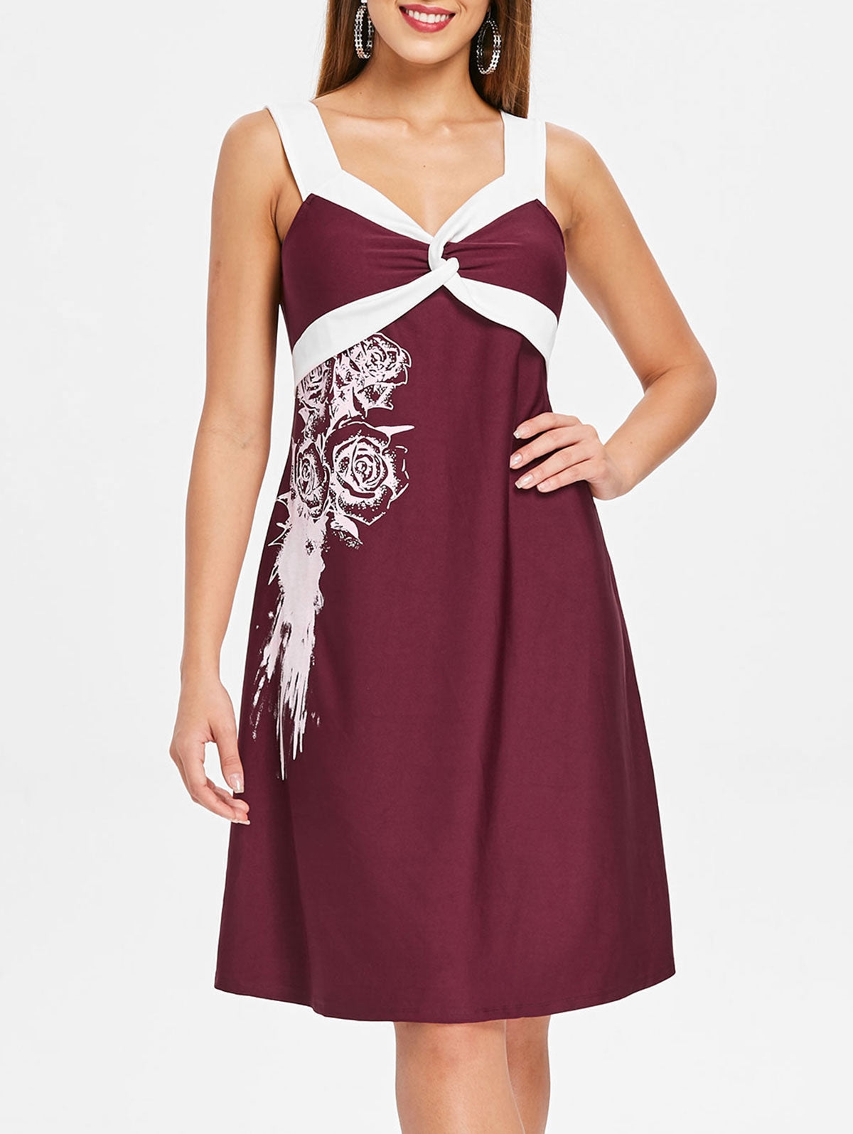 Bring a fun twist to your evening wardrobe with this two-tone dress. In a sleeveless silhouette, the dress features novelty twist front detailing, pretty rose pattern on the front and comfy knee length cut. Invisible zipper on the back. Paired with heeled sandals to lift the look.