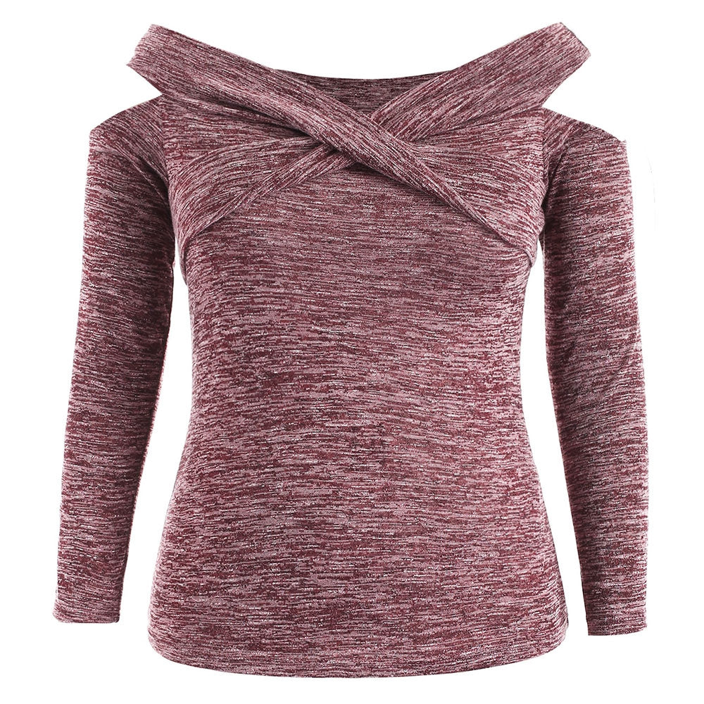 A soft marled knit defines a body-conscious T-shirt perfect for everyday wear, featuring tight long sleeves with alluring cutouts and foldover off-the-shoulder neckline that twists on the front for unexpected elegant charm.